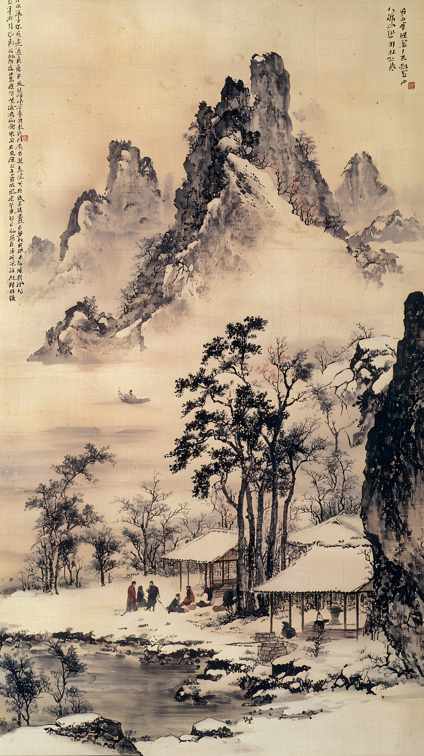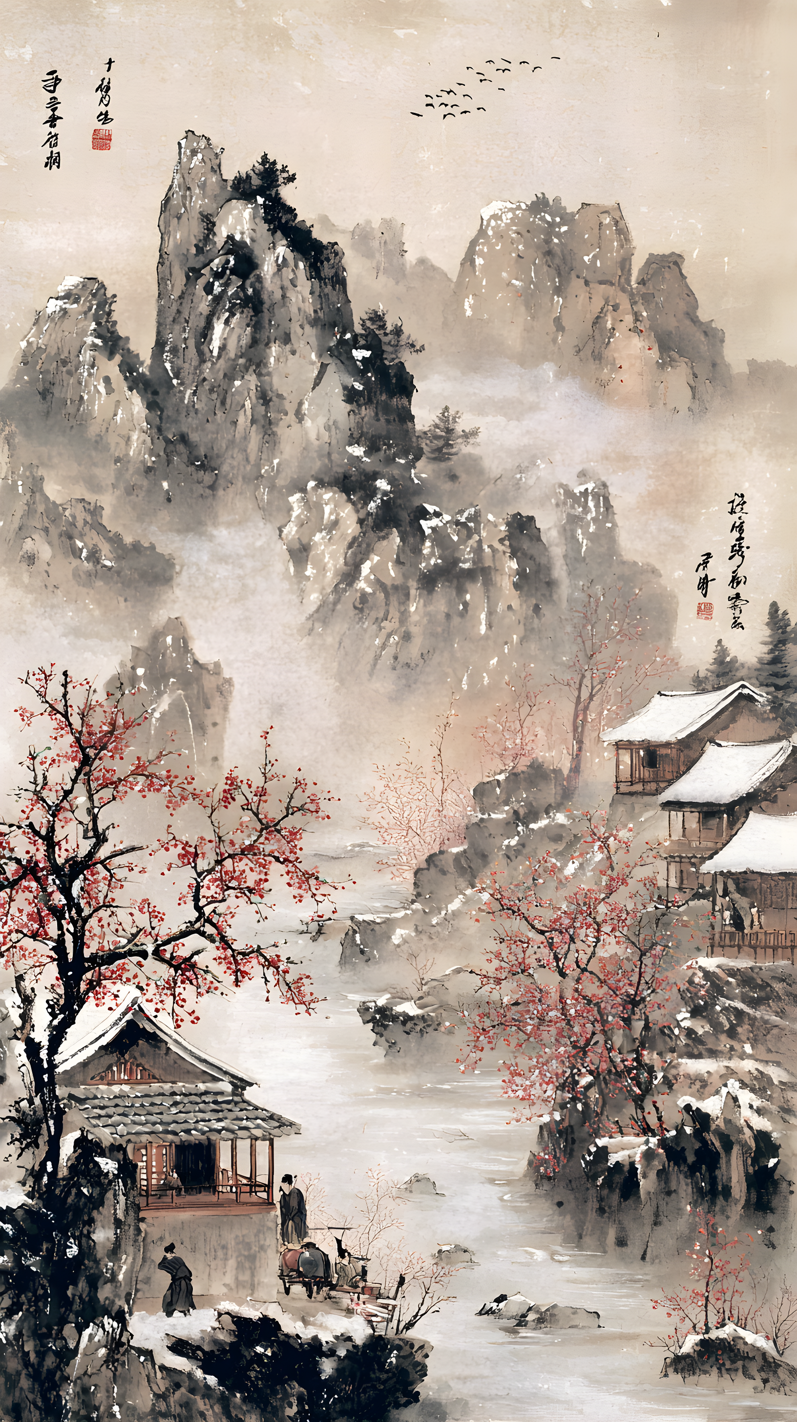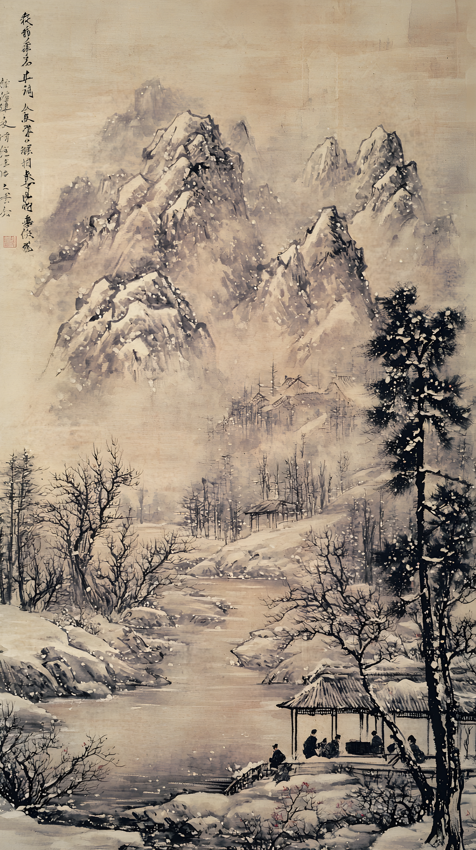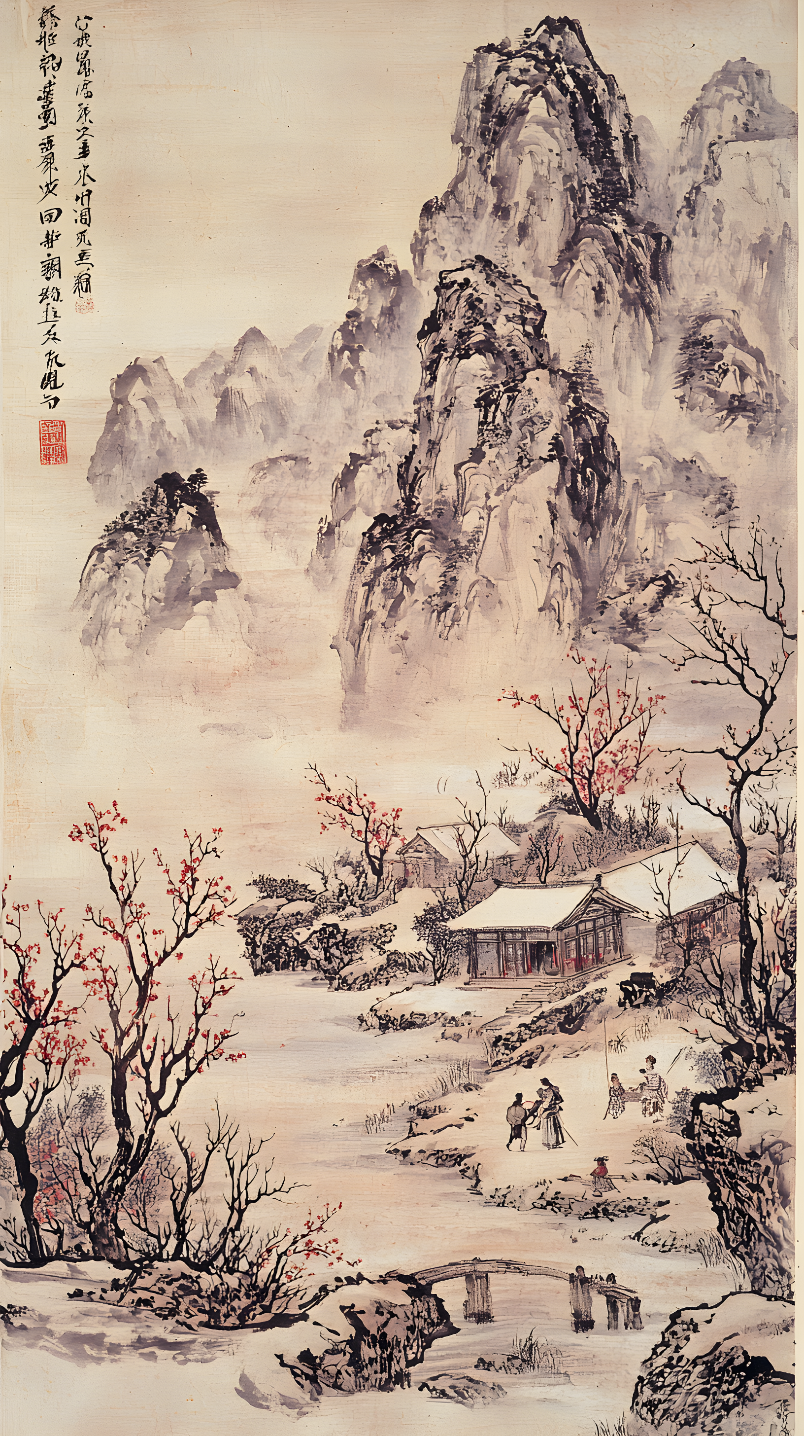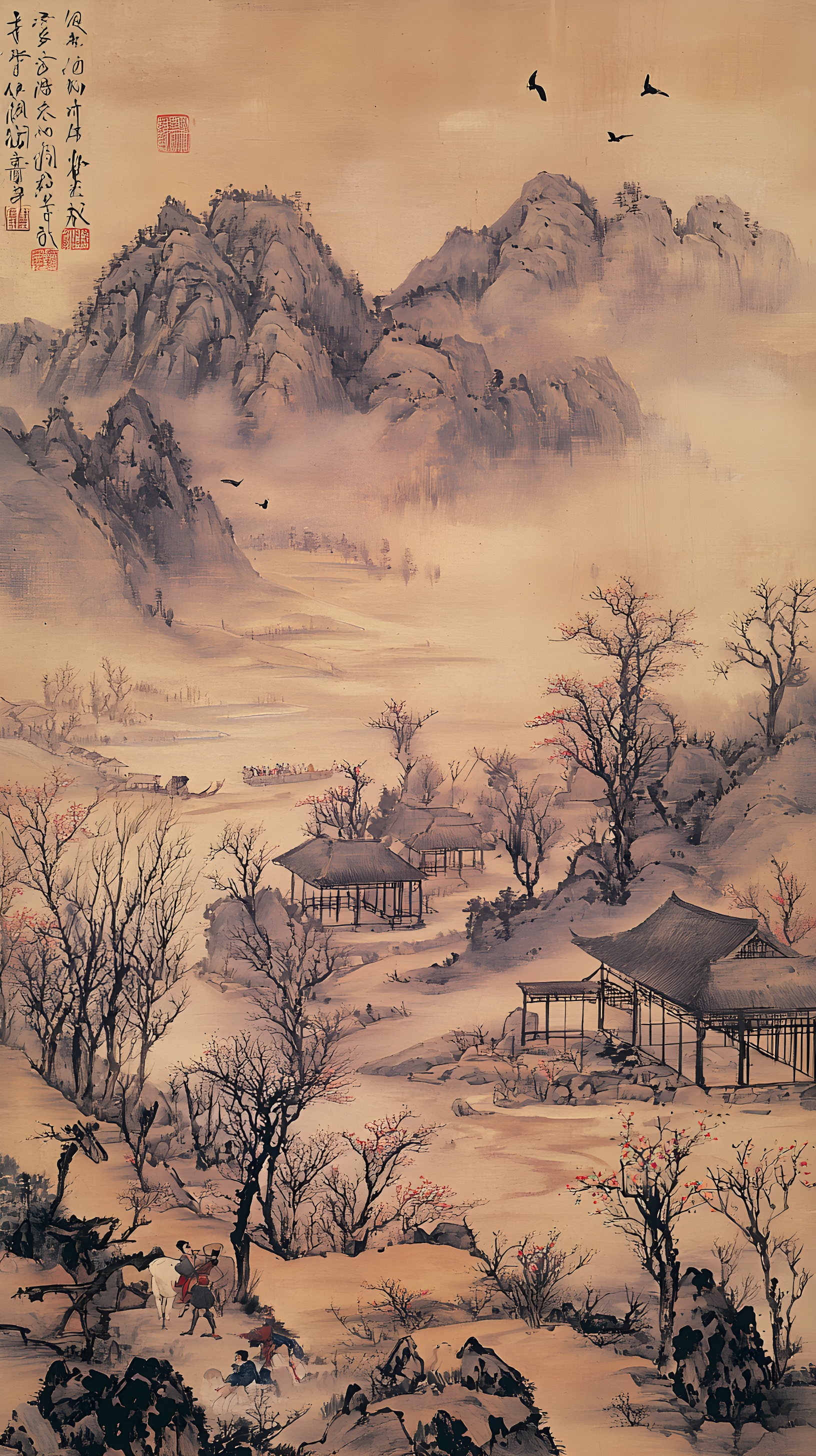 近景中,红梅花开、红梅花上积满了雪花,文人逸士与家仆骑马郊游,在松林间策马扬鞭,结伴郊游的场景,茅屋里穿插有序,松树下有两个文士策马而行,结伴到郊外游玩,一边挥鞭纵马,一边高声吟诗,追逐山林间的走兽;疲惫时就在树下小憩,把盏饮酒,谈经论道,笑着招呼林间的飞鸟前来同饮。