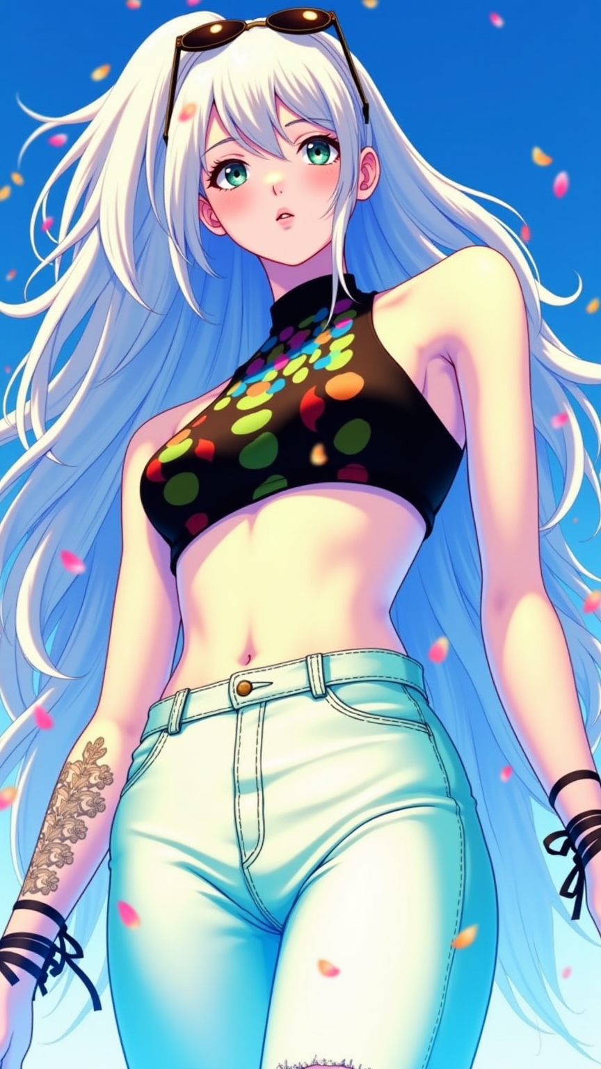 超现实摄影风格,年轻女性背影,冷白皮,黑色长发渐变蓝紫色挑染,彩色抽象图案露脐背心,蓝色紧身牛仔裤卷边,黑色红底细跟高跟鞋,手腕黑色飘带,头顶墨镜,白色背景飘落彩色花瓣,写实光影,高精度人体结构,动态发丝,色彩对比强烈。九头身,肩身比1.8:1,腰臀比0.6,对腿部进行夸张处理,腿部拉细,身腿比1:2。微微侧脸,余光看向镜头。比例是9:16