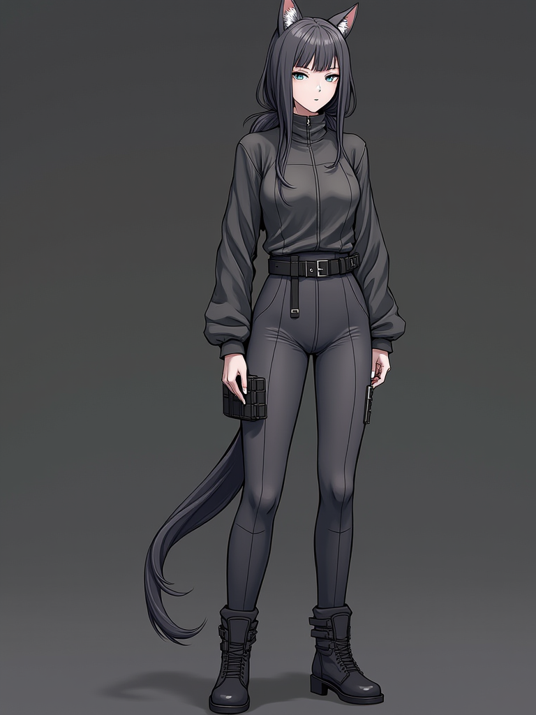 3:4 vertical ratio, full body illustration, flat color art, clean crisp black line art, no gradient, solid color block, 1female, solo, cold royal sister, adult woman, slender tall perfect combat figure, artificial biological weapon No.013, named Jinhe, silver-white vertical cat eyes, no emotion in eyes with faint empty hazy, long matte dark gray hair tied into a neat low ponytail, only a pair of small & delicate dark gray furry beast ears on top of head, no human ears, thin translucent ear tips, cold pale porcelain skin, no scars, minimalist dark gray tactical tight battle suit, simple combat boots, hands with pale gray translucent nails, calm standing posture, sharp and cold aura, faint sense of loneliness, plain dark gray simple background, high precision, character details 100% restore, flat illustration style