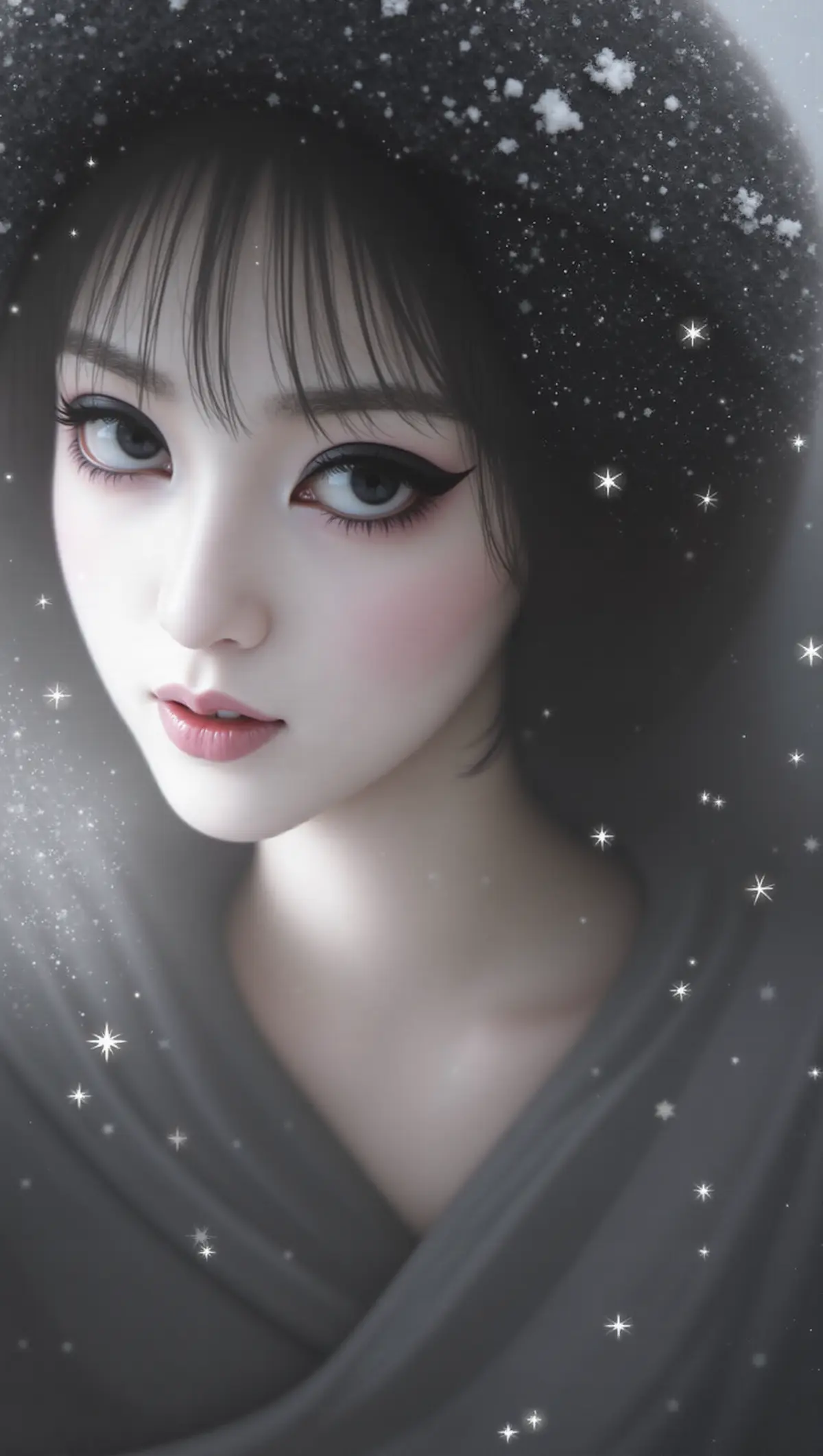 韩式浓妆,眼线,精修妆容,吹弹可破的皮肤,美颜瘦脸,皮肤雪白,面部正面对着镜头,眼神朦胧,迷人,黑色厚风衣+粗针织黑围巾,雪花点缀,面部与围巾细节,头发覆雪,围巾积雪清晰,眼神具有故事感,光影柔和,整体为清冷孤寂的冬日大雪场景,冷灰调,细腻雪花飘落,cinematic 质感。