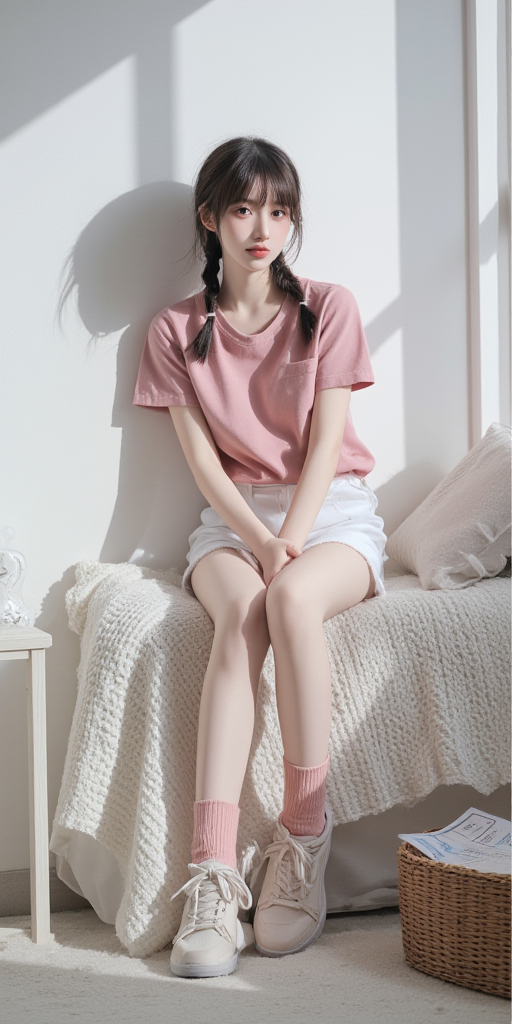 双麻花辫的年轻东亚少女,大约18岁左右,蹲坐窗边,粉色短袖上衣搭配白色短裤,性感大长腿,粉色袜子配白鞋。双腿屈膝并拢,大腿肌肤白皙饱满,膝盖线条圆润,小腿纤细紧致,脚踝被鞋袜包裹,腿部比例协调,整体姿态娇俏,肌肤质感通透自然。大腿线条饱满流畅,腿部肌肤在自然光下泛着莹润光泽,整体造型清新又少女。全身照片,竖版构图,图中人物比列占满了整个空间