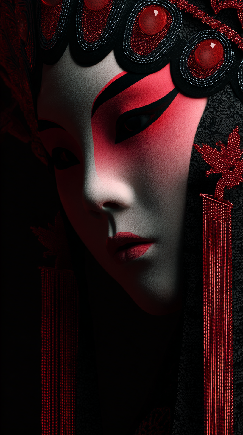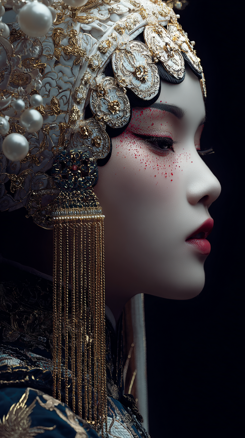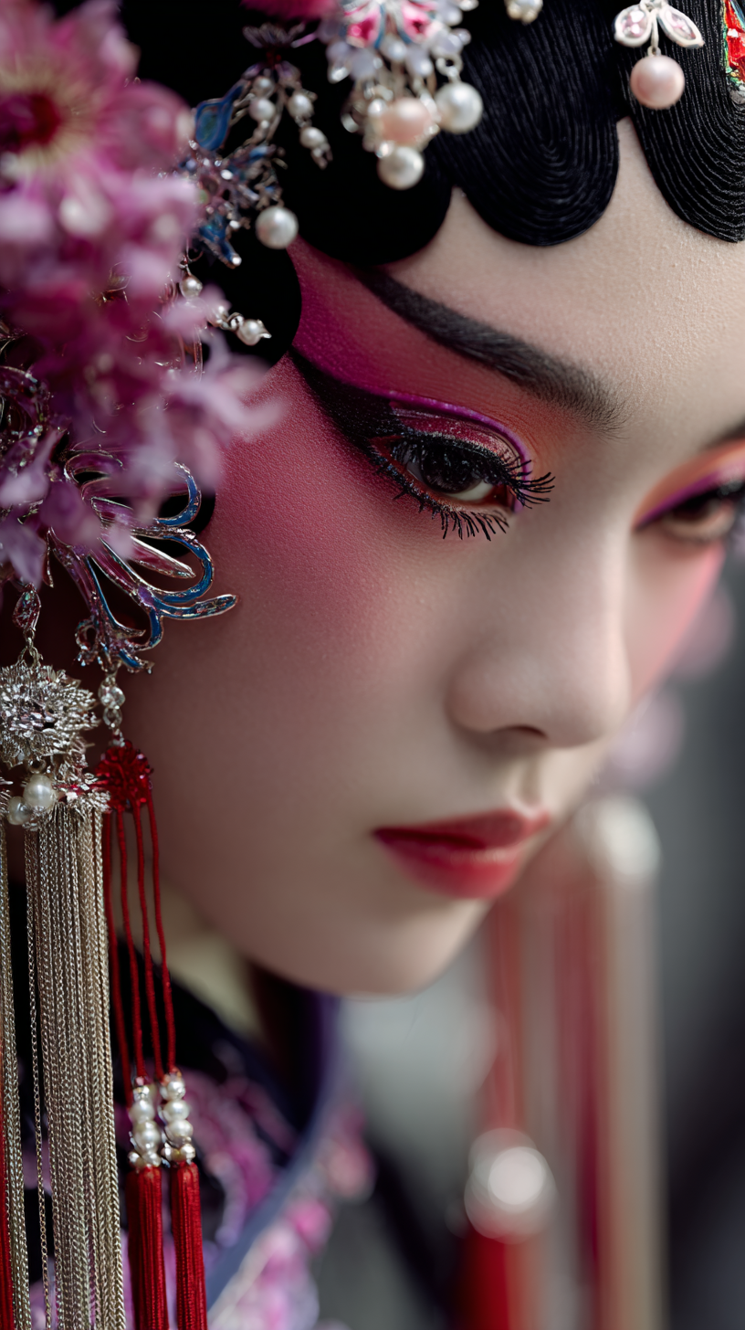 花旦妆容参考了戏曲旦角「上妆、贴片子、梳大头」的经典步骤(来源6),但突破传统舞台用色,将桃红花钿、渐变腮红等元素进行低饱和处理,与富士负片颗粒形成现代碰撞。
