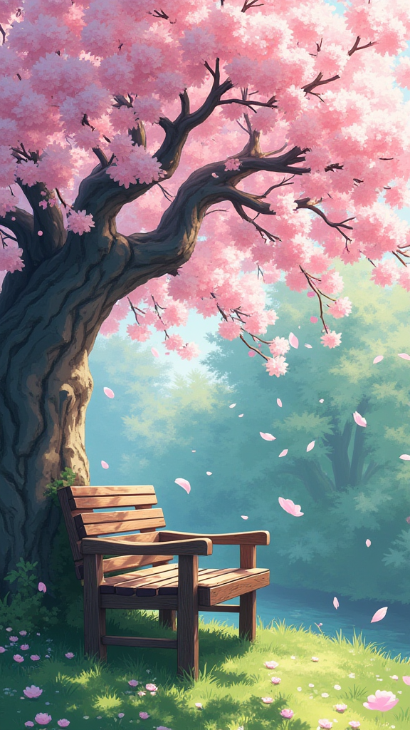 masterpiece, best quality, anime style, a wooden bench under a cherry blossom tree, dappled sunlight through petals, gentle breeze, falling cherry blossoms, soft color palette, realistic light and shadow, serene atmosphere, 8k, ultra-detailed, --ar 9:16 --style raw(MJ)