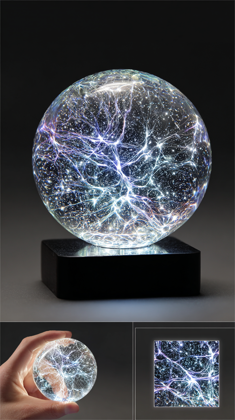 the product is an led starry ball lamp, which glows with silver and rainbow light inside the sphere. it has clear details on both sides of it, with a black background, a flat viewing angle, and can be held in one hand. the photographic style uses soft lighting to highlight the crystal texture and sparkling effects. in the bottom right corner, there is another small square picture of the same object, which creates a visual contrast. this high definition product advertisement showcases exquisite craftsmanship and intricate patterns.