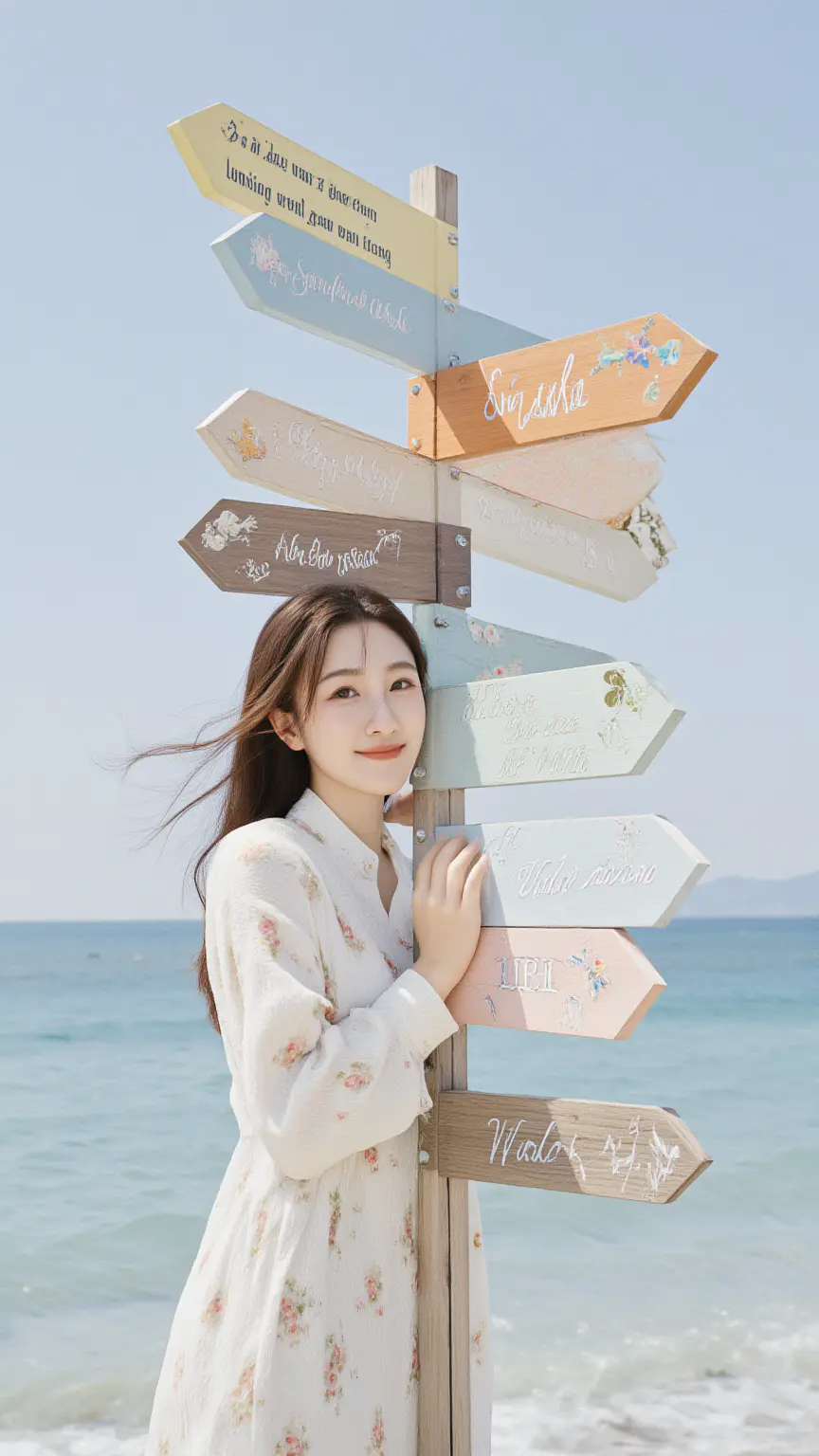 环境人像摄影,8K,高清,美丽女子,长发随风微扬灵动飘逸,面容甜美姣好,眼含恬淡笑意望向镜头,身穿森系飘逸的裙,站在海边木质路牌旁,右手轻扶路牌杆,左手自然垂在身侧,路牌由8块箭头形木牌叠加组成,颜色依次是明黄、暖橙、深棕、天蓝、浅蓝绿色,淡粉色、浅木色,每块木牌上有不同的文字,文字依次分别是“向任何方向”,“都是走向幸运”,“安康”,“顺遂”,“快乐”,“自由”,“财富”,“如愿”,部分木牌带有花朵、叶子等手绘装饰。每块木牌上的文字字体风格统一为手写感十足的艺术字体,笔画灵动且富有变化。字迹清晰完整,背景是湛蓝的天空与澄澈的大海,整体氛围清新明快,充满海滨度假的悠闲感。高清晰丰富细节,8K分辨率,32k高清,自然柔和明亮光,色彩鲜艳,人物近镜头,人物居中构图美观,高质量。