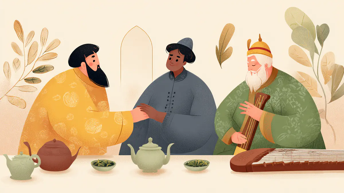 a man in traditional chinese attire and another person wearing traditional kazakh , shaking hands with a uyghur playing the flute beside them. on one side of their table are green tea leaves next to teacups; on the other, there is a musical instrument, the kalimba. the background features soft pastel colors and minimalistic design elements, creating a serene atmosphere for a peaceful exchange between cultural exchange enthusiasts.
