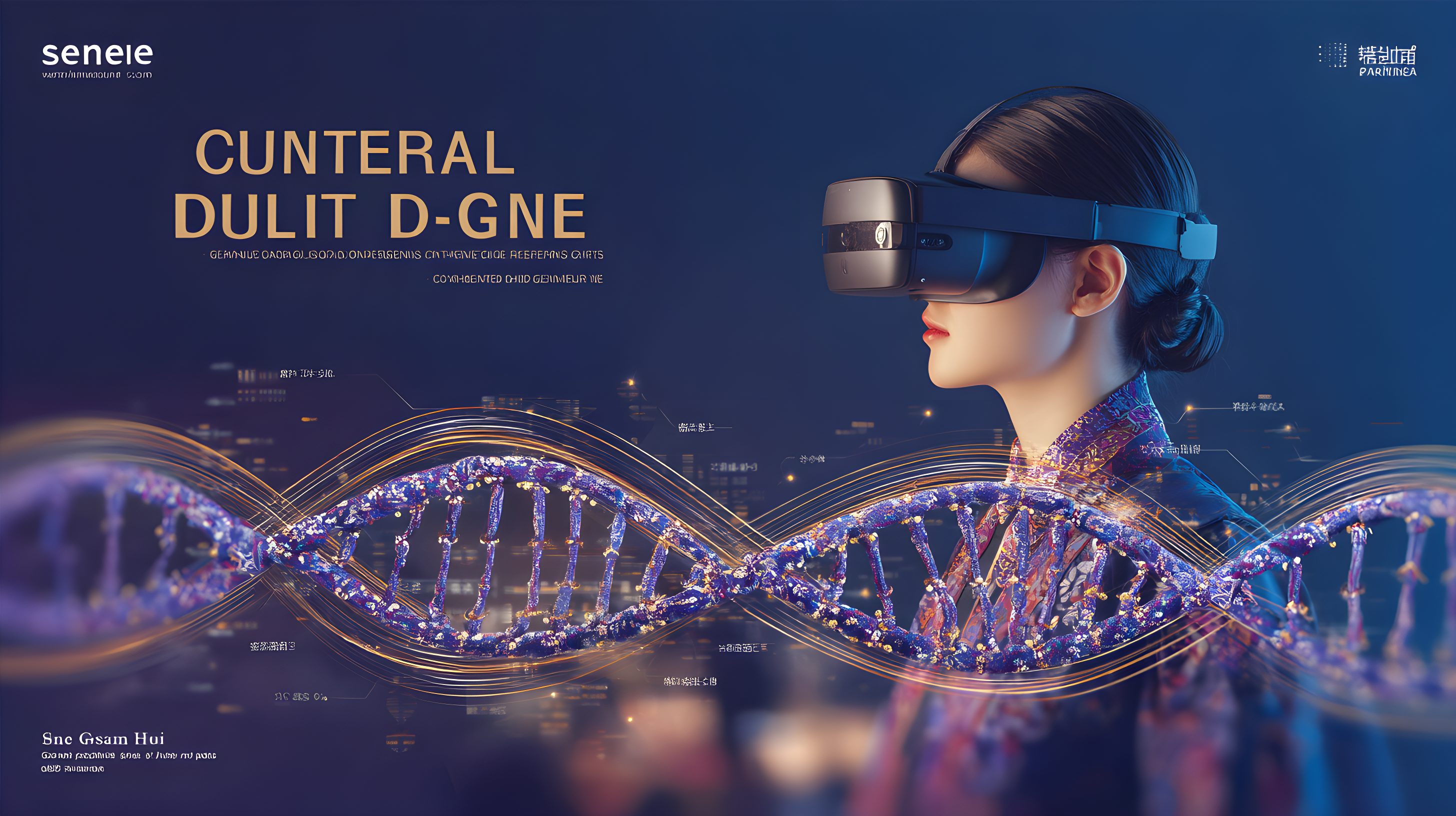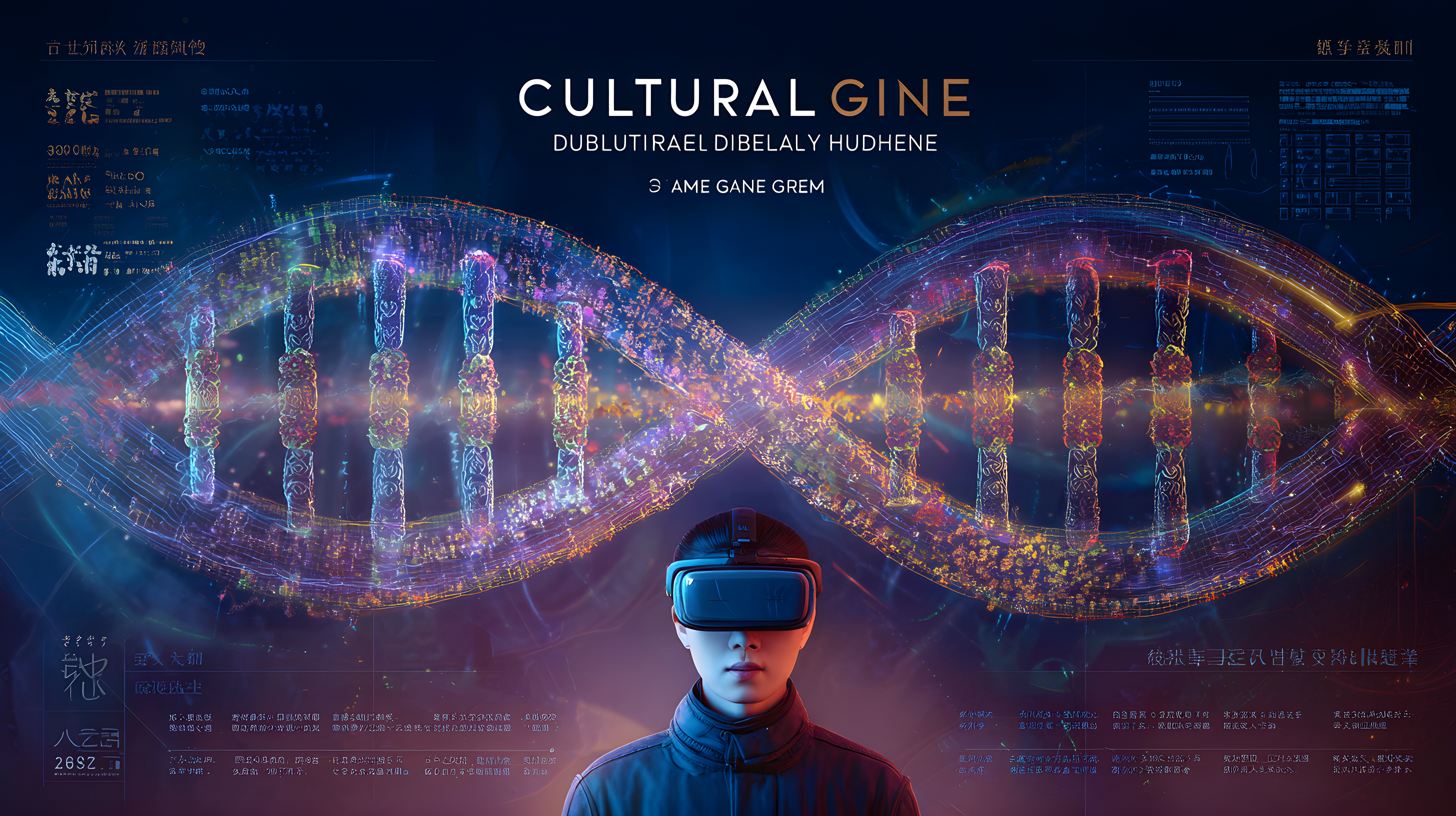 风格为概念艺术与传统文化深度融合的海报设计,以“文化DNA双螺旋”为核心概念的科学艺术海报,画面中央是一个巨大的DNA双螺旋结构,螺旋的两条链分别代表浙江和阿克苏的文化基因。螺旋链上的碱基对由两地的非遗元素组成:浙江的茶叶、青瓷、丝绸、黄酒、珍珠,阿克苏的棉花、刺绣、慕萨莱思等。这些元素在螺旋中相互配对,形成新的文化组合。螺旋周围有数据流和光线环绕,象征着文化的传承与变异。前景有一位戴VR眼镜的年轻学者正在研究这个文化DNA结构。整体采用蓝紫色调,搭配金色的光效,营造出科学与艺术融合的氛围。画面上方有“文化基因”四个现代字体,下方有“同根同源”的副标题。