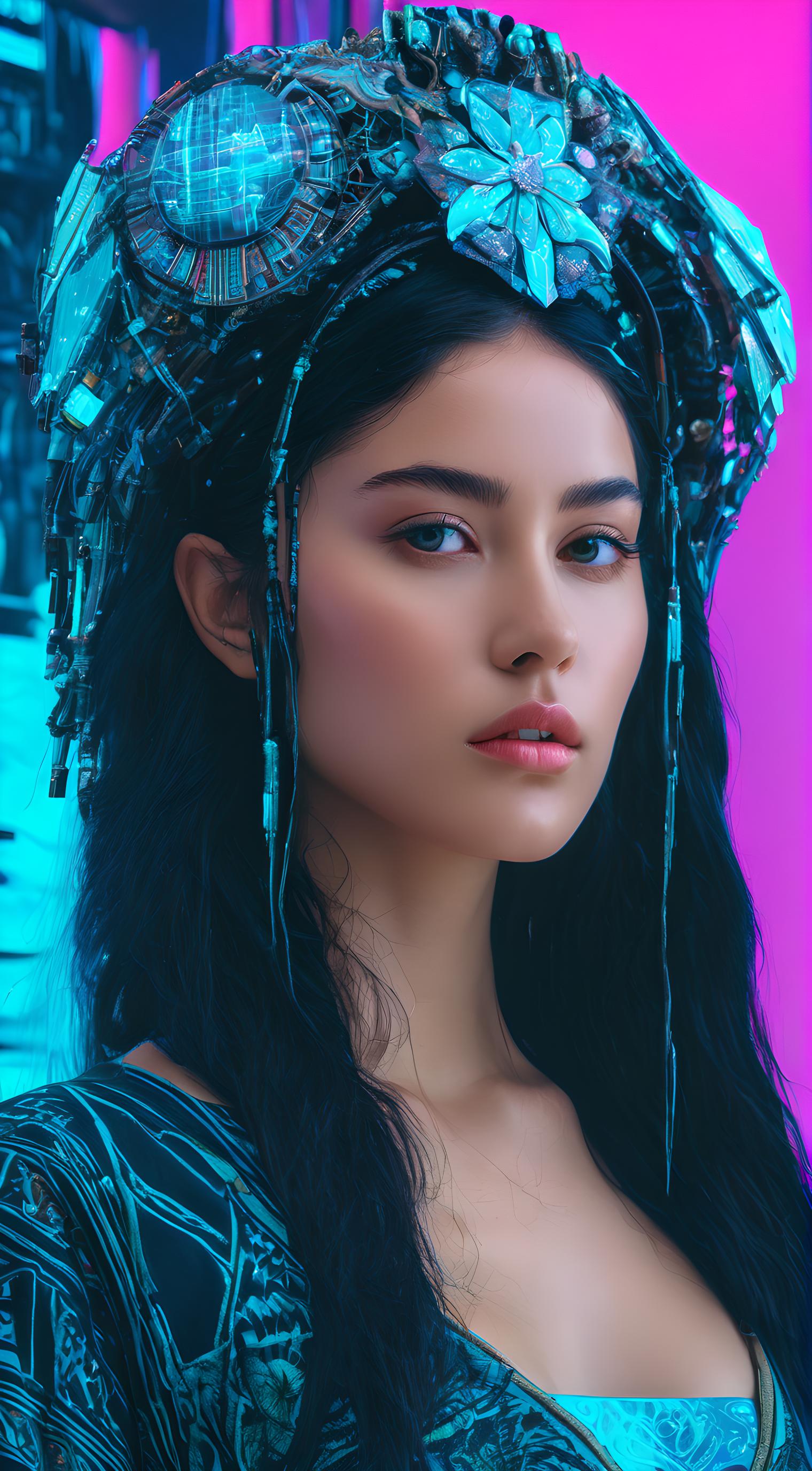 一个美丽的女孩,黑色头发,头上戴着夸张细节丰富的头饰,神圣的奇特的没见过的异世界头饰,重点在要看清楚头饰,半侧脸,上半身,大师作品,高4k