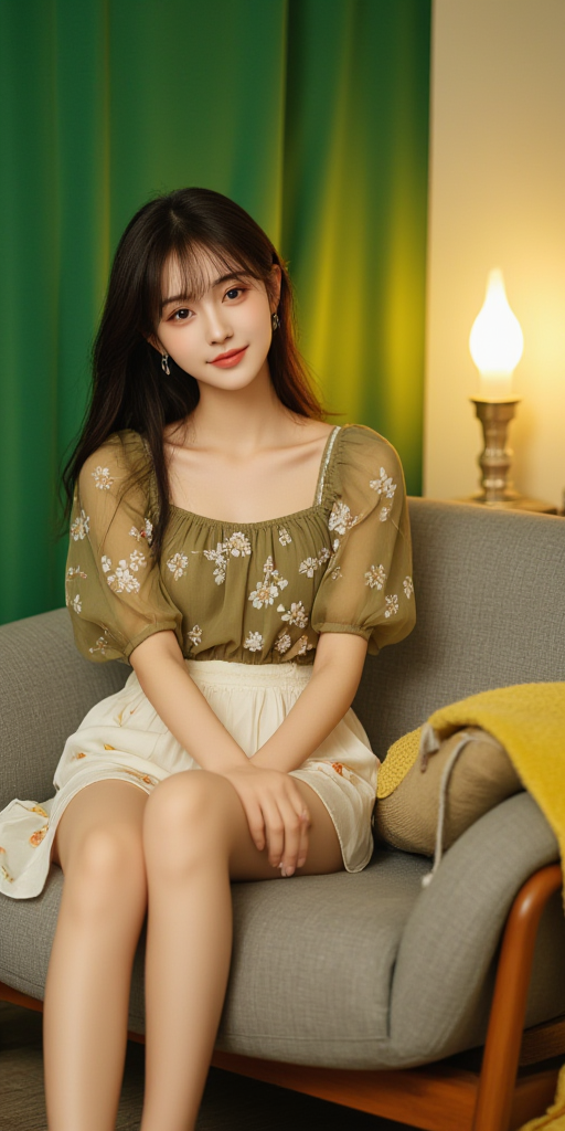 灰色沙发上面的绿色短袖女孩