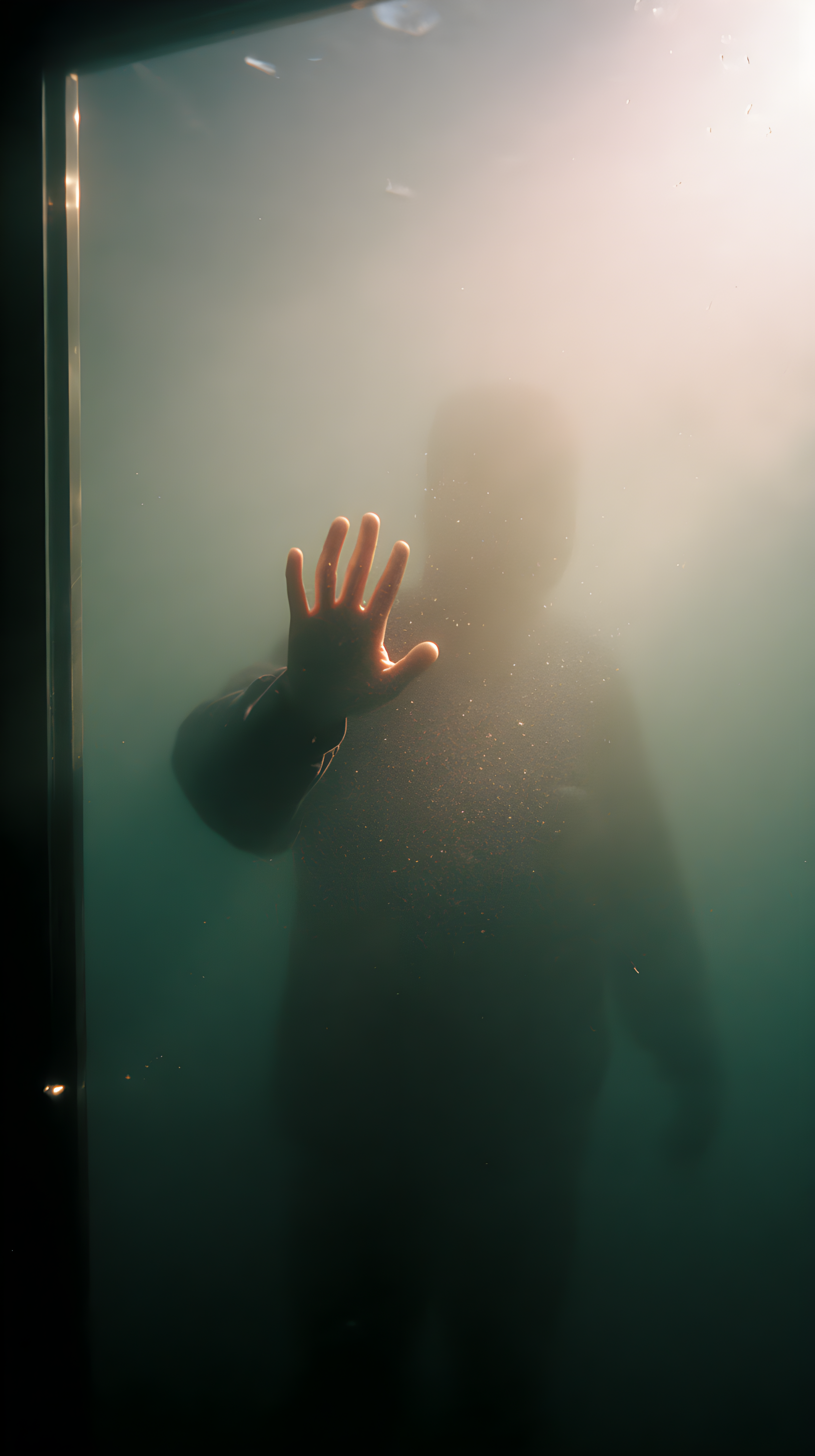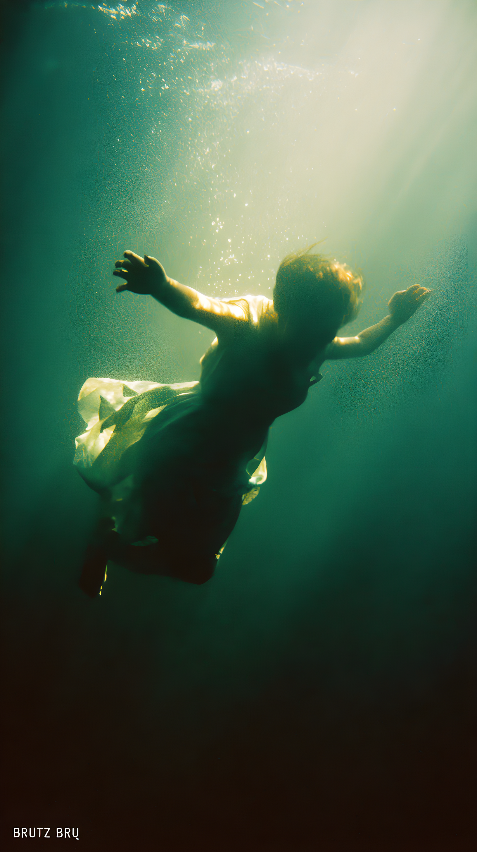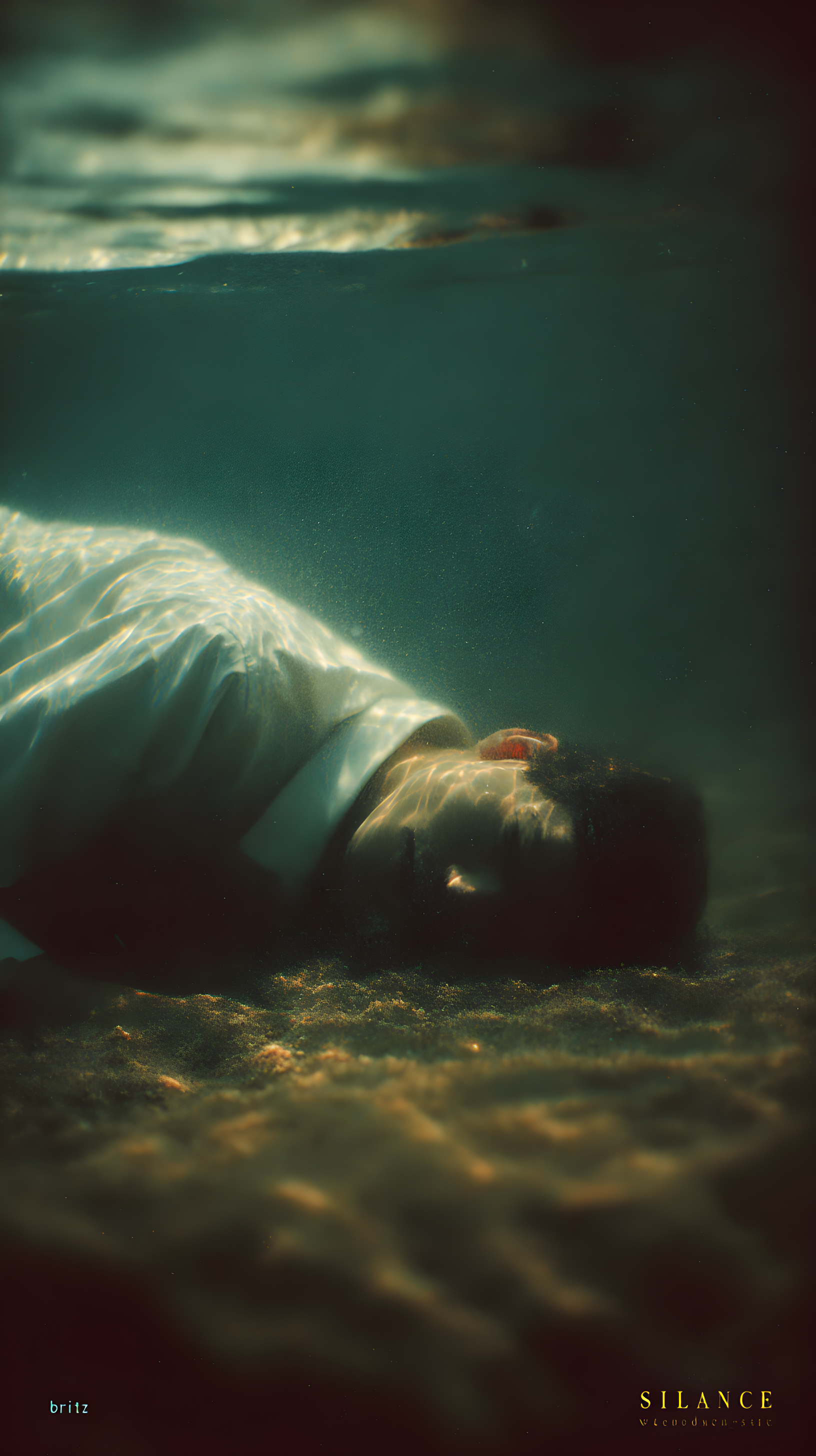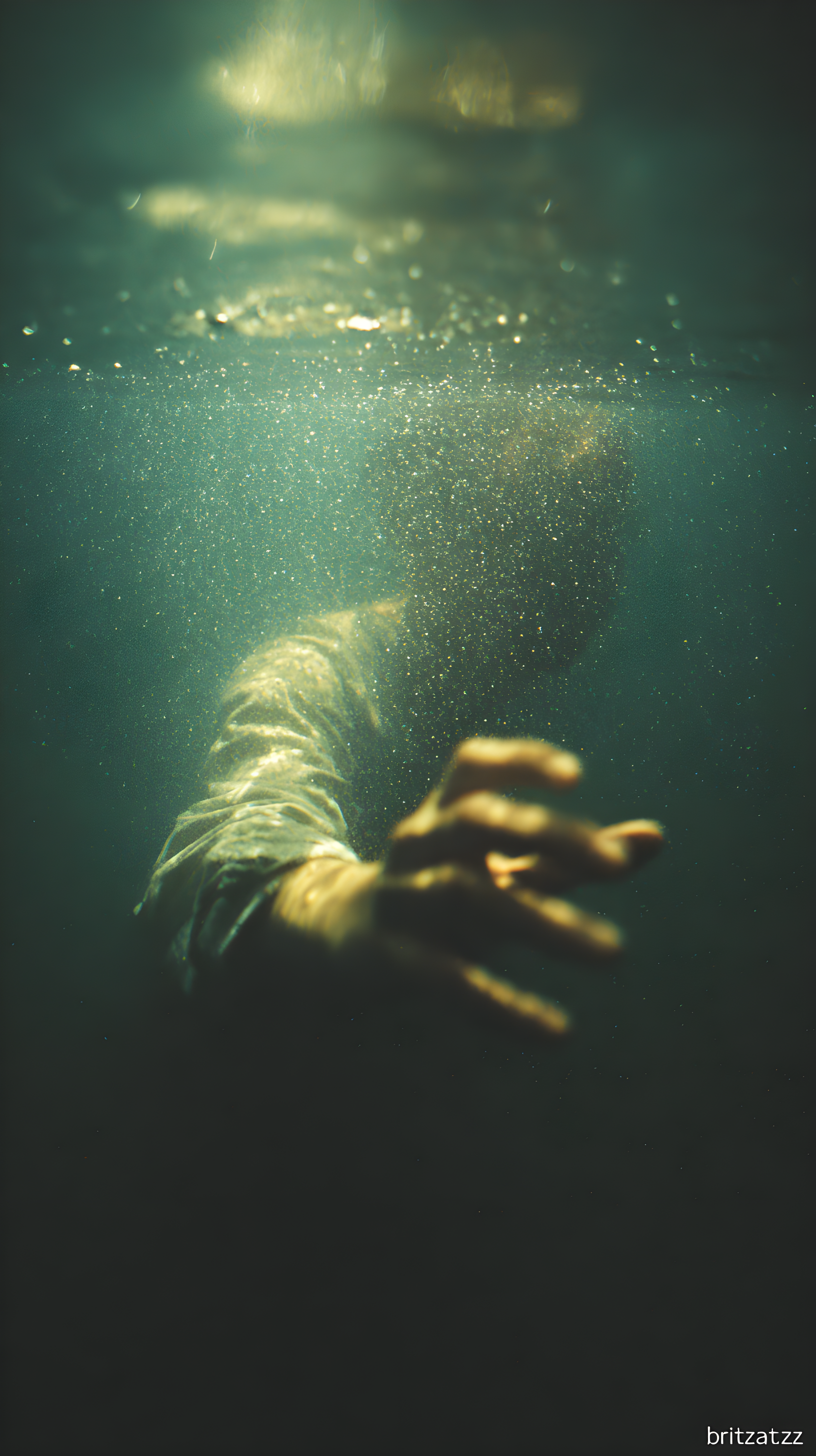 技法:非常规坠落视角构图+负空间空白(深海虚无延伸),水下慢门旋焦(强化坠落眩晕感),虚焦深海背景(凸显虚无)+对焦指尖局部高清(刻画抓握的无力肌理),运动模糊叠加拖影(水流与躯体的动态拉扯)