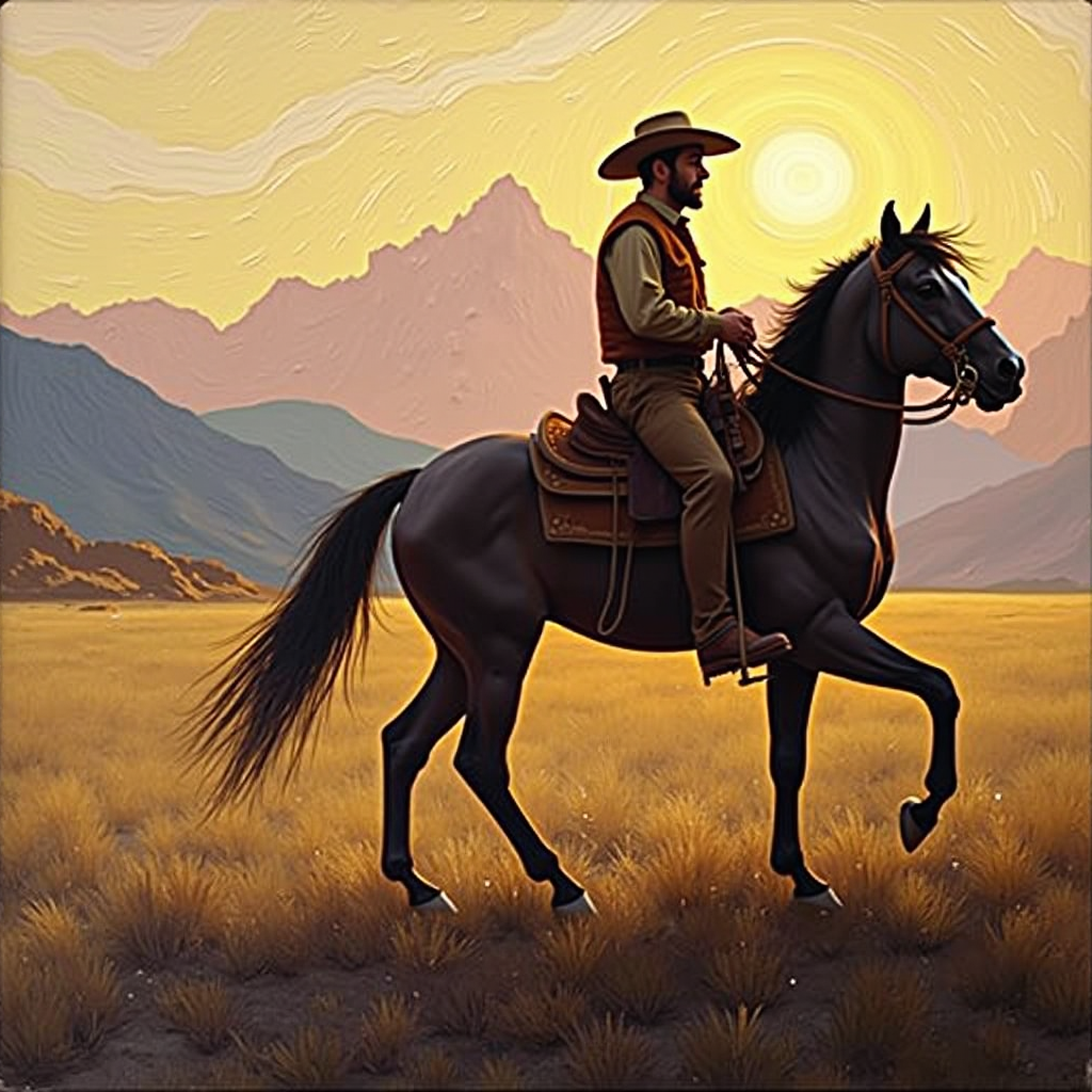 牛仔骑马背影奔向远方背景是大山 梵高星月夜油画风格笔触粗犷