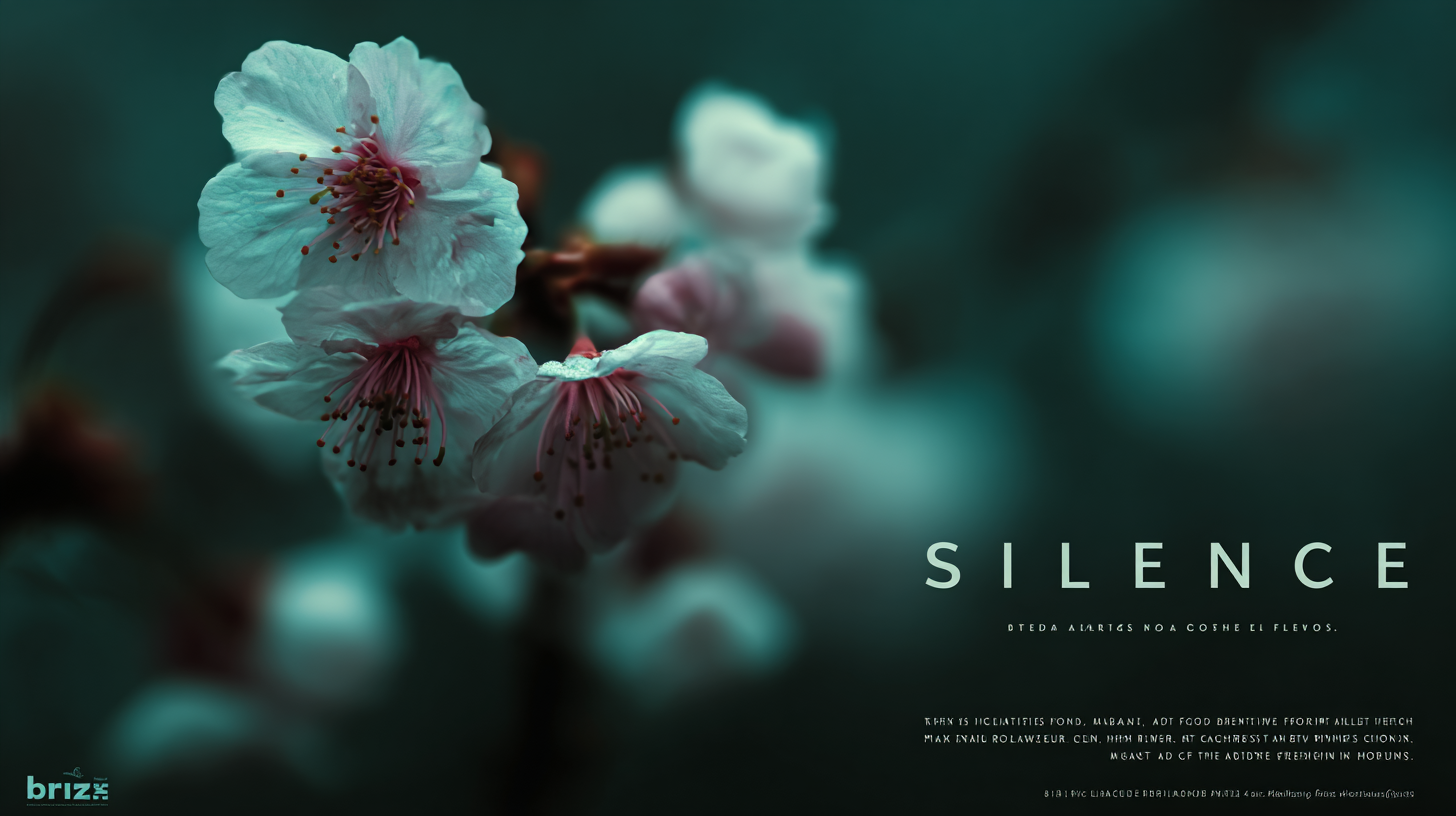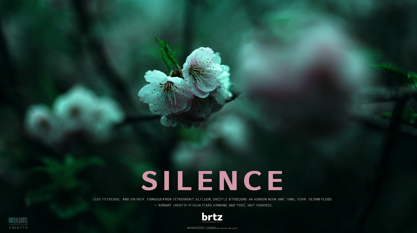 标题“SILENCE”与签名“brtz”字母以光影渐变效果,底部以小字融入东方哲思:“雨润花明心自晴”。8K高清,细节锐利而光影柔和,画面带轻微呼吸感晃动。