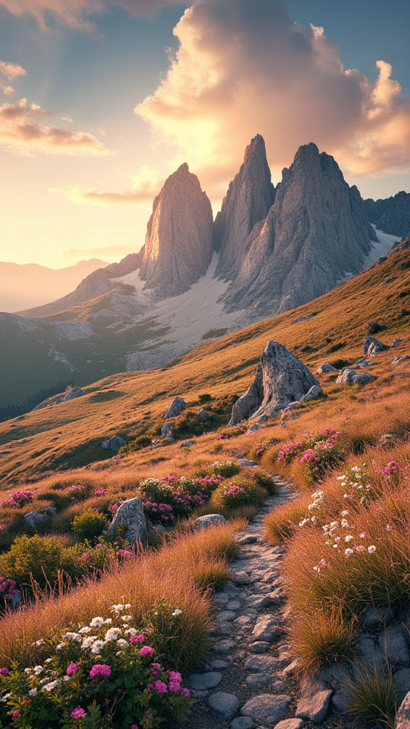 夏天五颜六色的植被,山峦叠涨的高峰,视野开阔,营造出梦幻氛围,自然风景摄影,中景,温馨氛围,暖色调,饱和度高,衬托夕阳的温暖