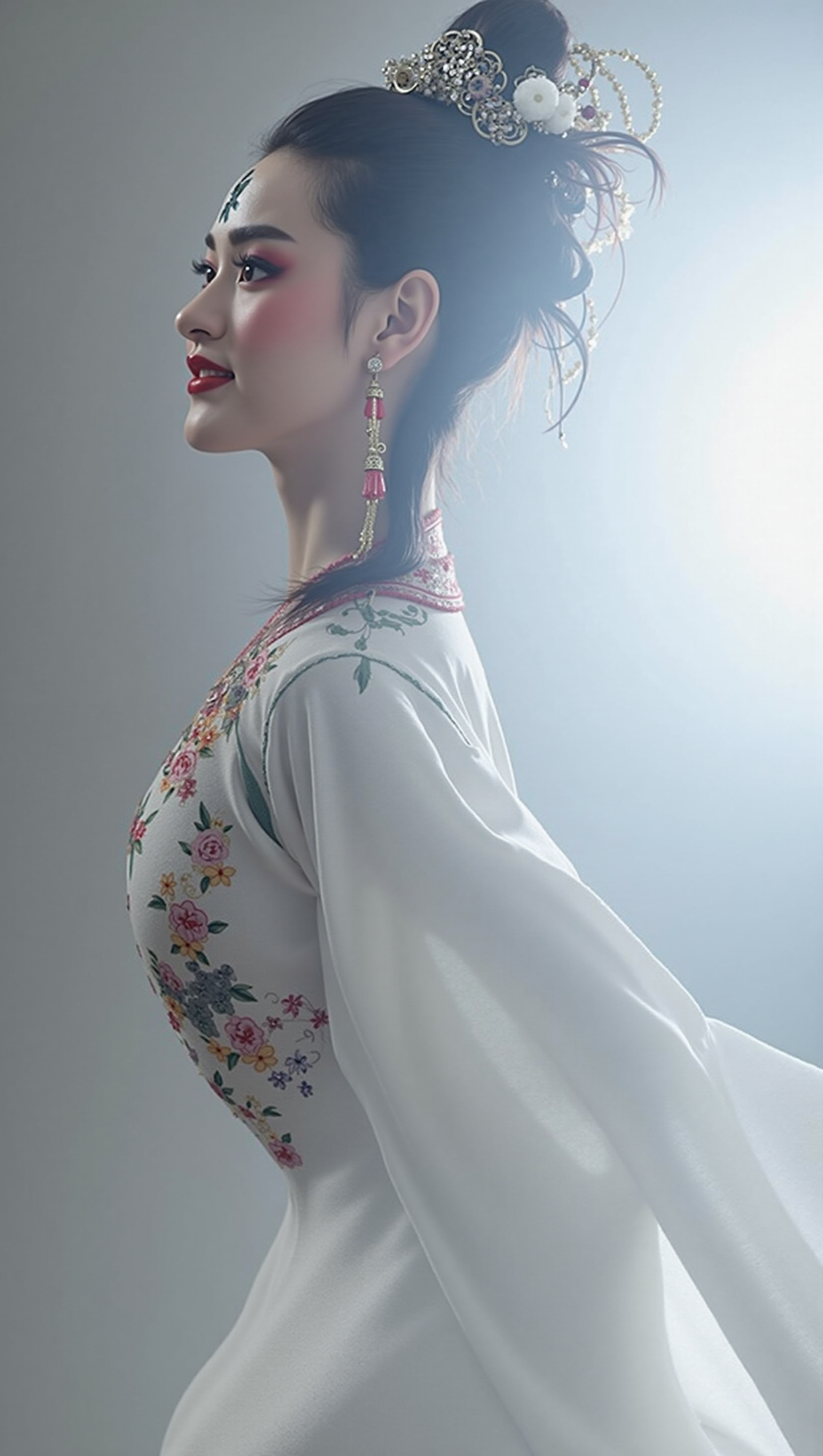 一位京剧花旦青衣形象的人物全身比例,正面对着镜头。面部妆容精致,眉如远黛,含情脉脉的眼眸顾盼生辉,眼尾的色彩过渡自然且细腻,点缀着细碎而华美的装饰。樱桃小嘴,唇色娇艳欲滴,嘴角微微上扬,带着一抹温婉笑意。头戴极为精致的头饰,流苏摇曳生姿,花式精美耳环垂落,闪耀着动人光泽。有着完美的身材比例,纤细的腰肢盈盈一握,优雅的颈部线条宛如天鹅般优美。肖像摄影真实光线特写,电影感十足。极致细节丰富光线,Janet Echelman皮影三维立体特写。超细腻线条勾勒古风形象,头发飘逸呈现微距感。鲜艳高饱和度,光滑光泽炫彩光影内发光。辛烷值渲染,大师级构图,最佳质量,唯美意境,梦幻人像摄影光影动态,高分辨率,白皮肤纹理,自然光线柔和色调,超清细节 hdr。舞台唱戏姿势,尽显国风韵味。
