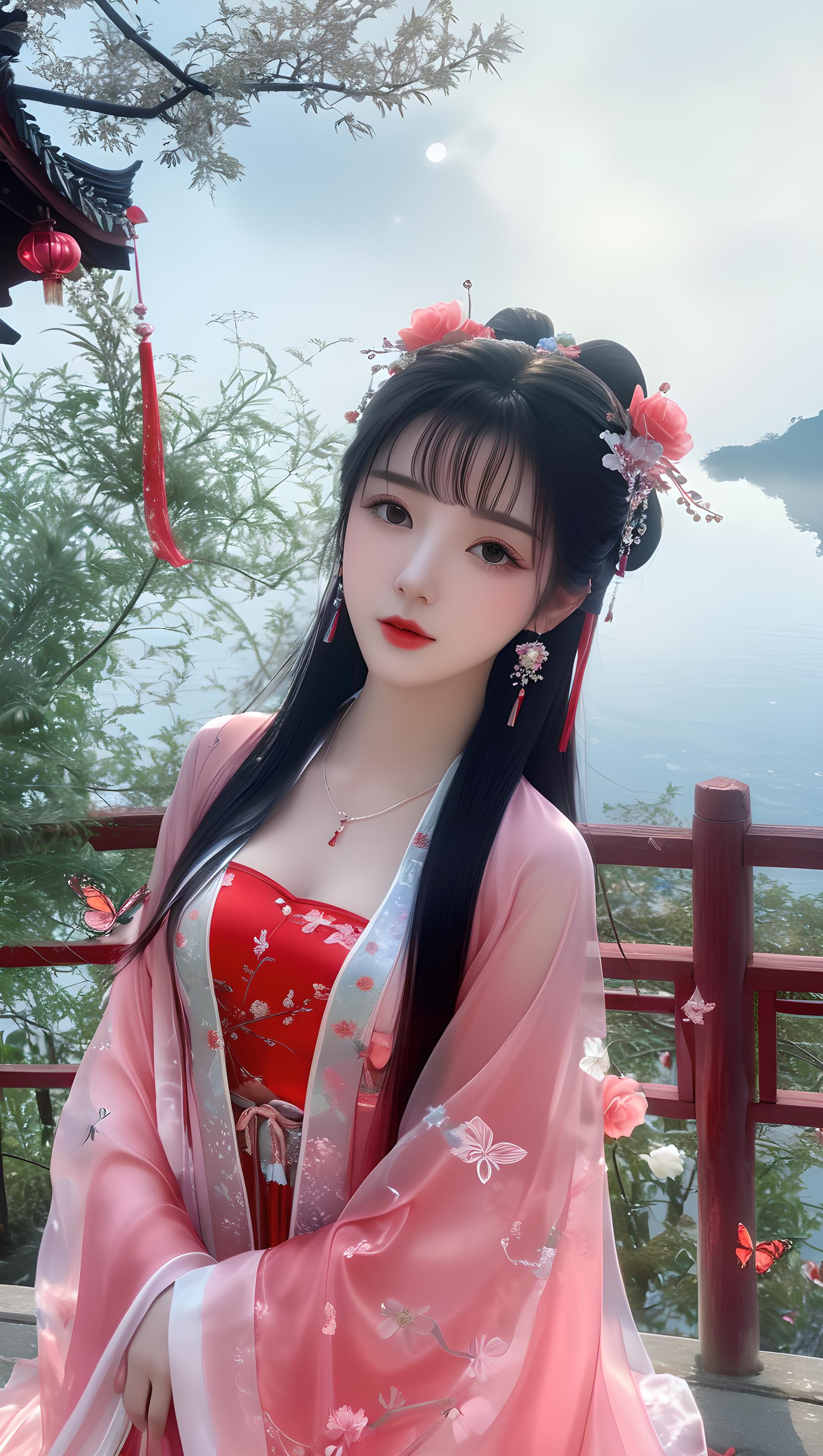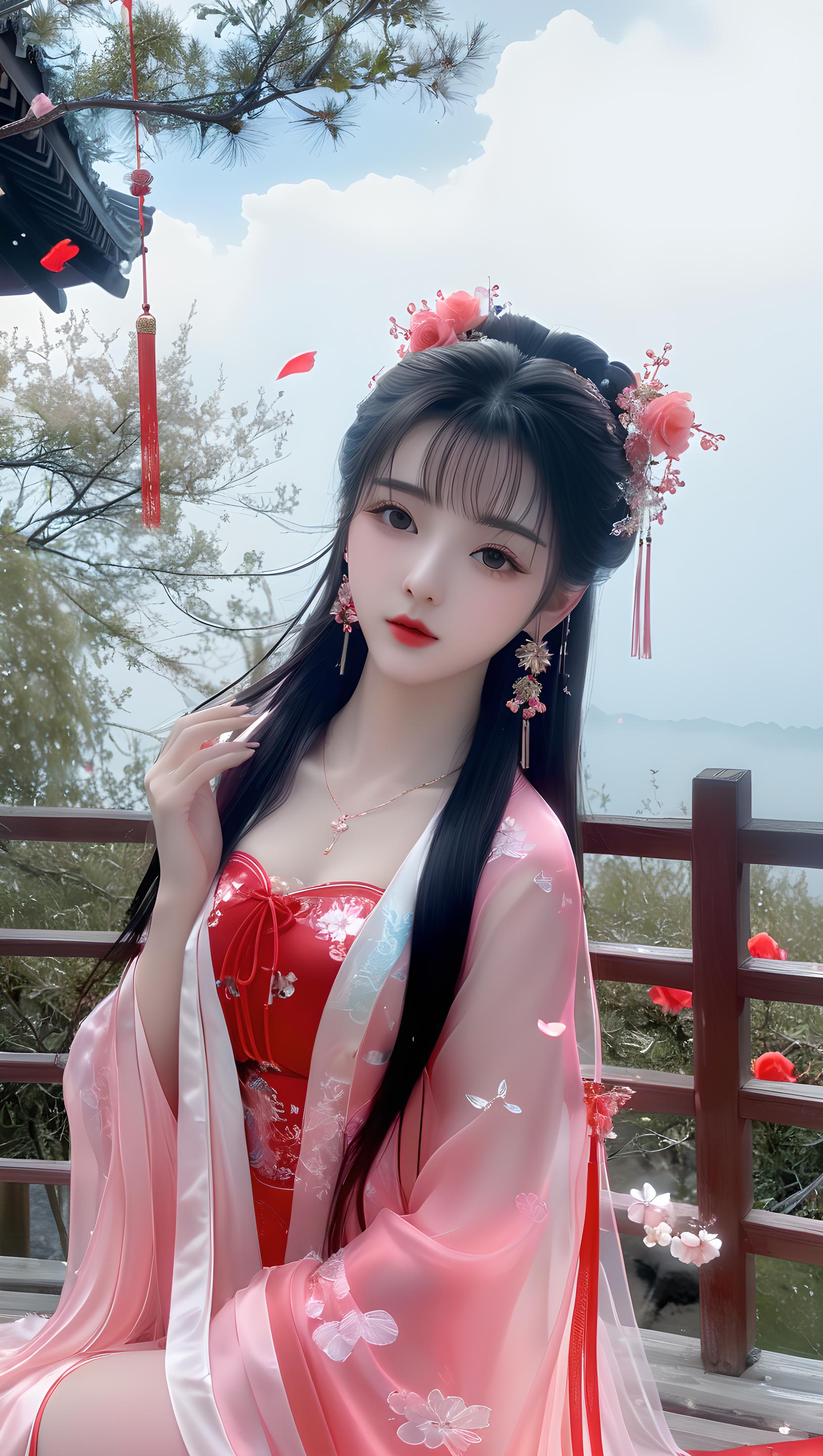 少女,挺胸丰满,多层透明丝绸全身镜,奢华丝滑亮红色雪纺泛光透视(幻彩,闪光,超薄,柔软,透明)液态汉服,云层,云彩,飞天的姿势,细节真实感,五官完美,特写明亮的大眼睛,胸部大,看着镜头,超细节,脸部细腻,超高清,真实皮肤,全身照,全身镜,高清照片,耳环