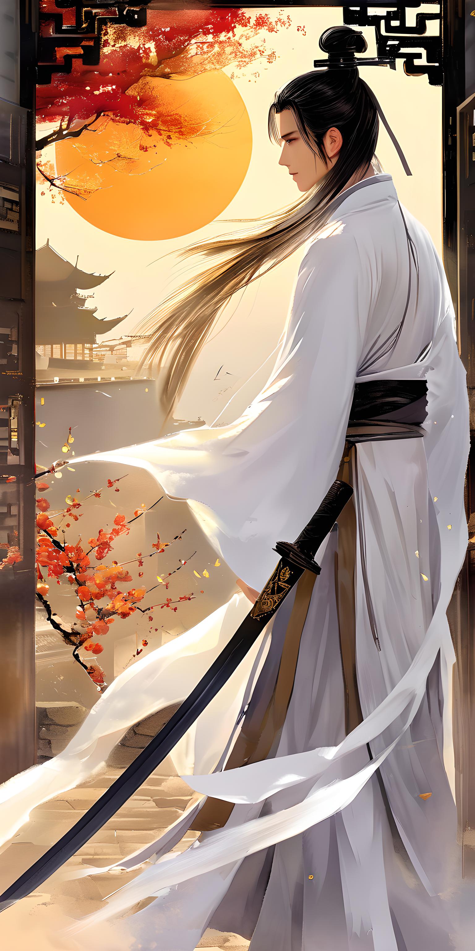 古风男子,身姿挺拔,一袭白色长袍随风飘动,长发束起,发带飘扬,手持折扇或佩剑,背影帅气潇洒。古旧的城墙,城墙上爬满了藤蔓,夕阳的余晖洒在上面,映出金黄的光,回忆滤镜,画面色调偏暖黄,带有轻微的模糊感,仿佛是记忆中的画面;远景构图,人物位于画面下方偏右或偏左的位置,占画面比例较小,凸显出环境的广阔;采用仰拍或平拍视角,从人物背后望去,让视线随着人物的目光延伸向远方的景色。
