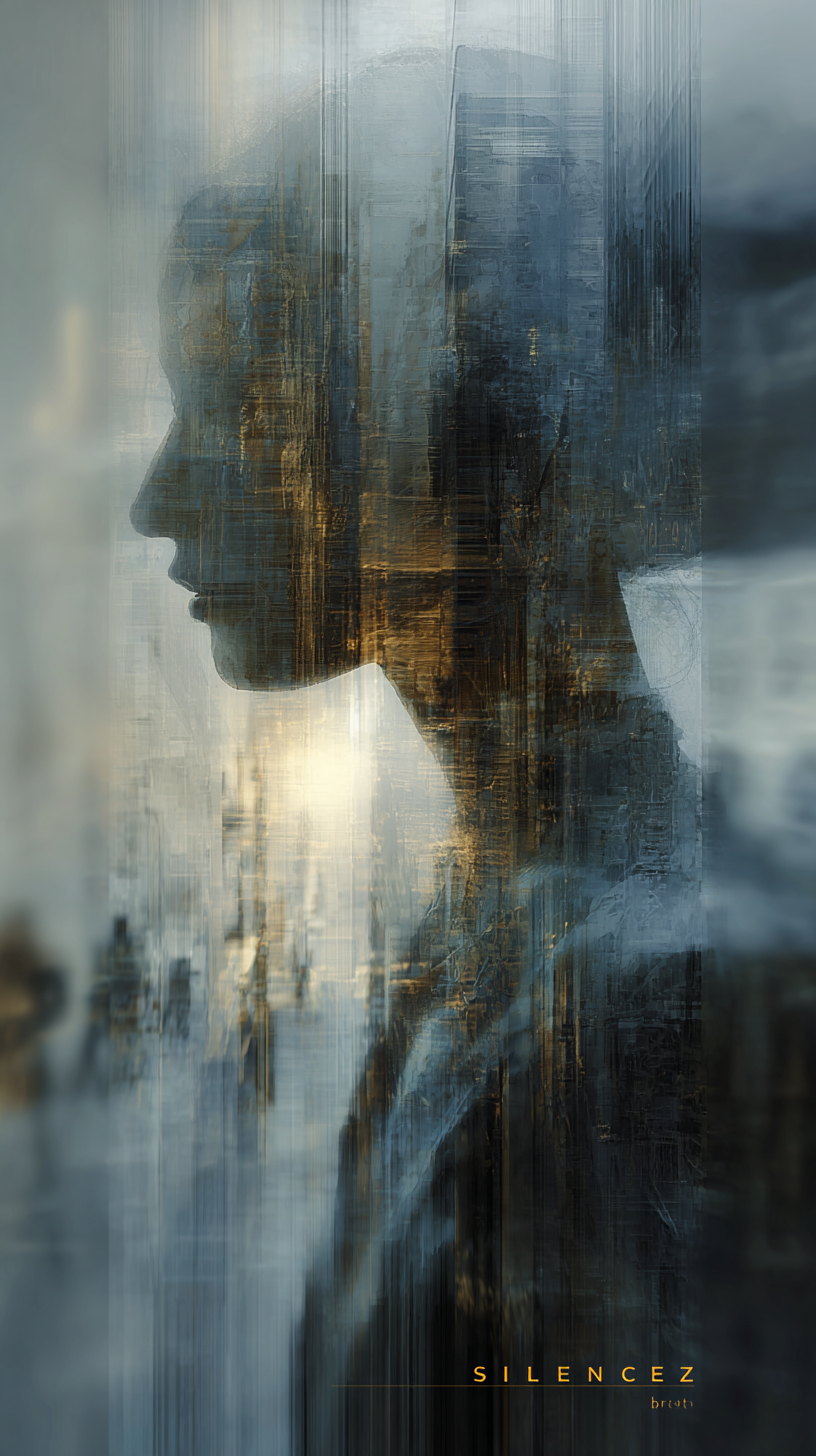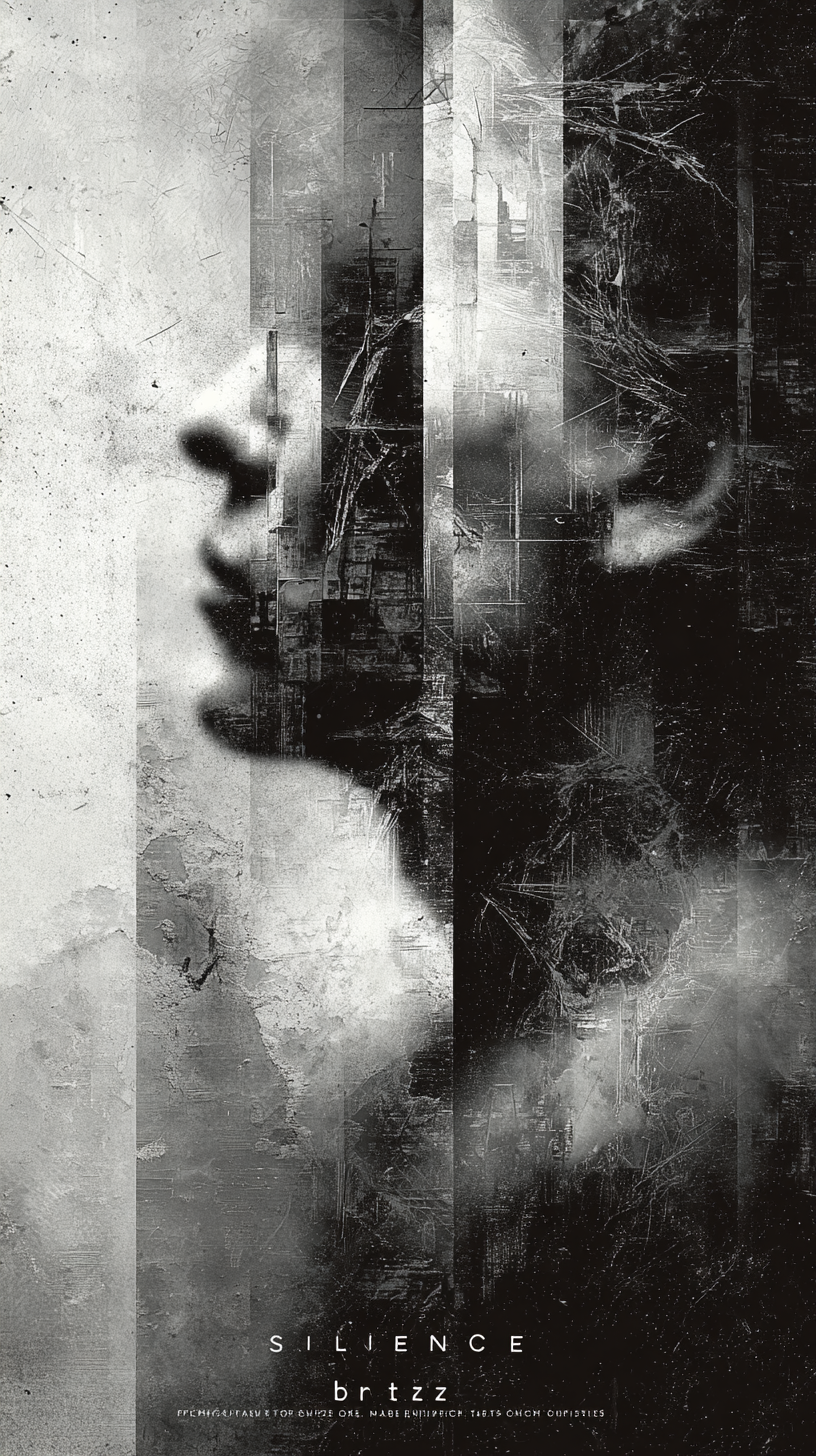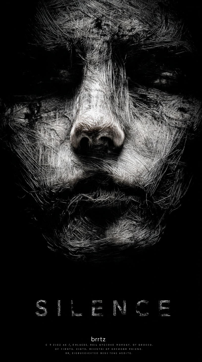 标题“SILENCE”与签名“brtz”字母以光影效果嵌入顶部,底部以小字融入东方哲思:“”。8K高清,细节锐利而光影柔和,画面带轻微呼吸感晃动。文字字母禁止遮挡人物。