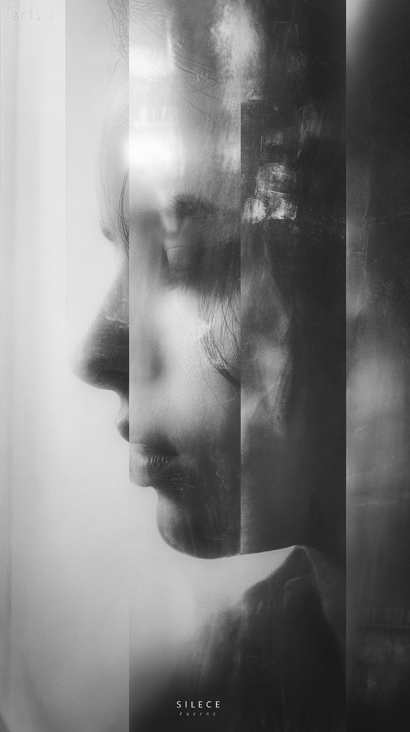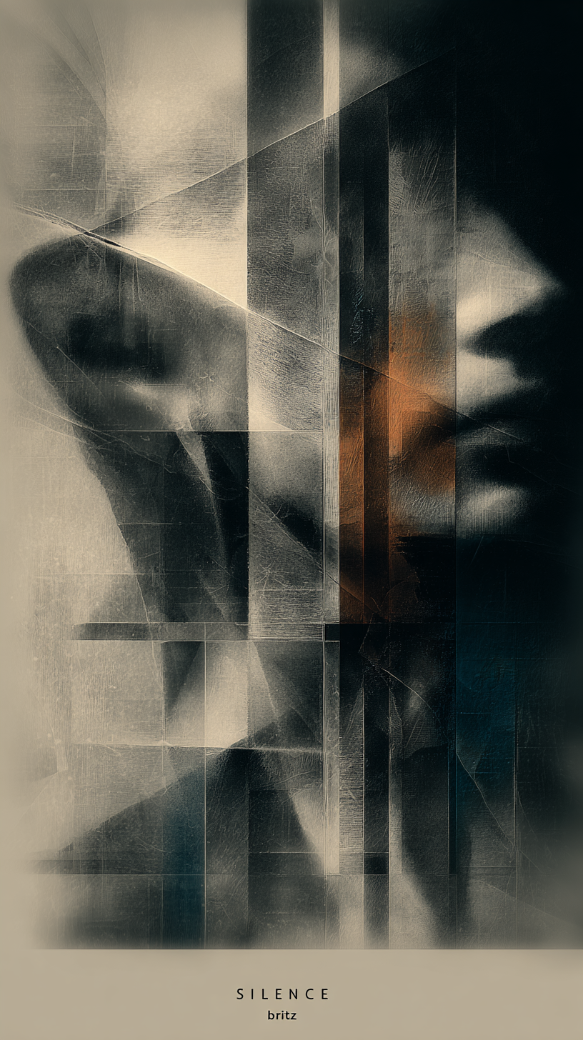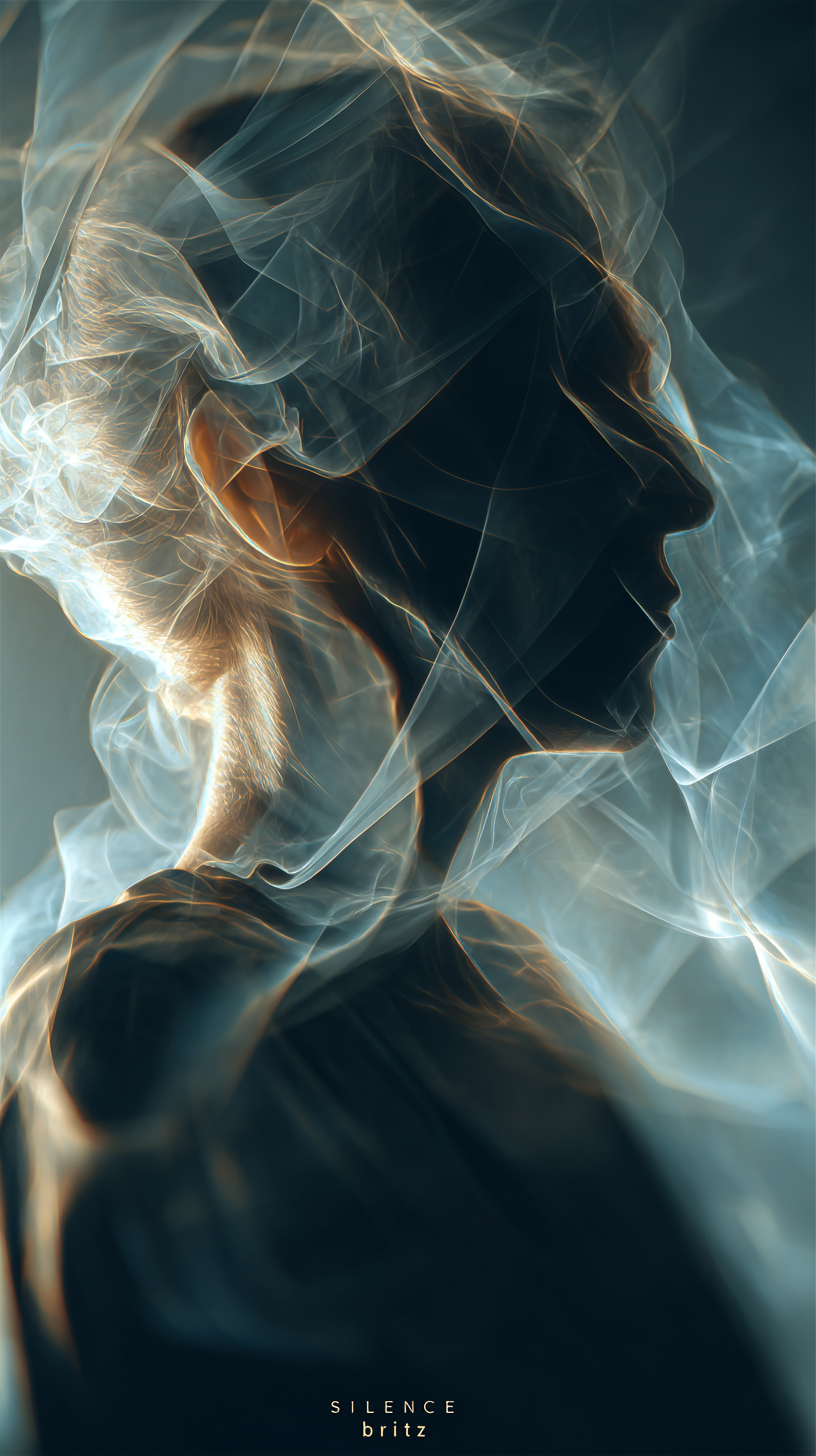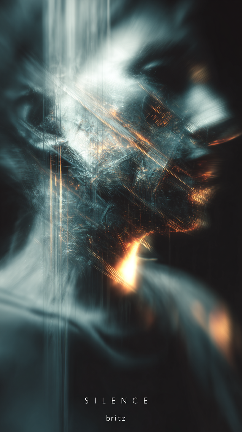 以意识流、超现实主义为表达手法,多重曝光、叠影、弥散渐变,虚实交融,常以抽象线条、光影为叙事主体,弱化具象细节,强调情绪流动。概念数字艺术,超现实抽象美学。标题“SILENCE”与签名“brtz”以光影效果嵌入图片,巧妙融入。富士胶片复古颗粒,8K高清,细节锐利。