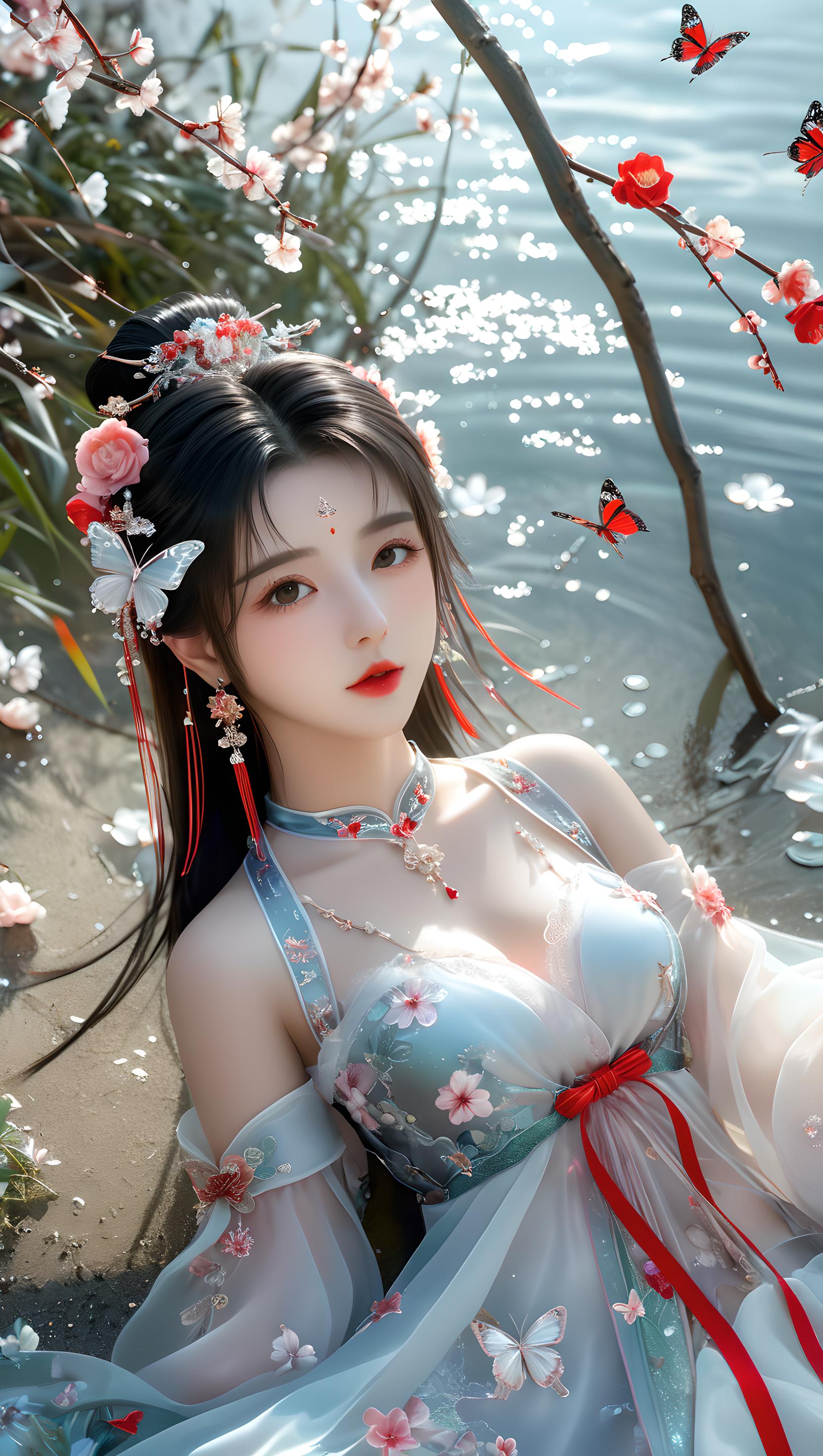 少女,挺胸丰满,多层透明丝绸全身镜,奢华丝滑亮红色雪纺泛光透视(幻彩,闪光,超薄,柔软,透明)液态汉服,云层,云彩,飞天的姿势,细节真实感,五官完美,特写明亮的大眼睛,胸部大,看着镜头,超细节,脸部细腻,超高清,真实皮肤,全身照,全身镜,高清照片,耳环