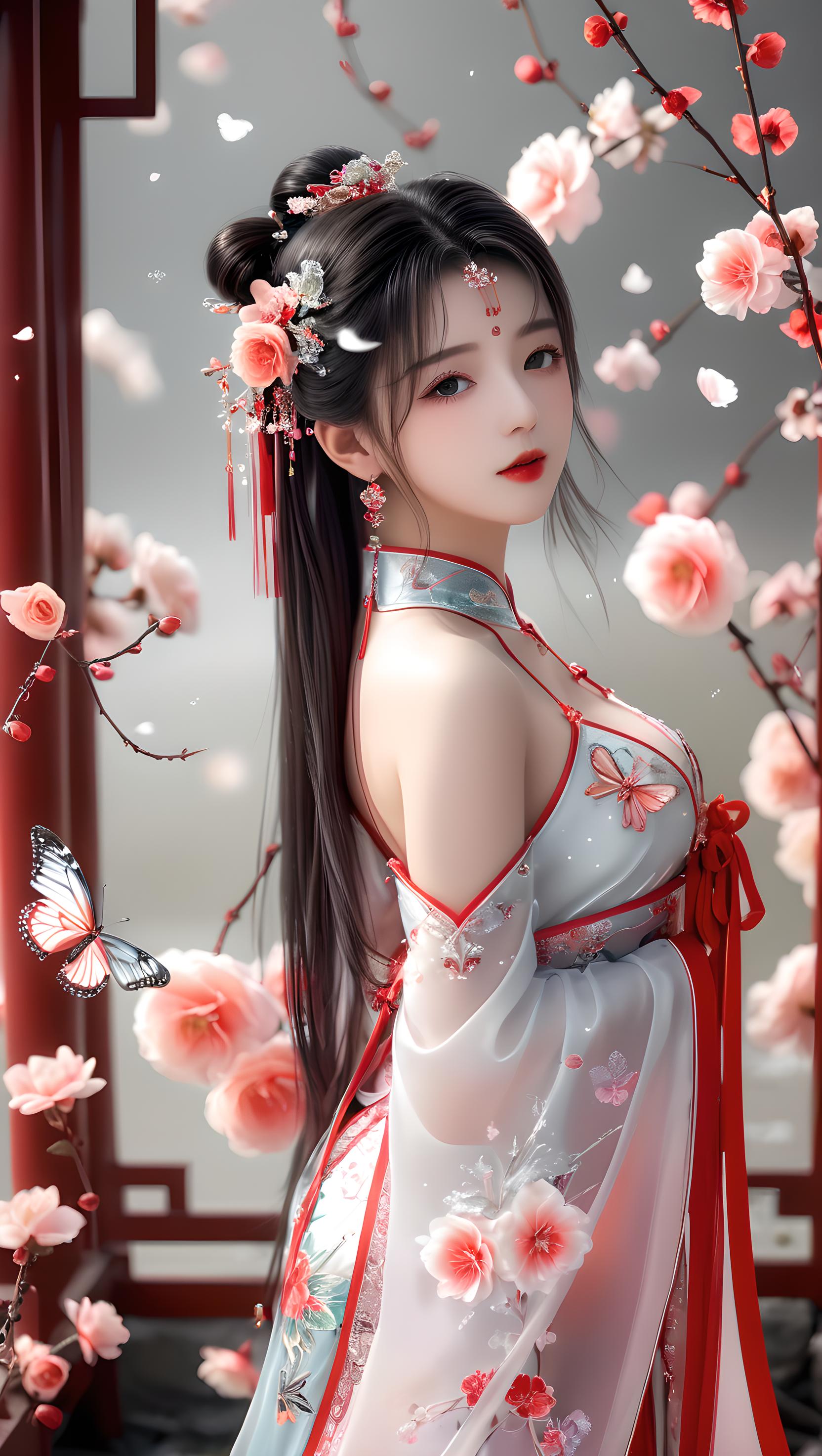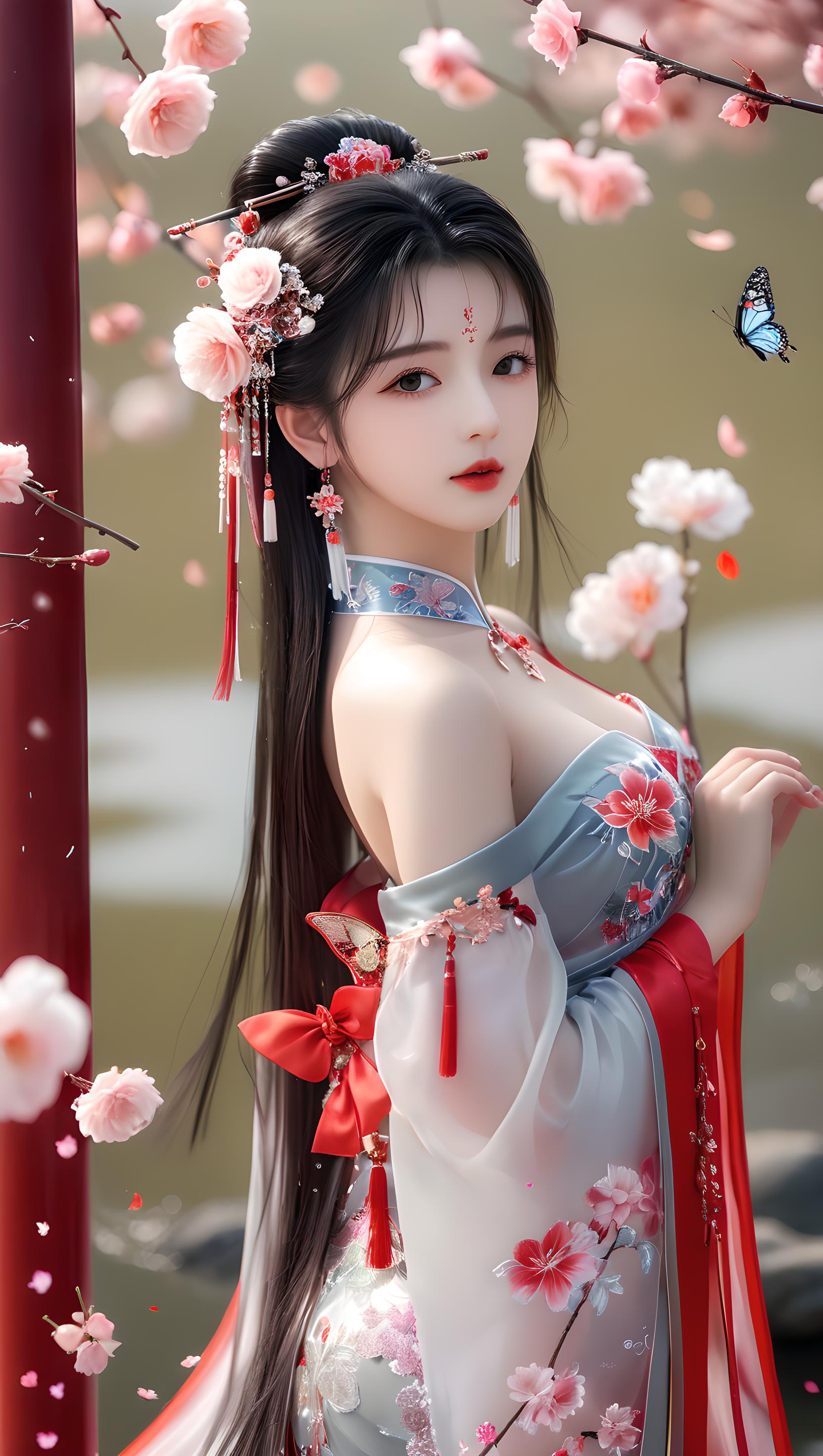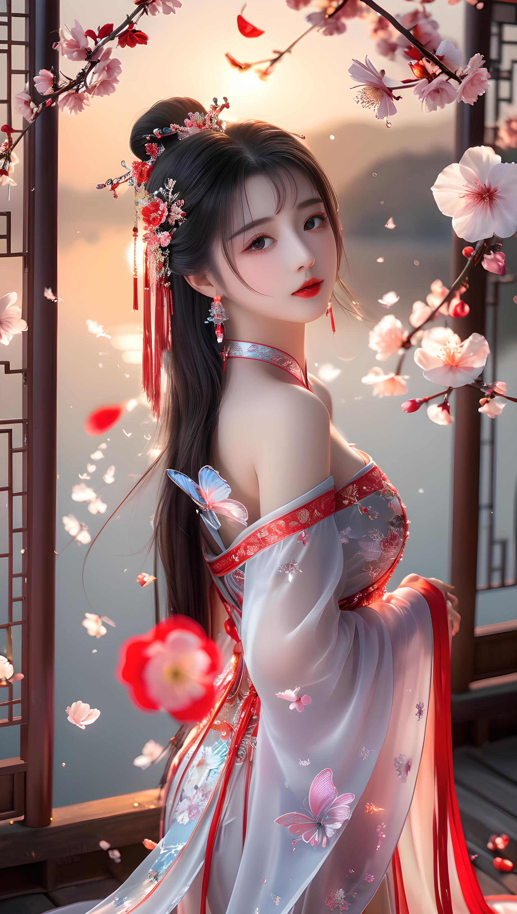 少女,挺胸丰满,多层透明丝绸全身镜,奢华丝滑亮红色雪纺泛光透视(幻彩,闪光,超薄,柔软,透明)液态汉服,云层,云彩,飞天的姿势,细节真实感,五官完美,特写明亮的大眼睛,胸部大,看着镜头,超细节,脸部细腻,超高清,真实皮肤,全身照,全身镜,高清照片,耳环