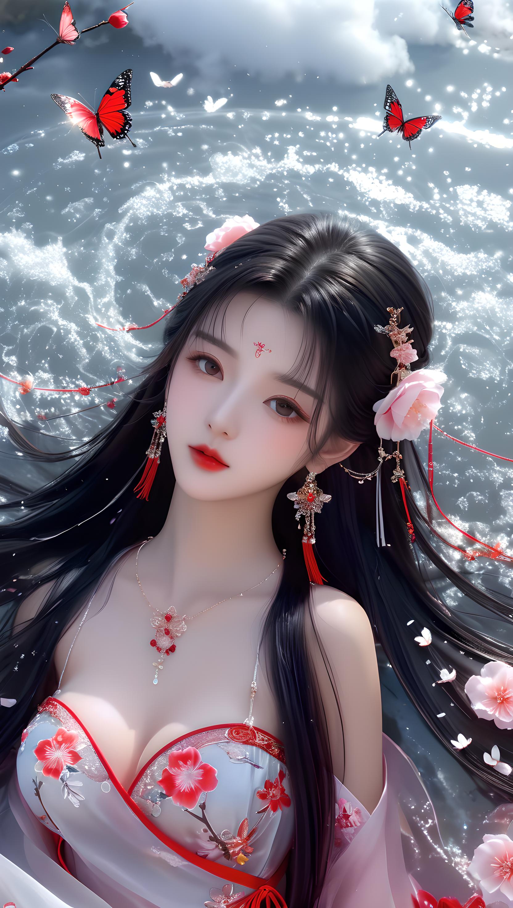 少女,挺胸丰满,多层透明丝绸全身镜,奢华丝滑亮红色雪纺泛光透视(幻彩,闪光,超薄,柔软,透明)液态汉服,云层,云彩,飞天的姿势,细节真实感,五官完美,特写明亮的大眼睛,胸部大,看着镜头,超细节,脸部细腻,超高清,真实皮肤,全身照,全身镜,高清照片,耳环