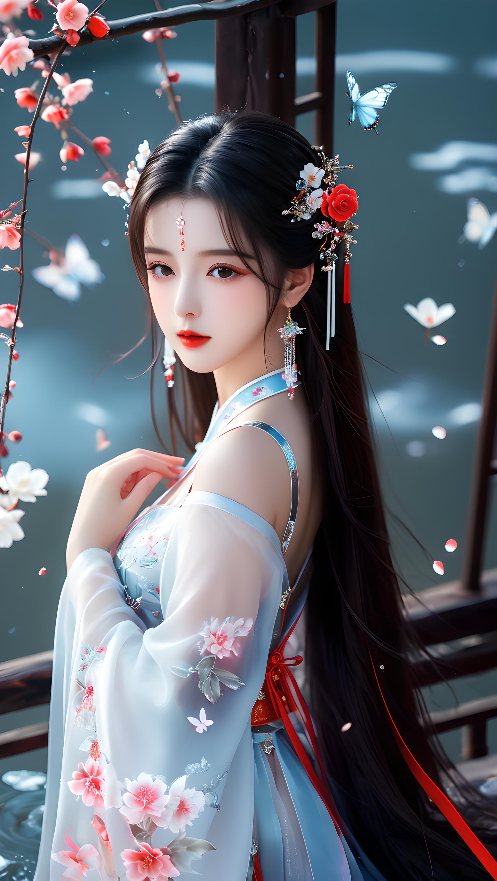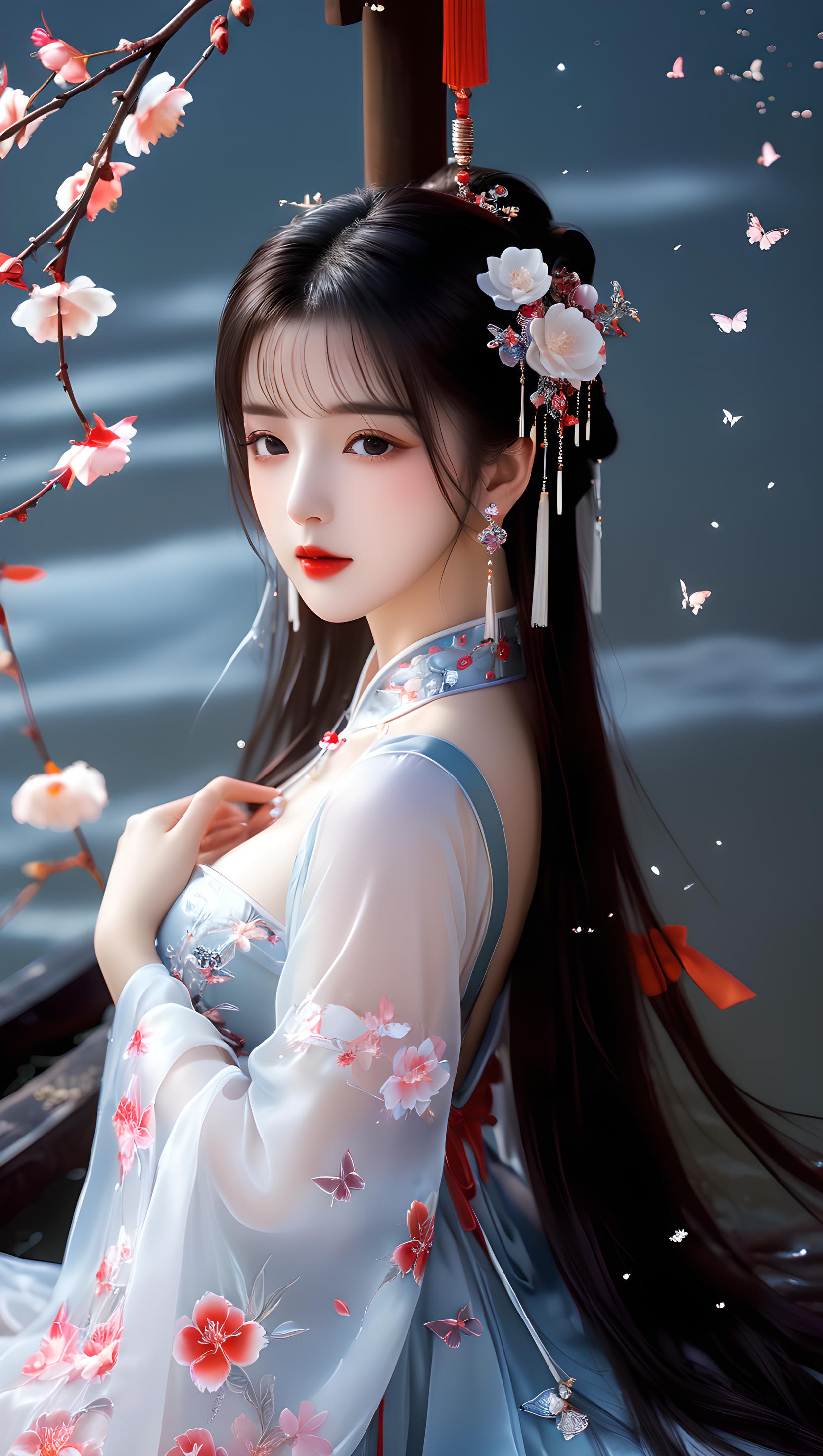 少女,挺胸丰满,多层透明丝绸全身镜,奢华丝滑亮红色雪纺泛光透视(幻彩,闪光,超薄,柔软,透明)液态汉服,云层,云彩,飞天的姿势,细节真实感,五官完美,特写明亮的大眼睛,胸部大,看着镜头,超细节,脸部细腻,超高清,真实皮肤,全身照,全身镜,高清照片,耳环