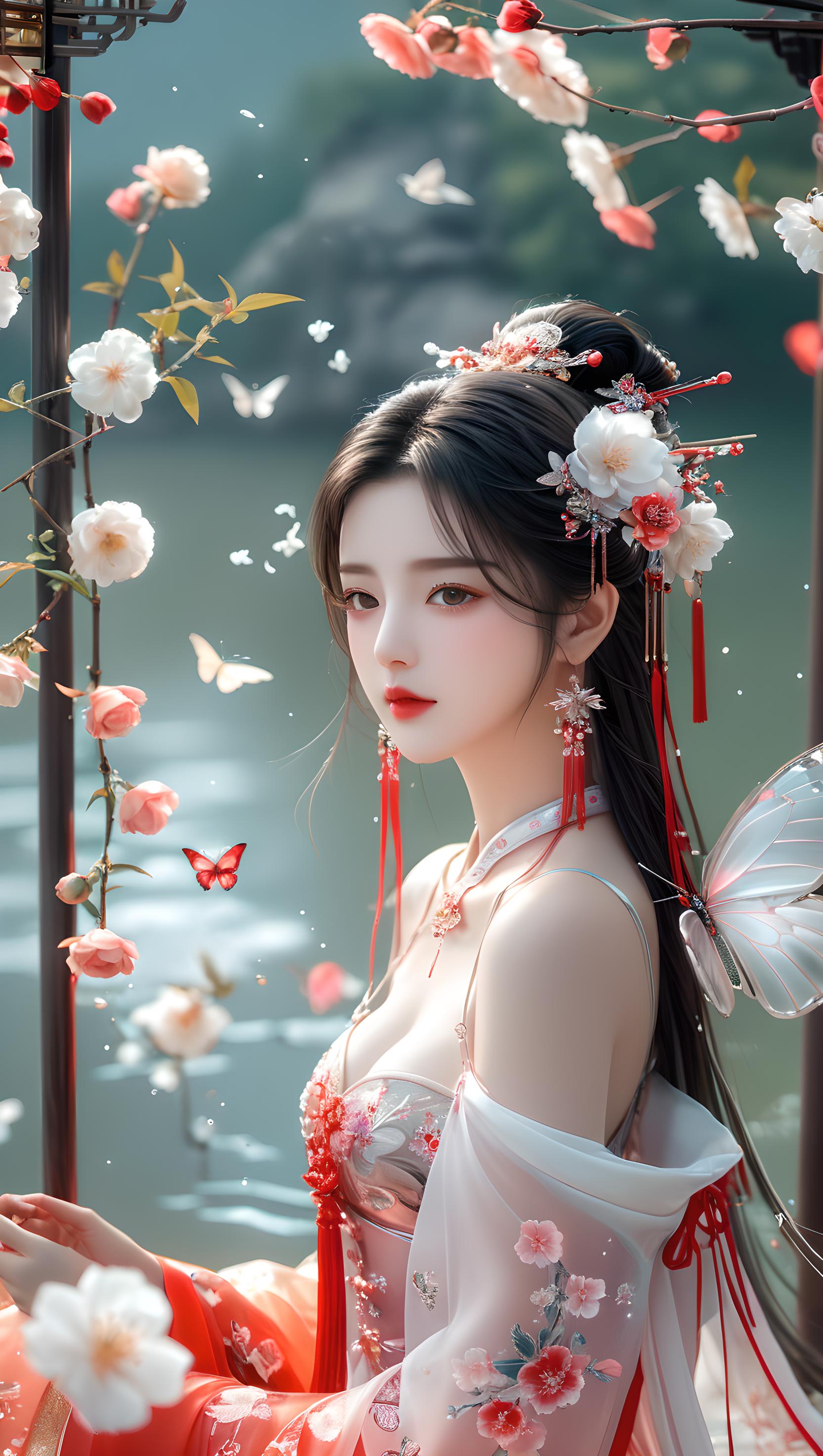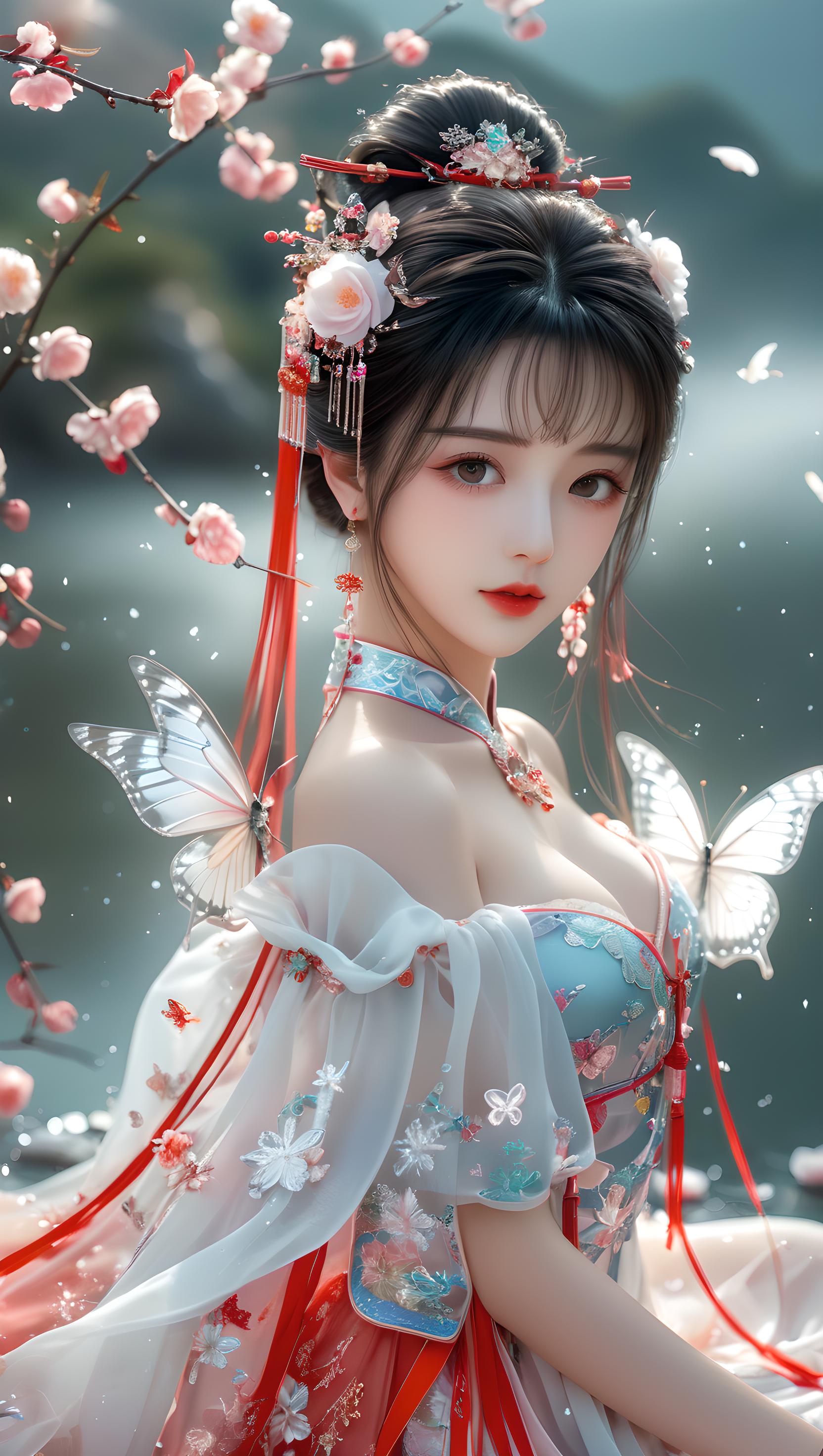少女,挺胸丰满,多层透明丝绸全身镜,奢华丝滑亮红色雪纺泛光透视(幻彩,闪光,超薄,柔软,透明)液态汉服,云层,云彩,飞天的姿势,细节真实感,五官完美,特写明亮的大眼睛,胸部大,看着镜头,超细节,脸部细腻,超高清,真实皮肤,全身照,全身镜,高清照片,耳环