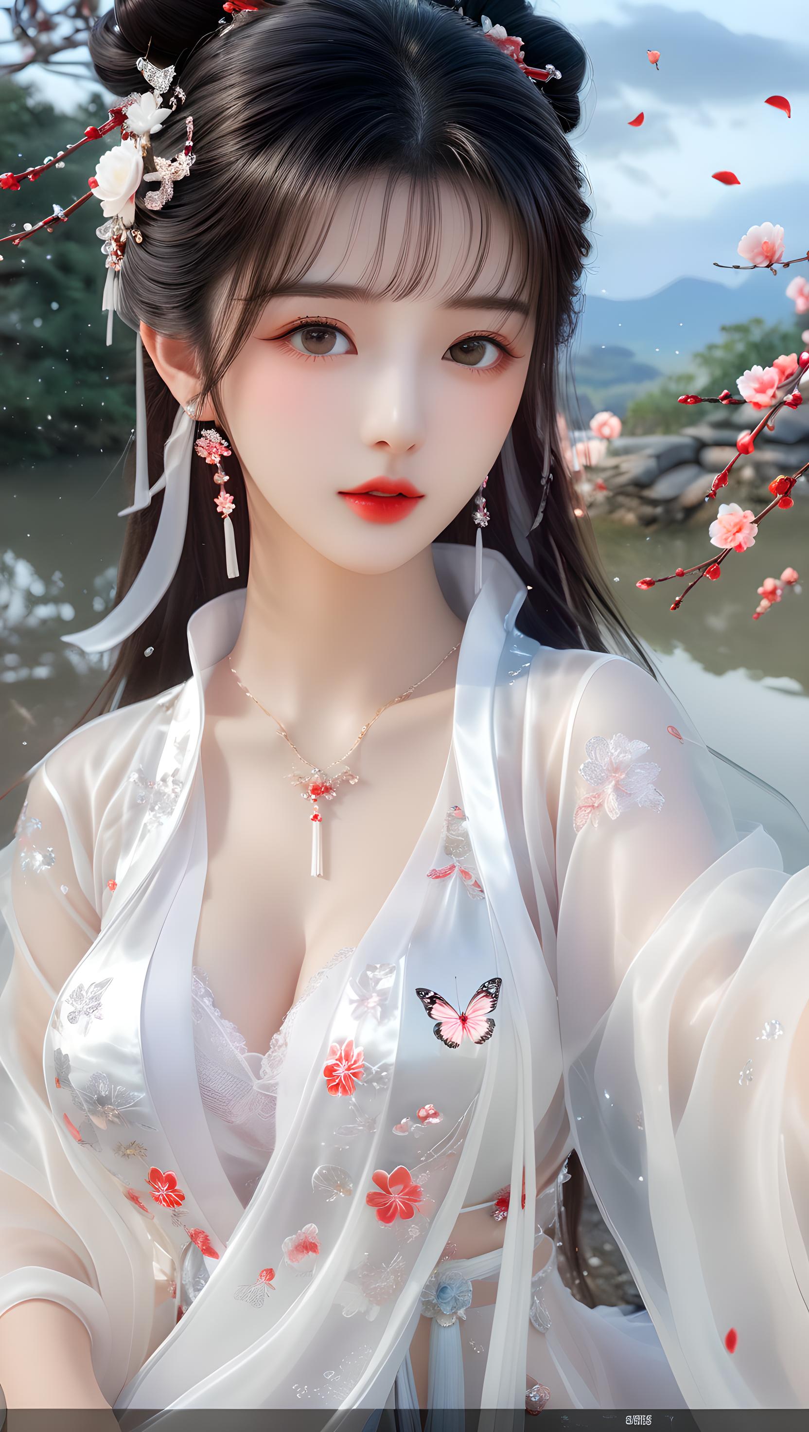 少女,挺胸丰满,多层透明丝绸全身镜,奢华丝滑亮红色雪纺泛光透视(幻彩,闪光,超薄,柔软,透明)液态汉服,云层,云彩,飞天的姿势,细节真实感,五官完美,特写明亮的大眼睛,胸部大,看着镜头,超细节,脸部细腻,超高清,真实皮肤,全身照,全身镜,高清照片,耳环