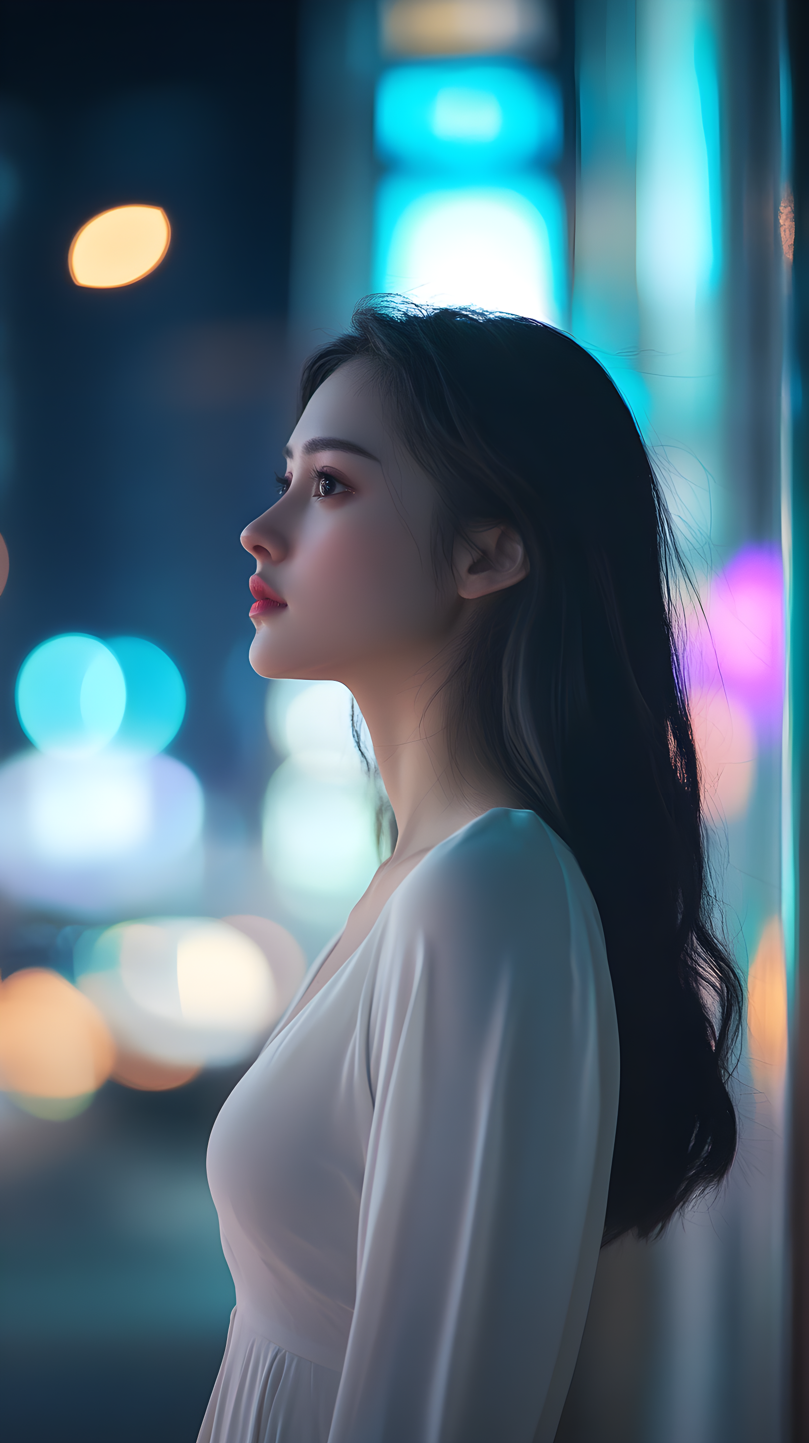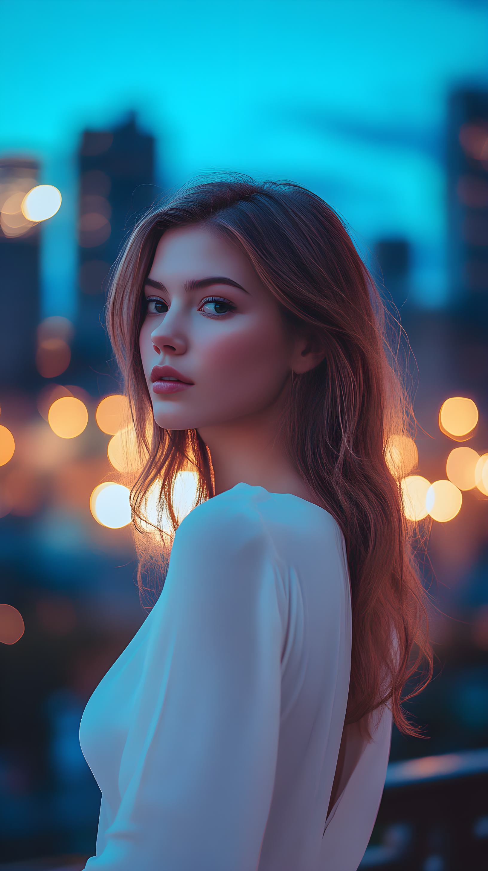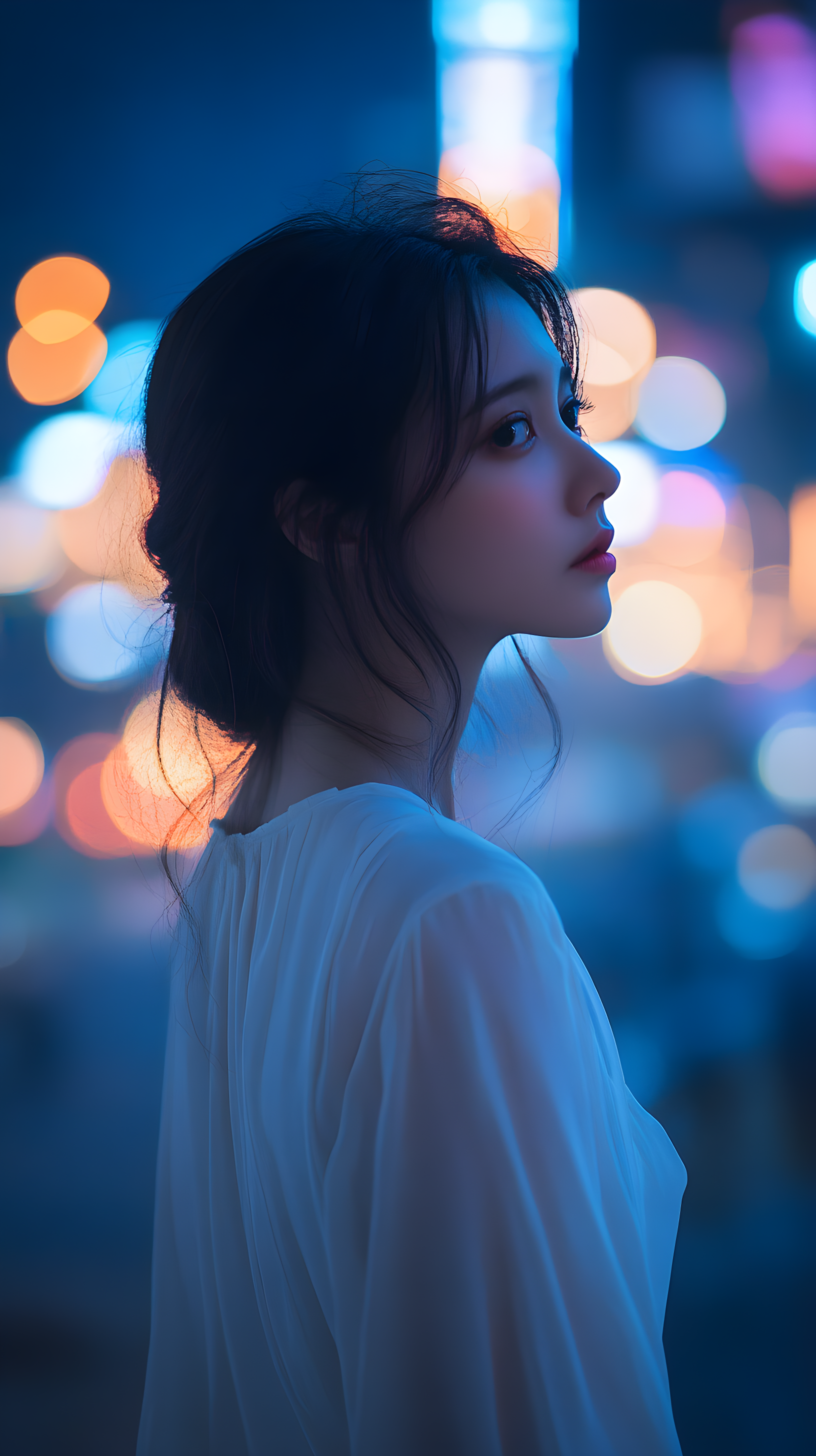 背后是模糊的城市灯光