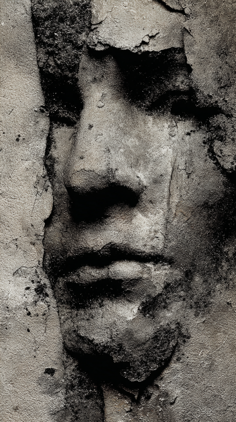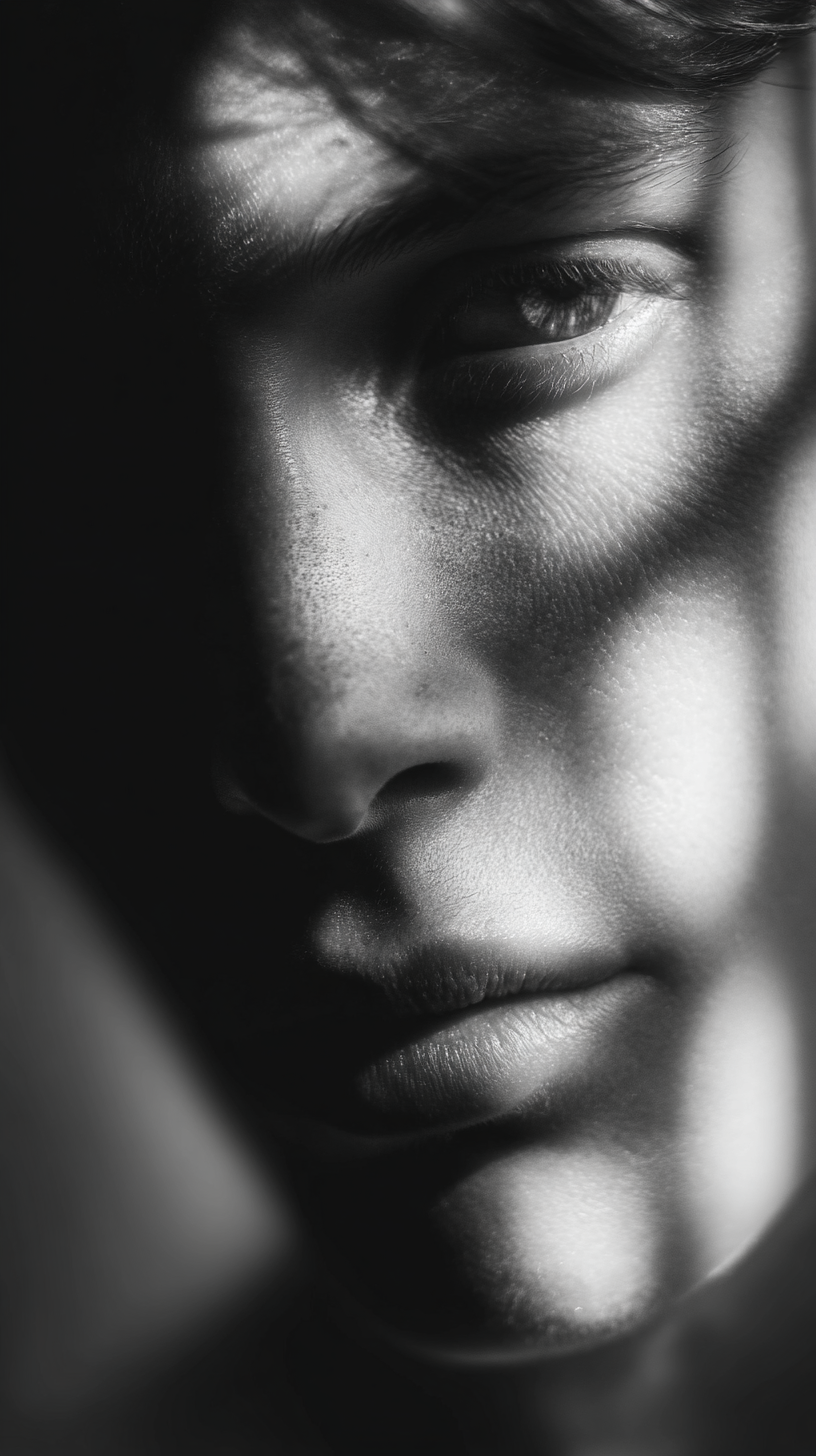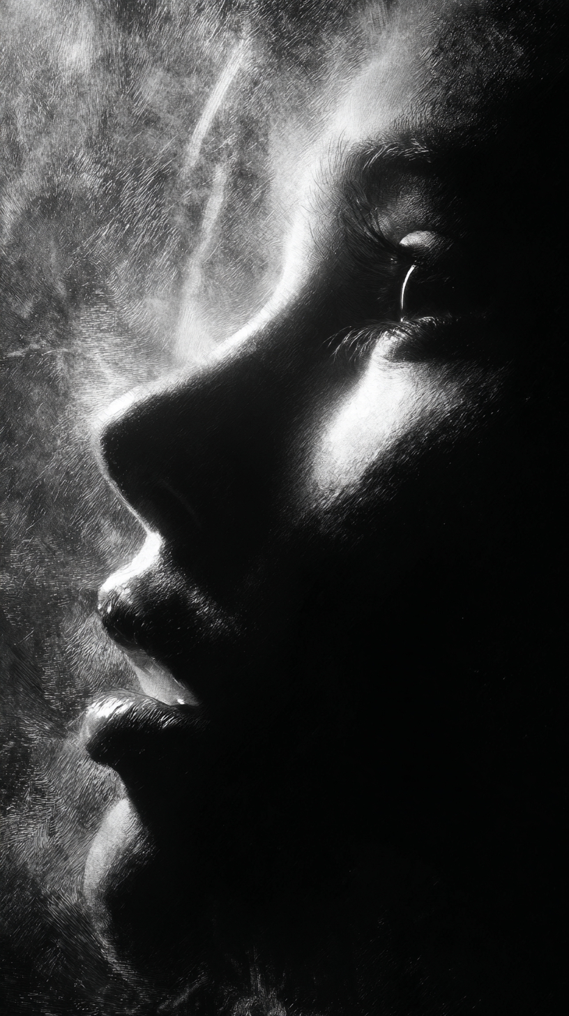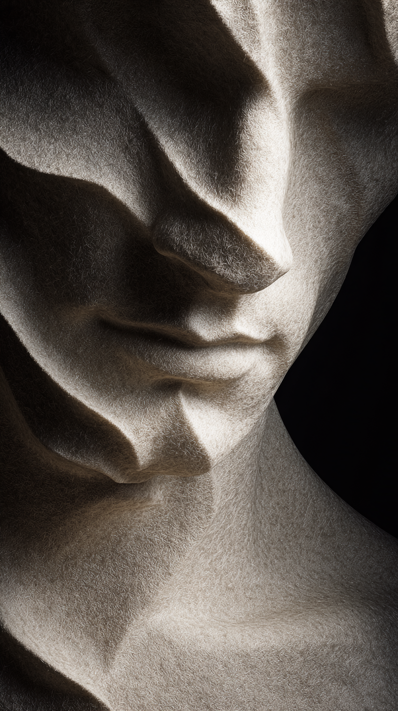 磨砂肌理,光影,强对比,极简构图,高级,创意,想象力,故事性 超现实主义,构图有画面张力,高级美感和模糊效果完美融合,浪漫主义 现代新锐 千姿百态 质感。无意识背景,留白,唯美,思考,意识流,大师笔触。人物脸部与静物交融特写