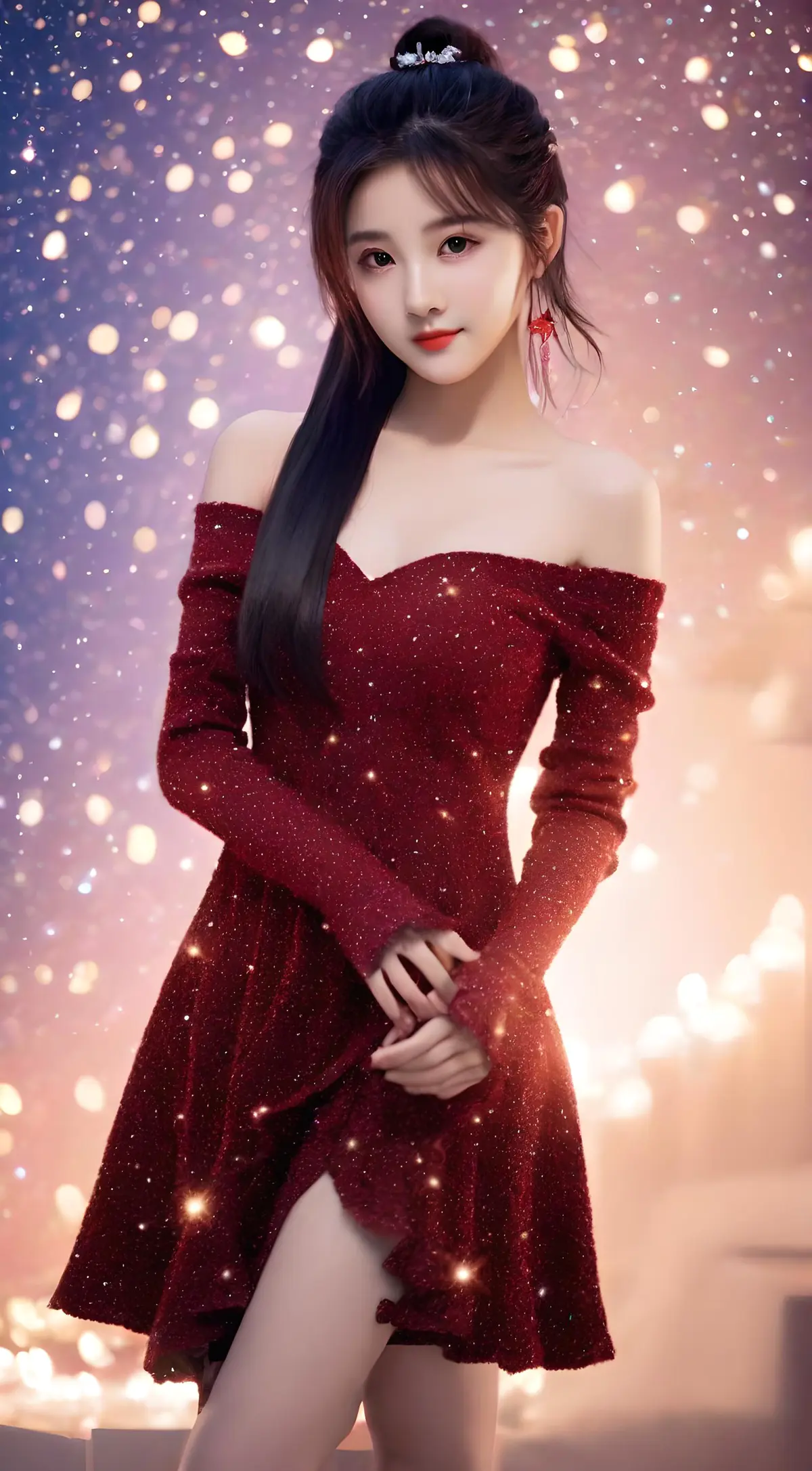 夜晚,星空,闪闪发光,大师作品,(全身照),(光洁修长的双腿),最好画质,极其详细,一位亚洲绝美女孩,长睫毛,大眼睛,超现实图片,白嫩的肌肤,面部焦点,脸部细节丰富,脸部补光,背景散光,完美的脸,高马尾,腕带,近景,(穿着针织露肩红色连衣裙,高跟靴,色彩缤纷有趣,情人节:1.5)微笑,快乐的微笑,甜美的气质,强烈的对比,详细的头发,七彩星空背景,闪闪发光,16k
