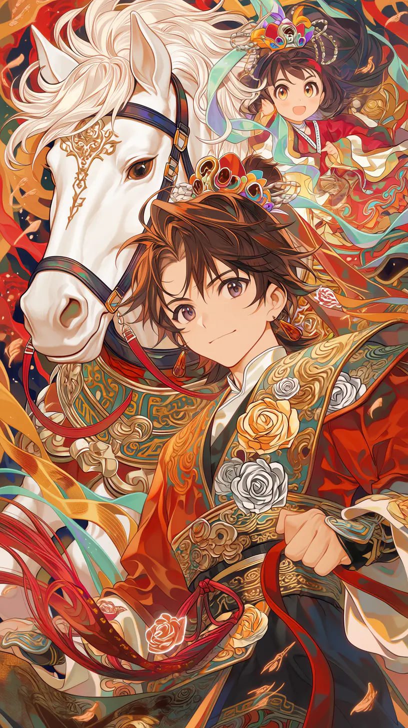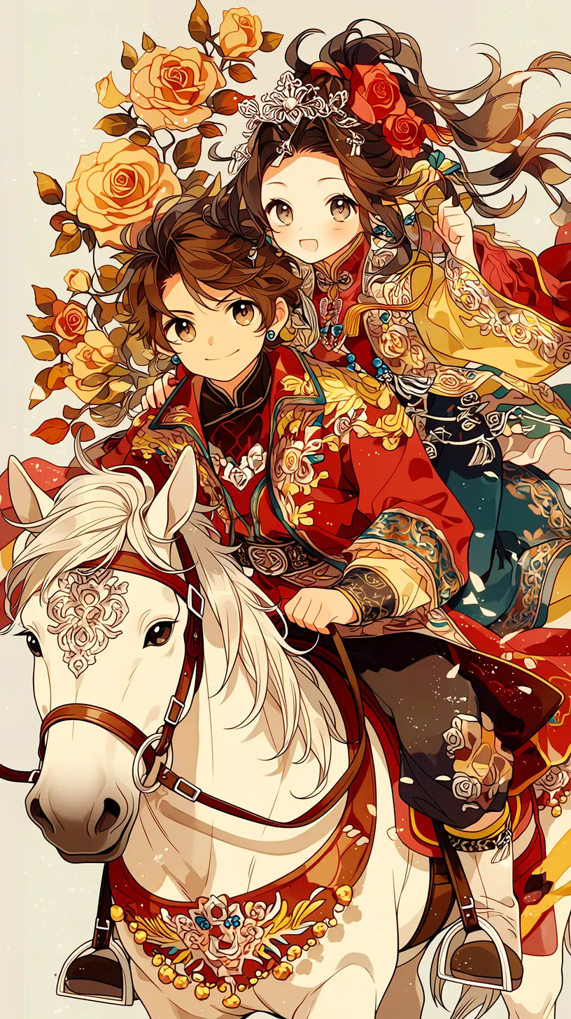 马年正月初八 做一个马上发发发的美少年 马全身做一更可爱又有趣滴中国古代美女身穿平面是(金色的玫瑰花花和银粉白玫瑰花图案的衣裙和全身银白色马马和)一位貌美如花的中国古装少女组成的马迎新年 图色彩艳丽多彩 动态有趣可爱 小萌马迎马年喜庆图美少女甜美可爱((删除敏感词不知敏感词请删除))不知那个词是敏感词请删除