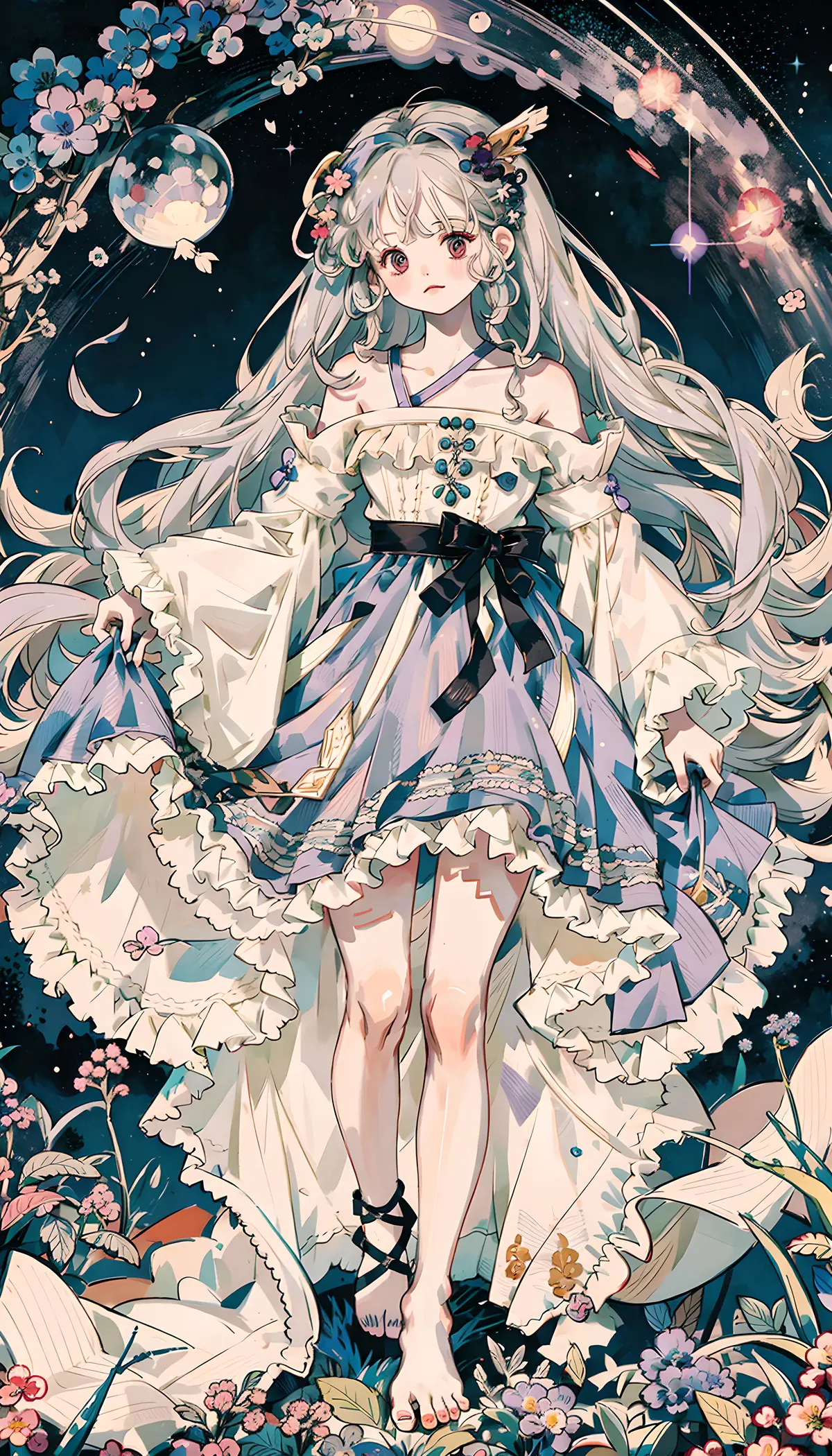 银发如月光织就的瀑布,在晚风里翻涌成浪。她赤着足站在紫色花野中央,裙摆被风掀起,像一片被星子吻过的薄纱,蕾丝花边在夜色里泛着珍珠般的柔光。 红瞳是两簇燃烧的星屑,凝望着高悬的月轮。那轮月浸在紫蓝色的天幕里,碎银般的光洒在她的发梢,让每一缕发丝都像在呼吸。身后的银河倾泻而下,星子如碎钻般嵌在深紫的绒布上,风卷着花瓣掠过她的肩颈,每一片都载着细碎的光。 她微微侧过脸,下颌线在月光下锋利又柔软,像一把被温柔包裹的刀。眼底的红芒里,映着整片星空的流转,仿佛她正与这无垠的夜对话,又像在等待某个从星河里走来的人。