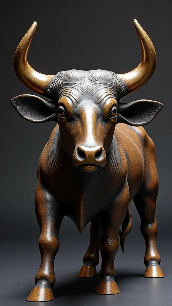 A bronze statue of a bull with horns and legs, featuring an intricate design. Plain white background that highlights the statue's details. Bronze with a warm brown hue, shiny finish. Sculpture photography.