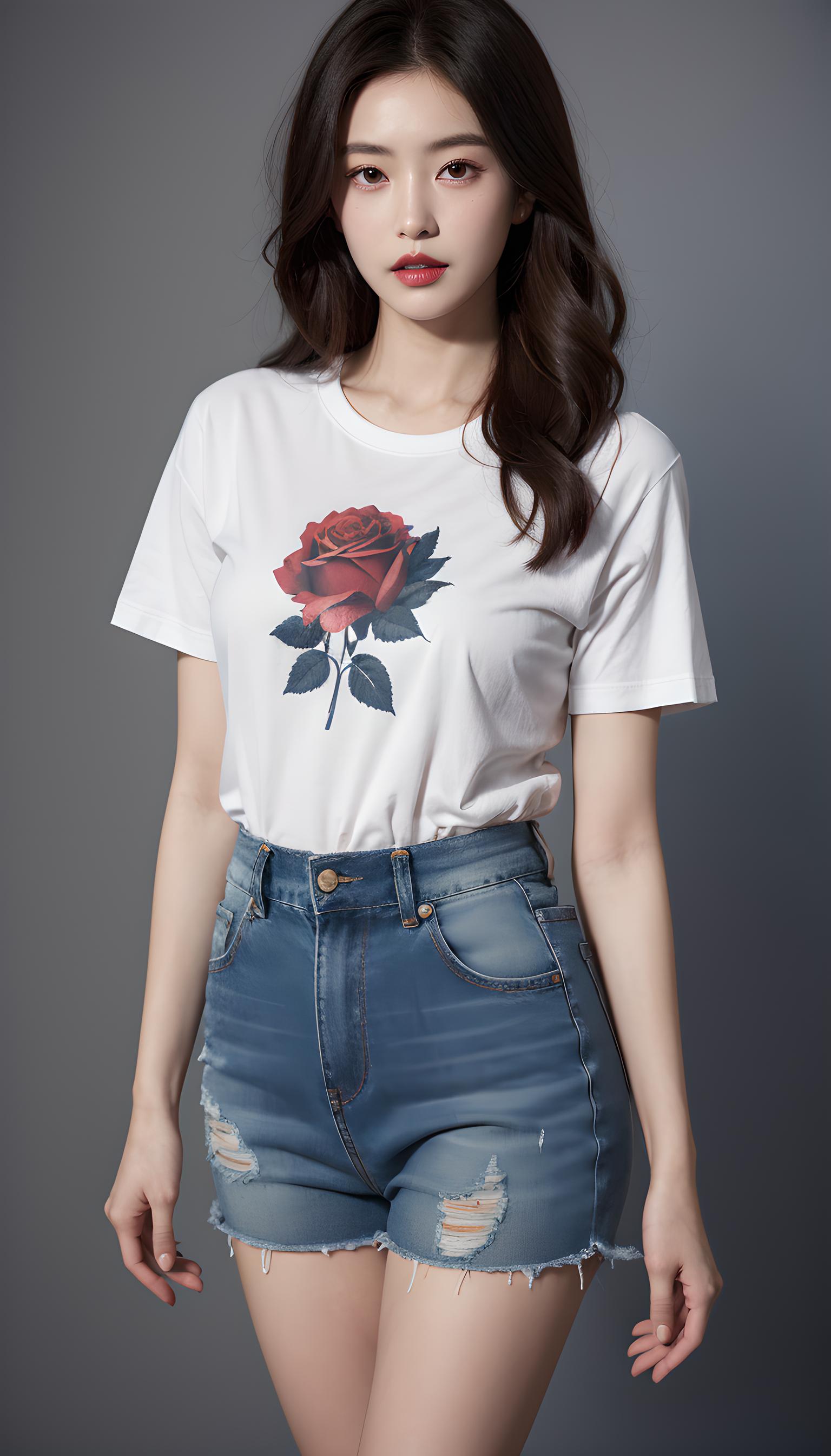 一位年轻的东亚女性,留着深棕色的大波浪卷发,妆容精致,唇色是温柔的豆沙红。她上身穿着一件印有卡通图案的白色短袖T恤,下身搭配一条浅蓝色的毛边牛仔背带短裙,整体风格清新又休闲。背景是简洁的深灰色,光线柔和,呈现出专业棚拍的质感,超写实,8K,细节丰富。
