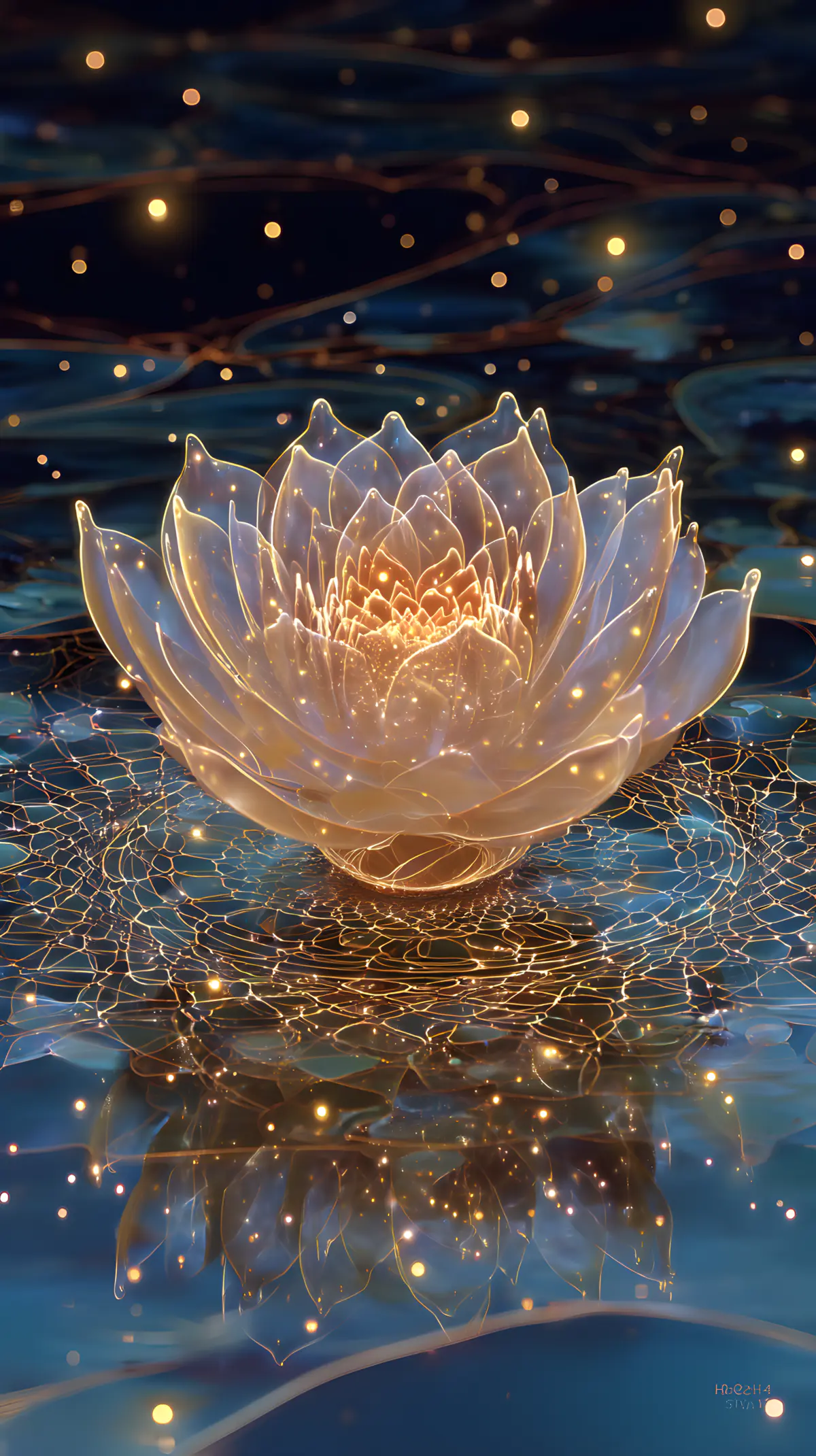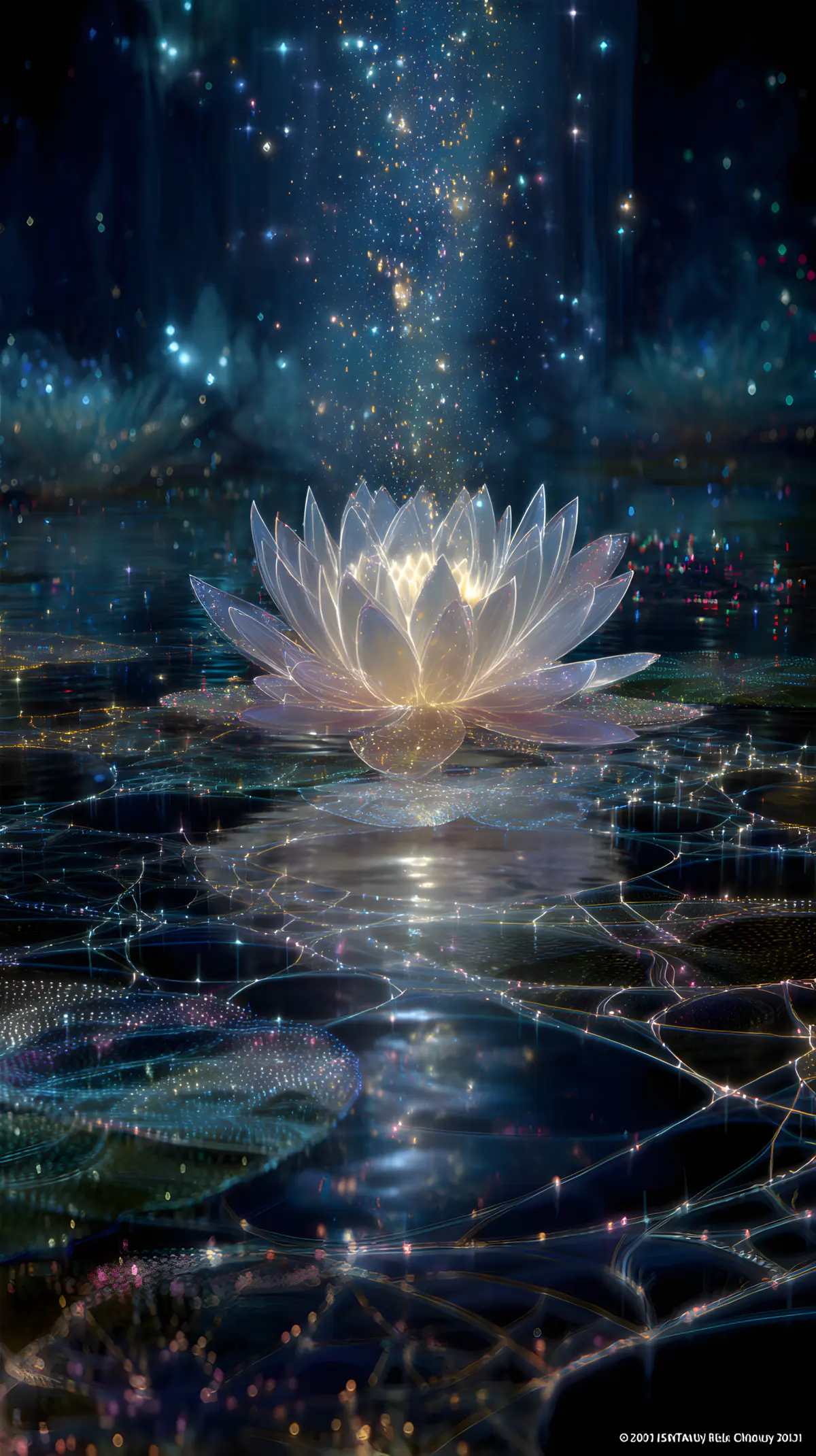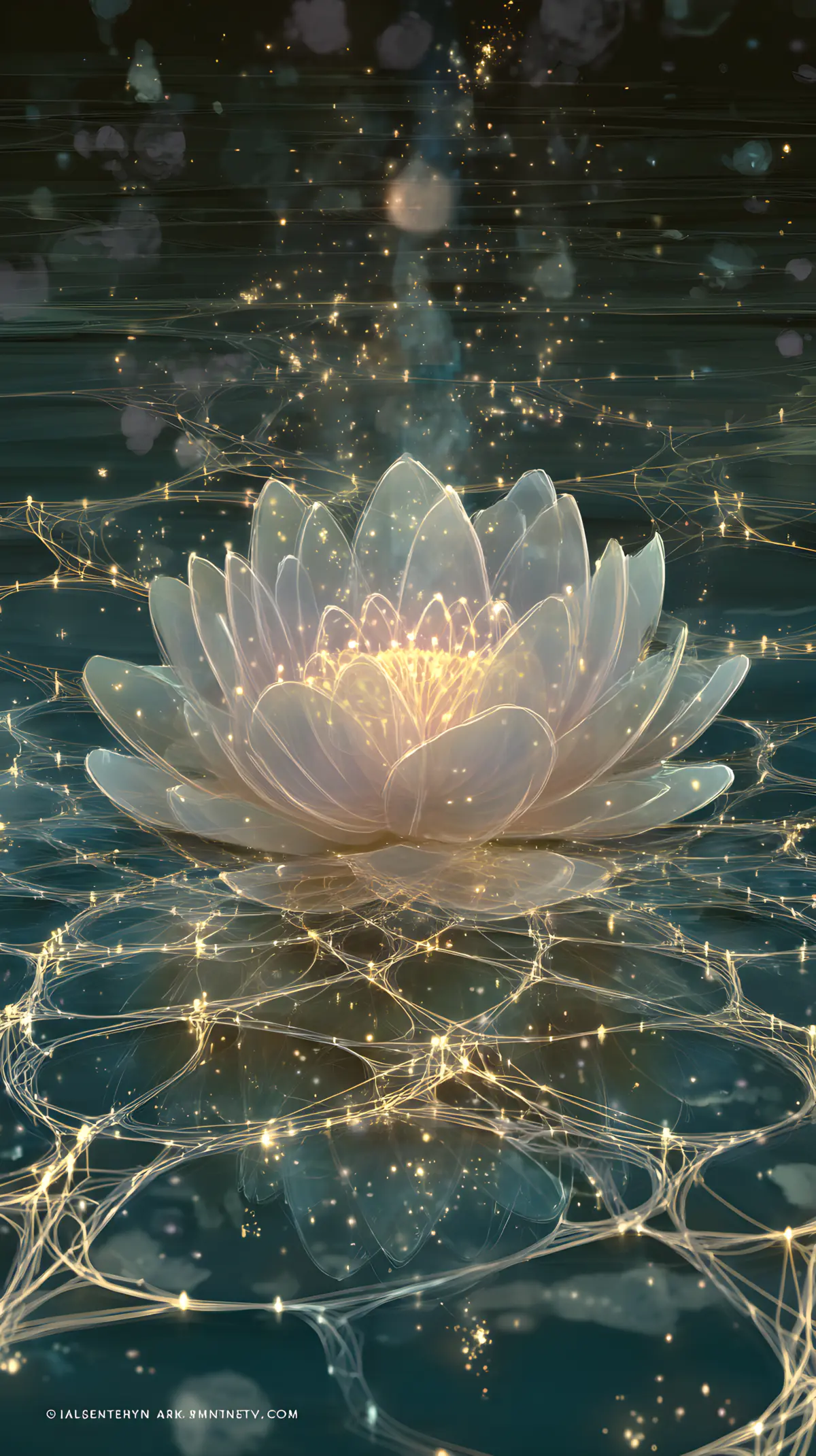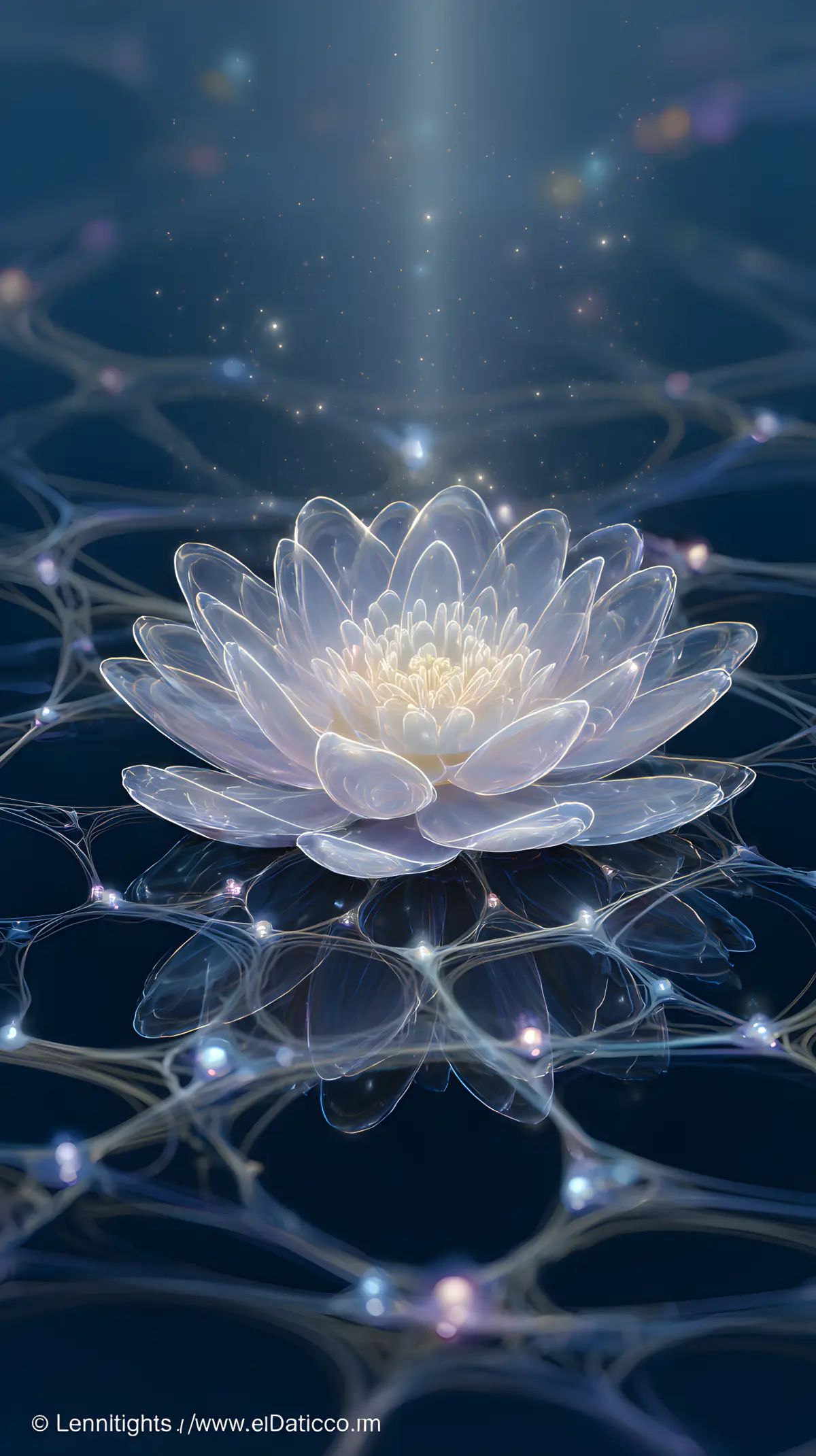 A transcendent digital painting depicts the Buddhist concept of "Emptiness" (Śūnyatā) and "Dependent Origination" (Pratītyasamutpāda), in the center, a luminous, semi- transparent lotus flower floats above a calm reflective water surface, its petals composed of interconnected, shimmering light threads. The surrounding network of glowing Indra's net