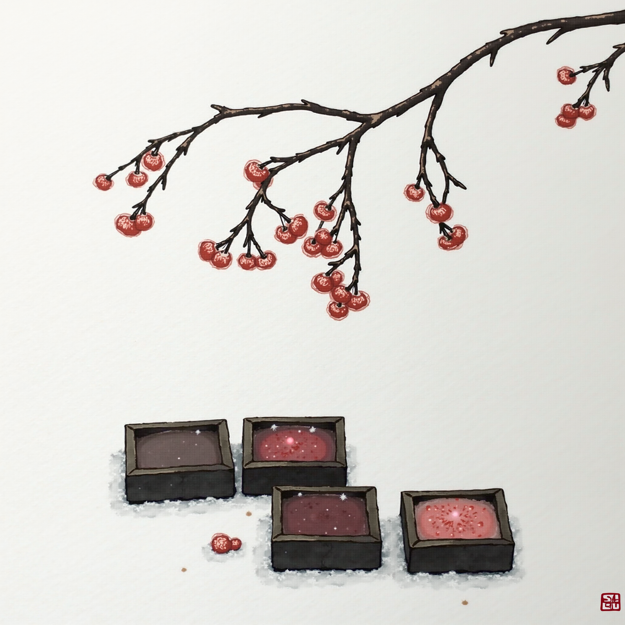 水墨梅花+雪景+国潮插画