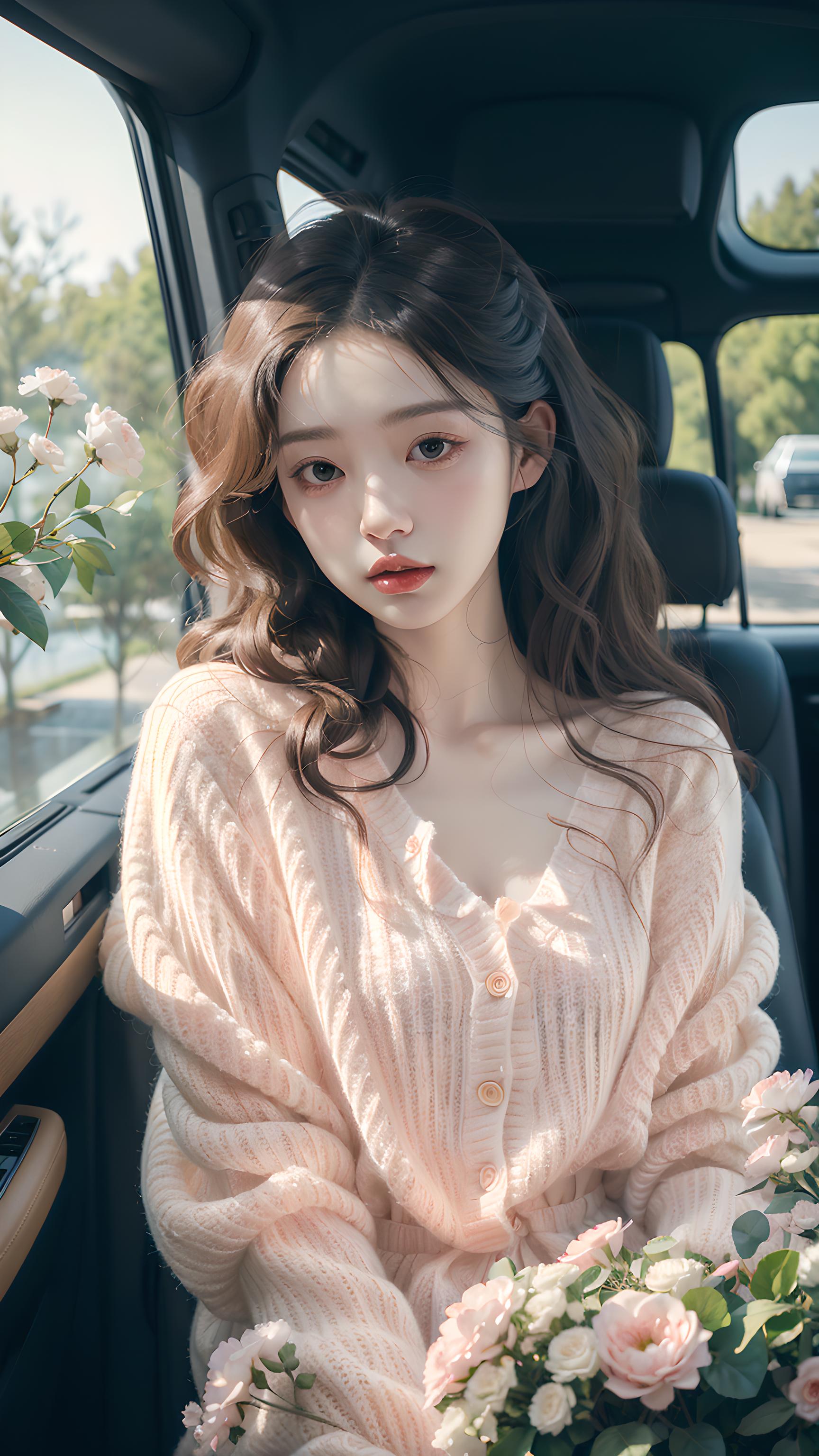 午后的金色阳光透过车窗洒在她的脸上和头发上