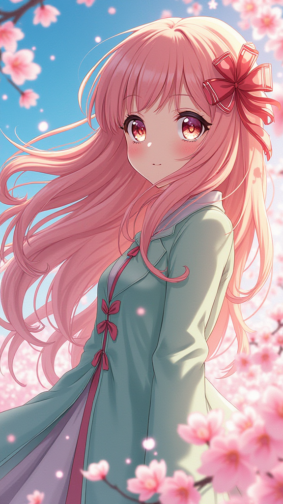 动漫海报,美丽的女孩,柔和的粉彩,飘逸的头发,闪烁的大眼睛,背景是樱花,春风,复杂的细节,魔法少女美学,鲜艳的色彩,杰作,最高质量,电影灯光,
