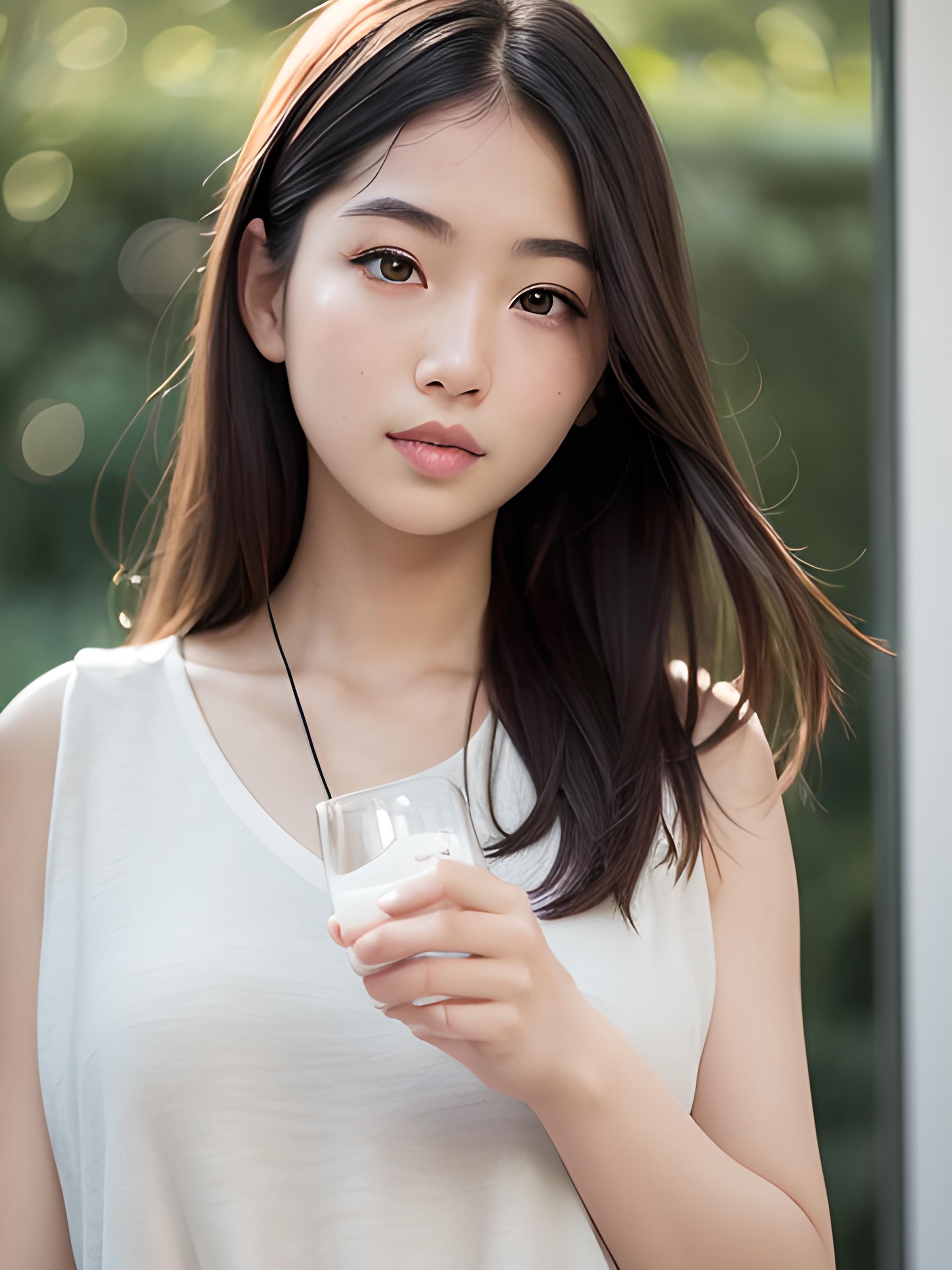 (1 beautiful young East Asian girl,20-26 years old,delicate face,oval face,bright almond eyes,light natural makeup,fair smooth skin,gentle temperament:1.3),long dark hair,middle parting,same face,consistent facial features,identical face:1.5,casual loose clothing,simple cotton top,relaxed trousers,varied daily outfits,natural simple style,clean and modest. Holding transparent glass cup correctly,perfect hands,clear fingers,no deformation,realistic hand structure. (full body shot:0.7),(medium half body shot:0.3),random clean daily background,soft natural light,realistic photo,high-quality portrait,ultra-realistic,8K,high detail,sharp focus,eye level,fixed lens,shallow depth of field,clean composition,elegant simple style,professional DSLR,same person,consistent portrait.