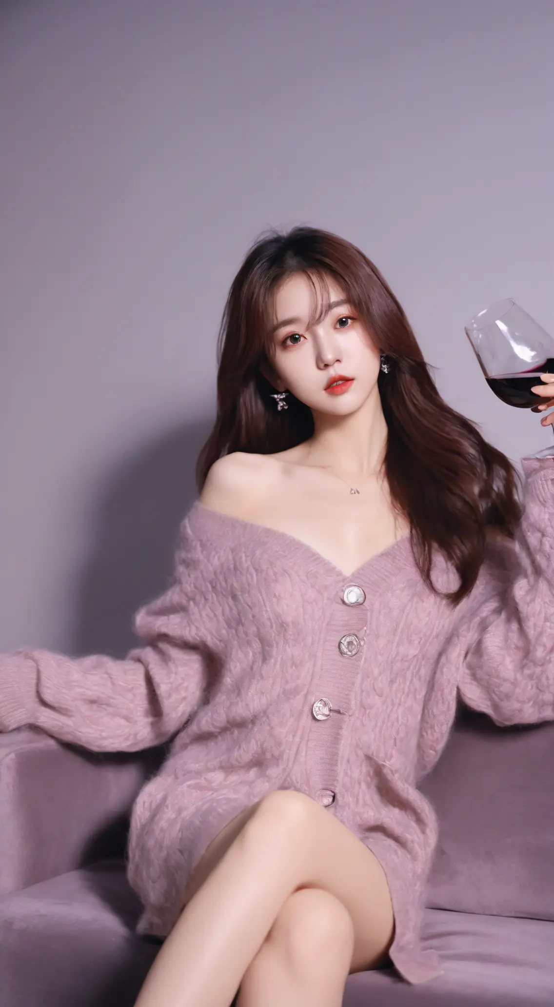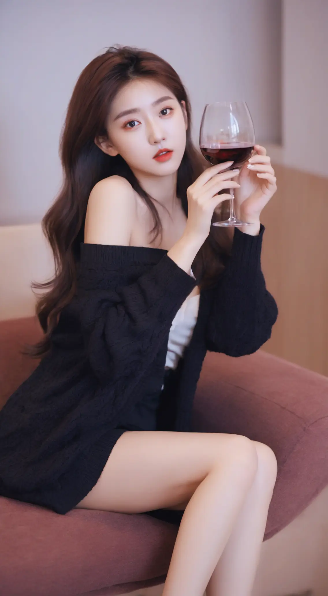 (超高清8k分辨率)大师作品,一个稚嫩可爱的少女,高细节,超高分辨率,彩色清澈眼眸,顺滑的头发,精致完美的五官,最美的大眼睛,长长的睫毛,眼睛甜美有卧蚕,微笑,动态角度,,极致画质,高细节,最高精度,精确完美的人体结构,长发,空姐,优雅的坐姿,棕色沙发,手持红酒杯,旁边随机搭配桌子,露肩的衣服,短裙,随机的动作,环境随机搭配,发气轻飘,随机拍摄角度,迷人的眼神,黑色高跟鞋,嘴唇水润,长袖,针织开衫,(监视),高冷,黑丝御姐风格,(清纯唯美 ) 。 整体人物塑造完整无瑕疵