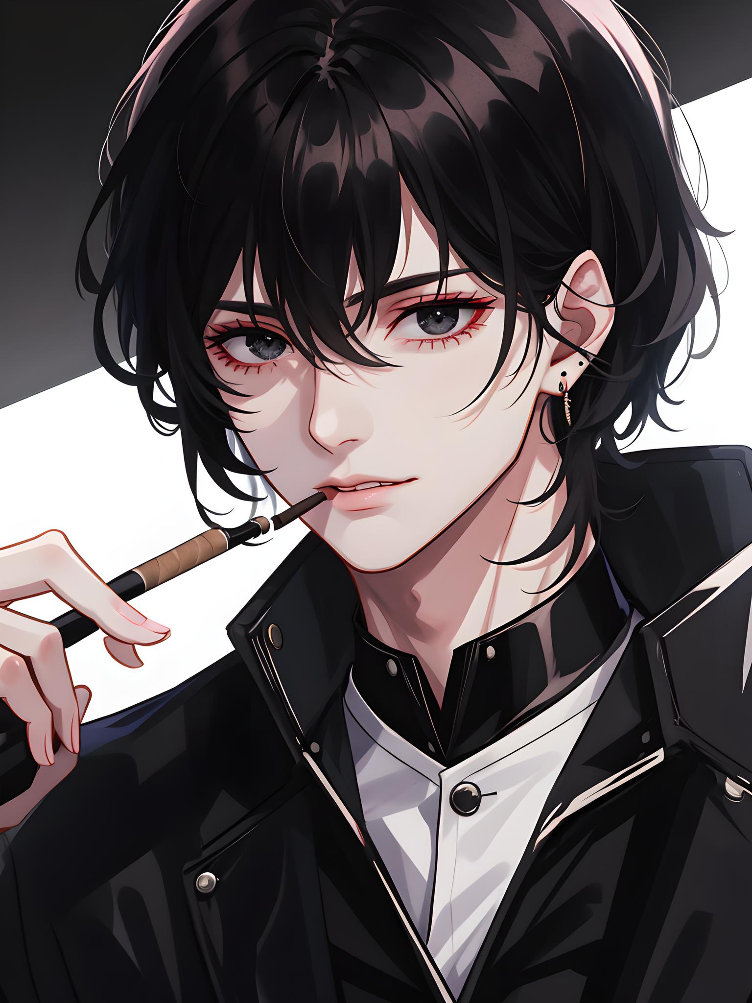 黑发黑瞳,眼尾微微上挑,自带一种漫不经心的锐利。鼻梁高挺,唇色偏淡,下颌线清晰冷硬。常穿剪裁精良的黑色高定西装,袖口永远一丝不苟地扣好,指尖偶尔夹着一支未点燃的雪茄。皮肤是冷调的白,在灯光下泛着瓷釉般的光泽,左耳戴着一枚低调的黑曜石耳钉。