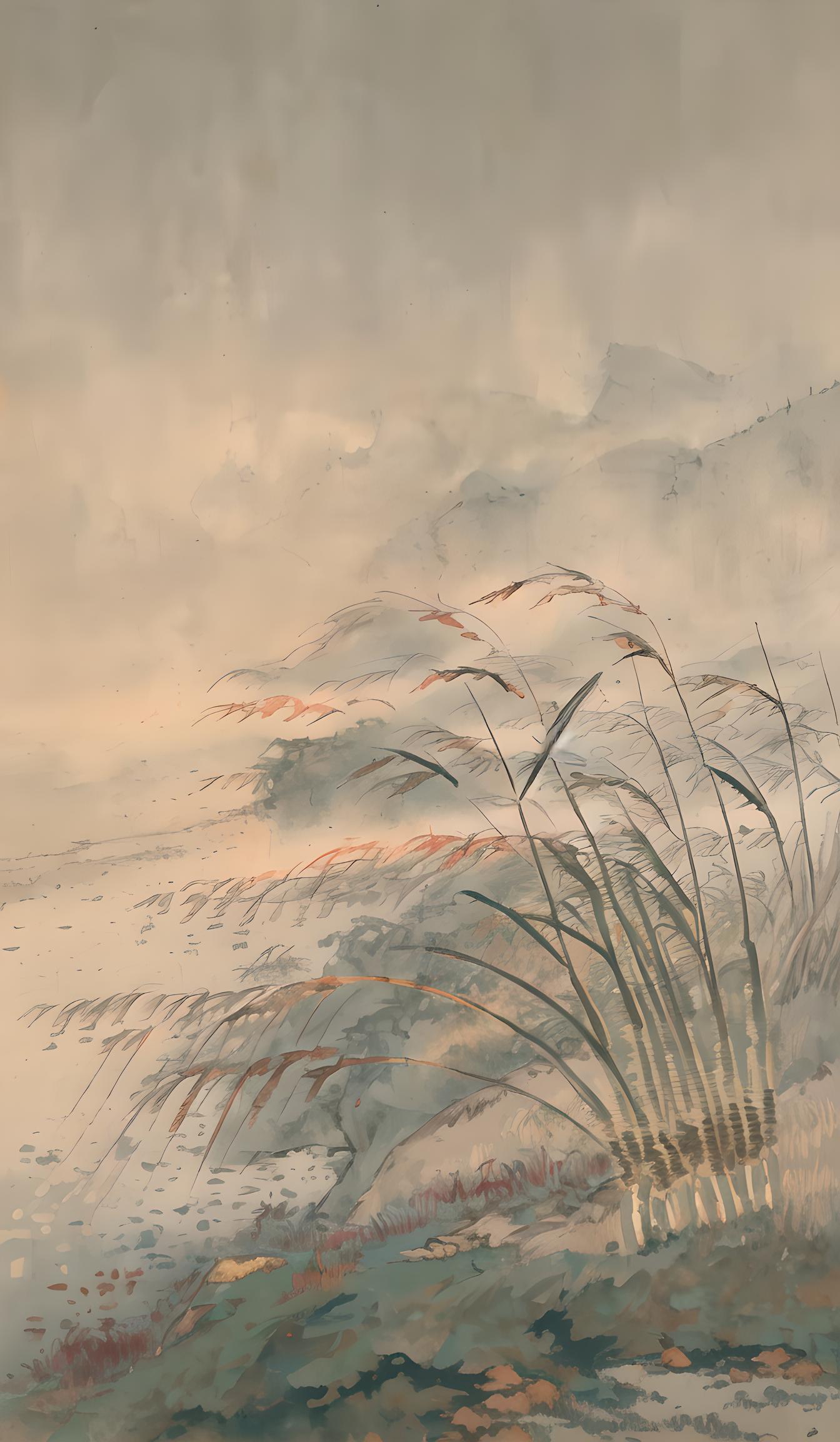 近景一处芦苇荡,(((很多随风飘动的芦苇草))),一片湖水,秋意浓,秋风凉,(((很多芦苇草在水面上随风摇曳))),水面烟波渺渺,远处雾山,松林,若隐若现。画面古朴自然,返本归真 ,(((no_人类,)))(((加盖印章))),黄色复古画纸,(((纸本设色))).