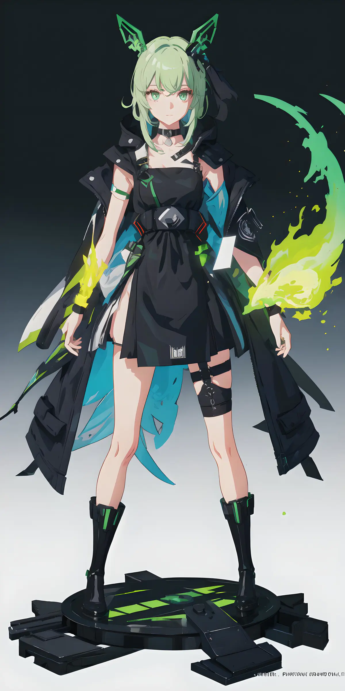 - 鞋子:黑色的短靴,靴口和鞋底点缀着荧光绿,与整体配色呼应。