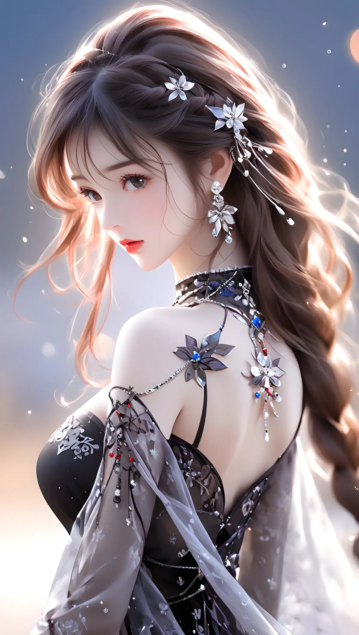 风之出品,绝美少女,高清写真,高分辨率,Traces of the wind,(Produced by Wind Traces)精致细节,一个高颜值美女,棕色头发,精致的五官,高清晰画质。透明银色冰丝质感挂脖露背超短连衣裙,镂空,蕾丝。迷人,风情万种,美女。透明银色丝绸面料,背光,华丽的氛围,高端感,高分辨率,高细节。近景,凸起,绝美感。
