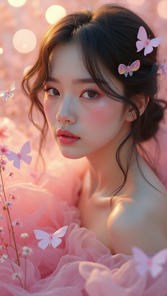 甜欲少女,精致无瑕妆容,马卡龙渐变纱裙,花海仙境,蝴蝶环绕,柔光滤镜,通透玻璃瞳,梦幻光斑,奶油质感,高清细节,甜美治愈