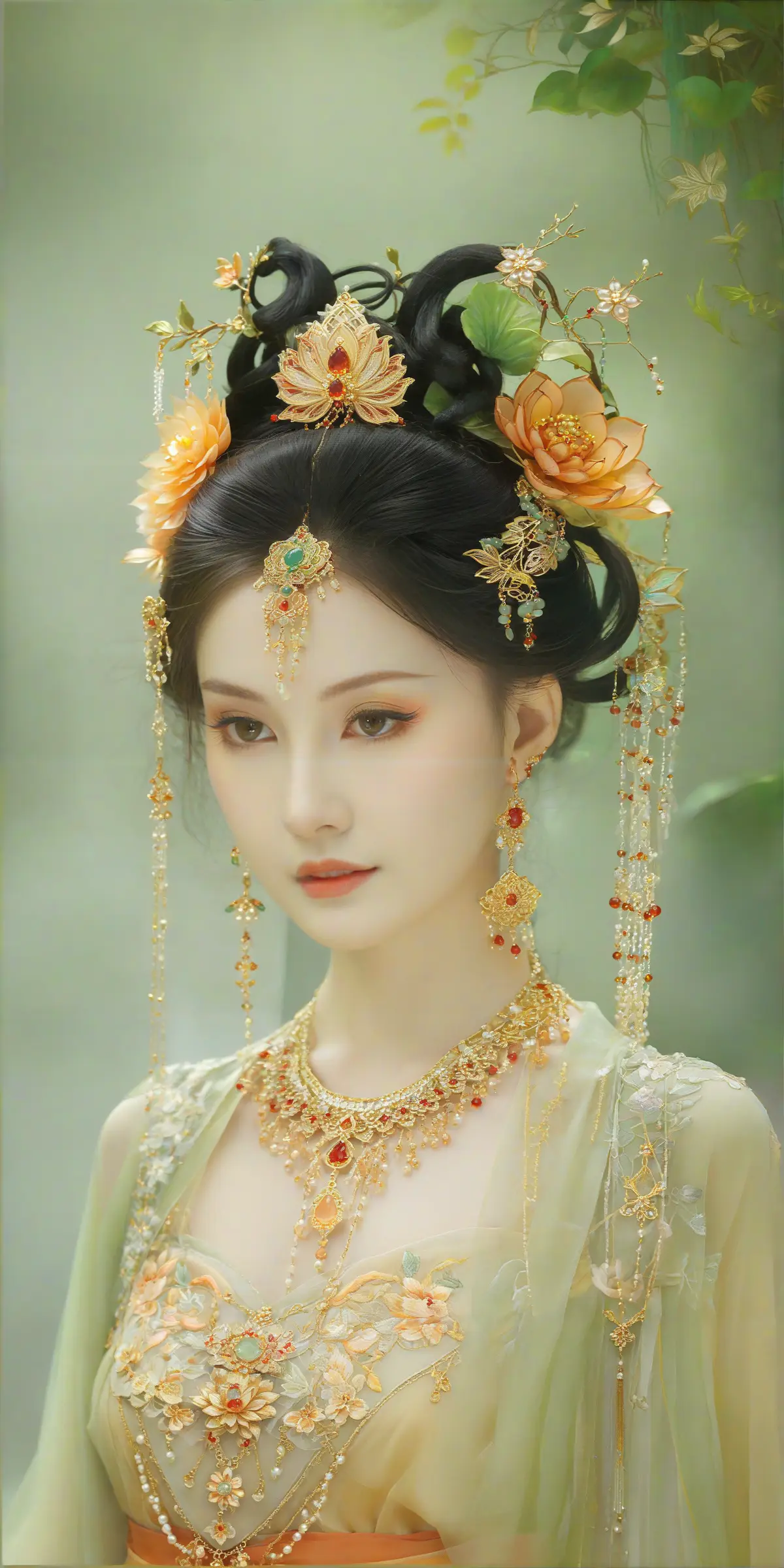 额间一点朱砂花钿,衬得眼尾上挑的弧度更显凌厉,长睫垂落时,掩去了眸底翻涌的算计与凉薄。她身着粉橙交织的宫装,金线绣就的缠枝莲纹爬满衣料,领口斜斜裁开,露出锁骨处精致的璎珞,每一颗宝石都在烛火下流转着惑人的光。