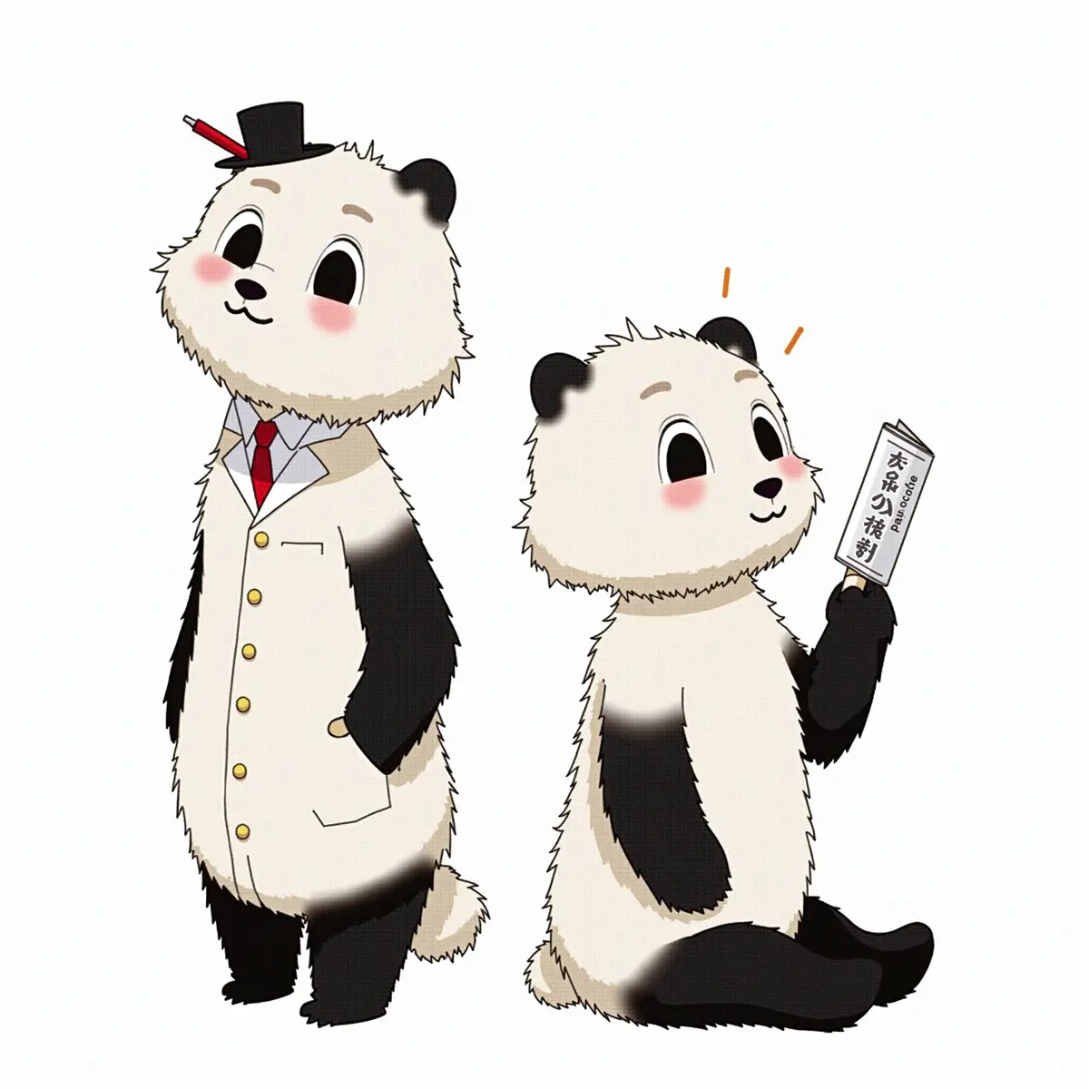 两只拟人化原创卡通小熊猫,第一只(橙棕色,戴高顶礼帽,穿黑色西装,红领带,手持红钢笔,手插口袋,稳重微笑),第二只(浅棕色,歪头眯眼,吐舌头,呆傻表情,抱一本民法典,领带歪掉,一只脚踮起,憨态可掬),国漫卡通风格,全新原创设计,无版权,搞笑可爱,Q版,双足站立,明亮色彩,粗线条,纯色背景,和第一张图风格完全一致,高清,8K