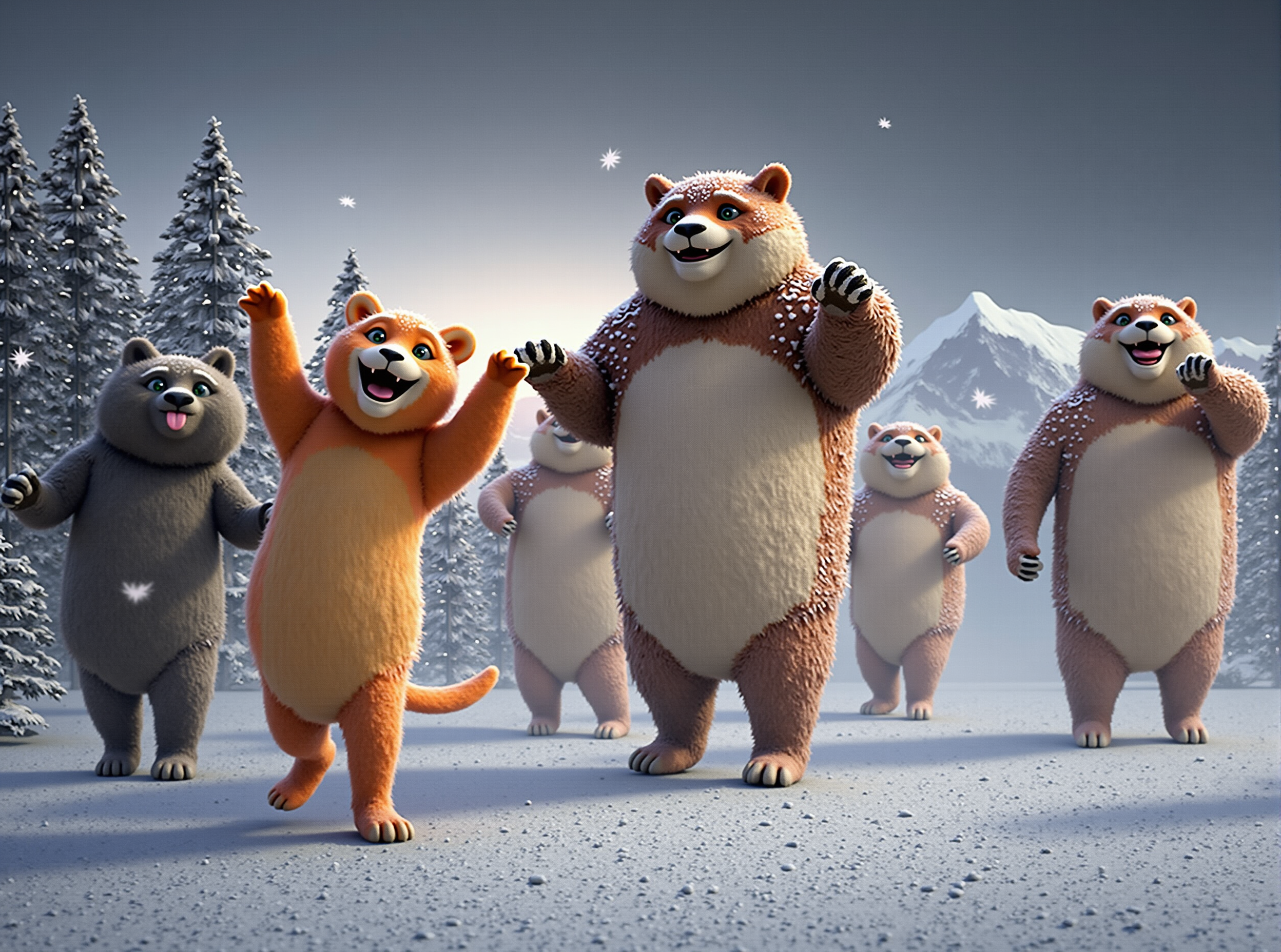 8K, 超写实, 电影质感, 四只动物穿着服饰的(美洲黑熊、胖橘猫、大熊猫、东北虎)在雪山森林中直立跳舞, 胖橘猫高举双臂领舞, 其他动物跟随摆出同步舞蹈姿势, 动物毛发细节丰富, 身上落着薄雪, 表情生动, 背景是积雪覆盖的山脉和茂密的常绿树, 柔和阴天, 自然柔和光线, 浅景深, 富有电影感的构图