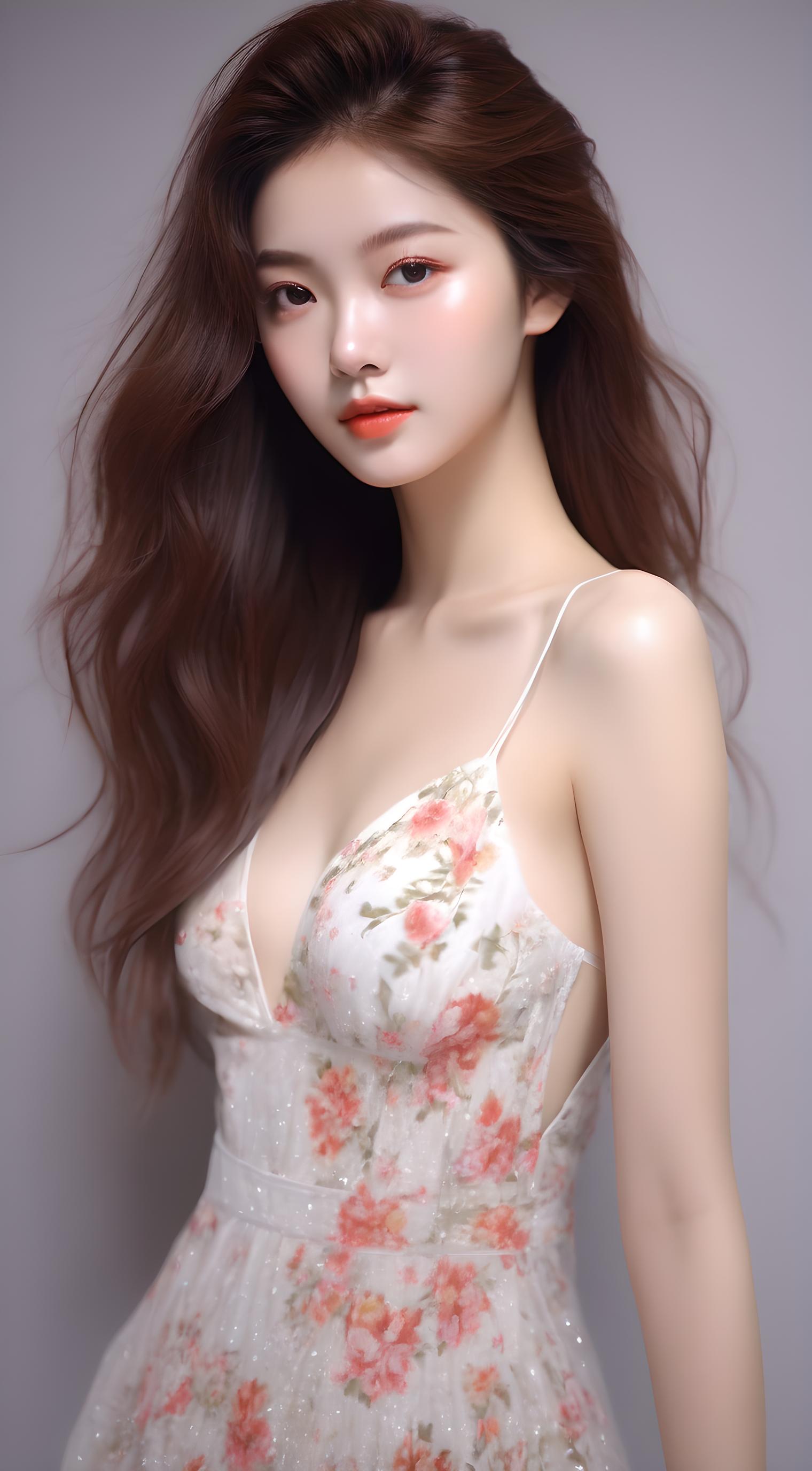 现代时尚, 极度诱人的少女,精致漂亮的女孩,精致的五官,肖像,8K画质,极致细节,细节刻画,凌乱披散的头发,棕色长发,头发过肩,飘逸的发丝,瘦脸,完美比例身材,腰臀比,苗条的身材,盛世美颜,绝世美女,超高分辨率,大师作品,真实质感,电影照明真实感,面部特征,水嫩的嘴唇,((纯欲的妆容)),清纯女孩,初恋,情窦初开,害羞,脸红,腮红,羞涩,卖萌的表情,侧脸镜头,甜美笑,look at the viewer,((渐变碎花睡裙)),在卧室,超级美女,(侧身站姿)绝美容颜,点点星光,熠熠星光,美艳动人